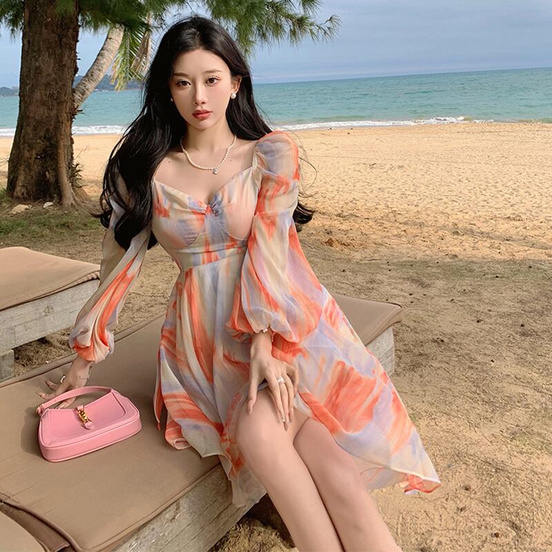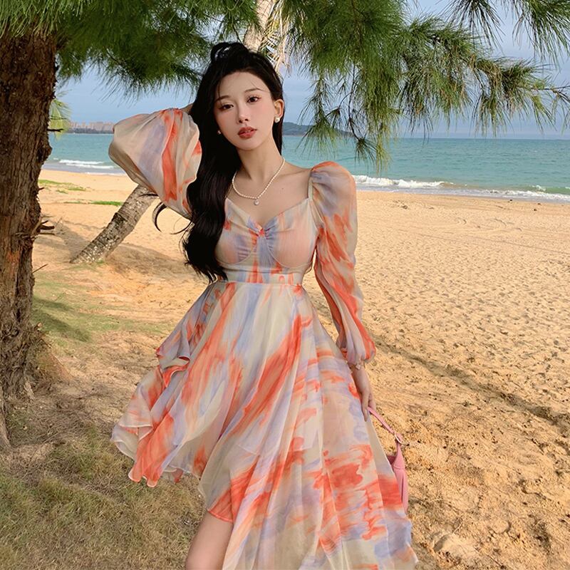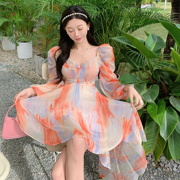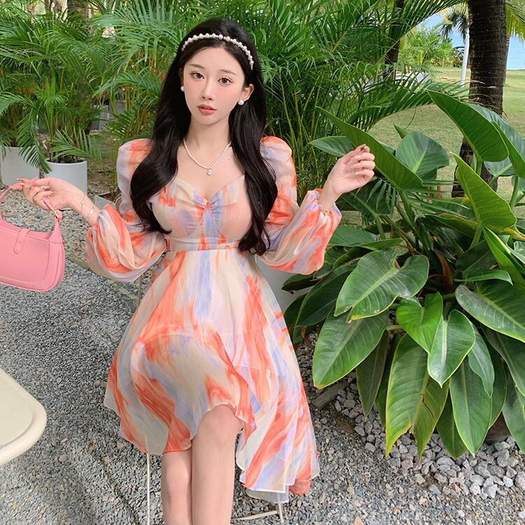 ワンピース スウィート シフォン Aライン 谷間を出す 不規則カラー オレンジ S M L XL