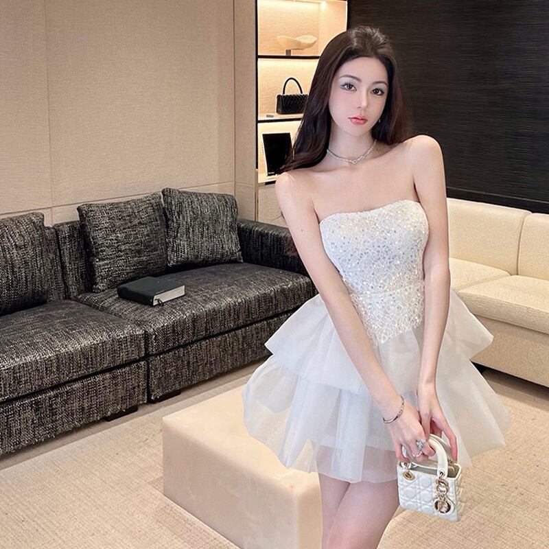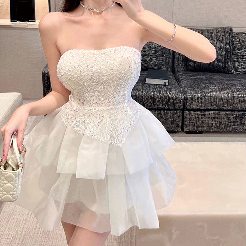 ワンピース セクシー チューブ パプラム ティアード Aライン スパンコール一 切り替え ホワイト S M L