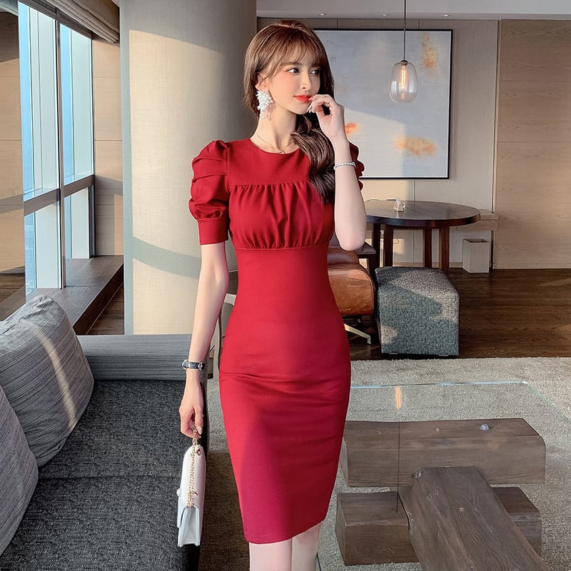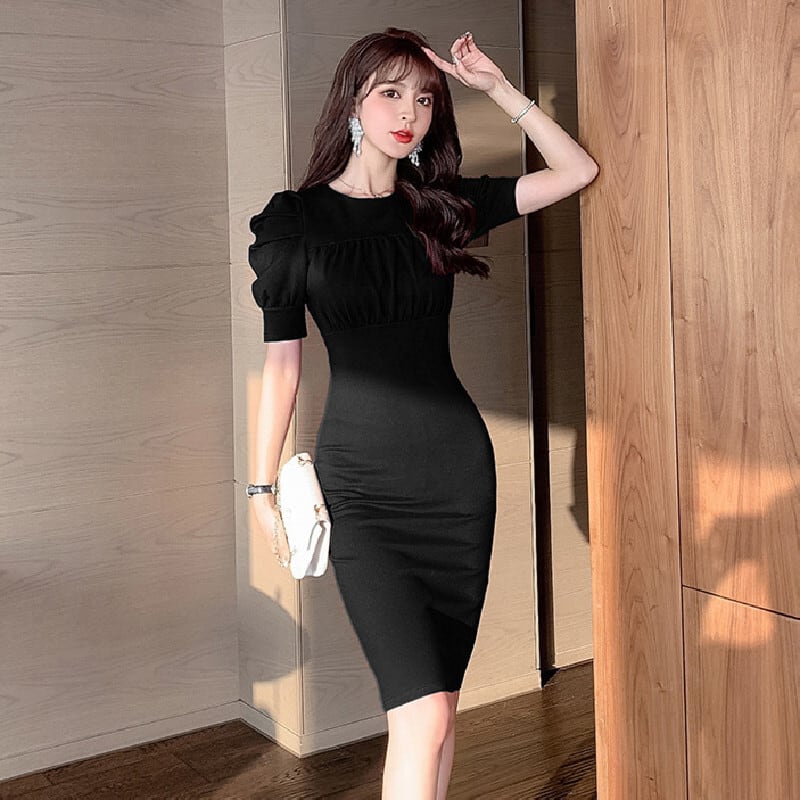 【夕暮薔薇シリーズ】ワンピース 3色展開 ラウンドネック 黒 タイトワンピース ホワイト ブラック ワインレッド S M L XL