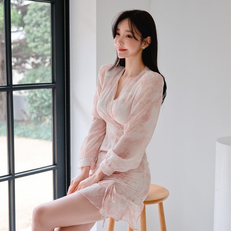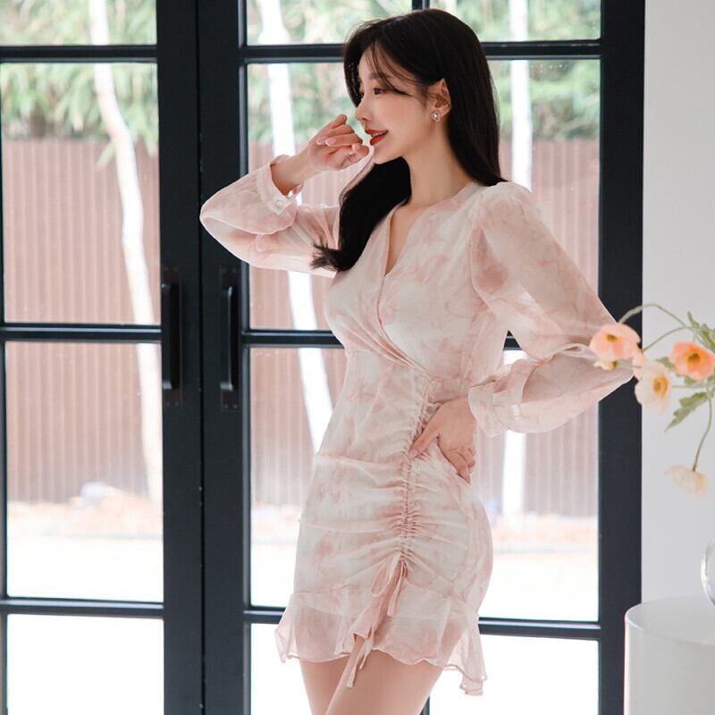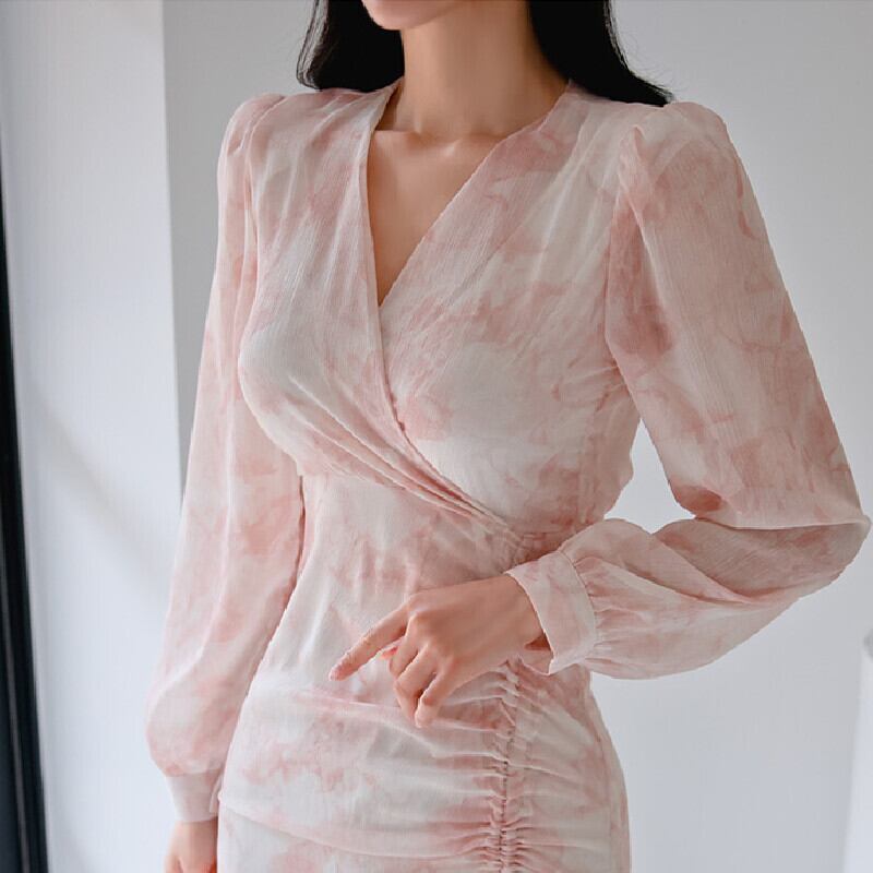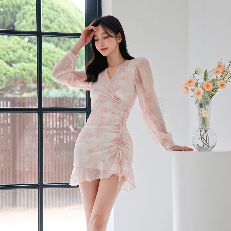ワンピース ペプラム Vネック スウィート ハイウエスト プリント S M L XL