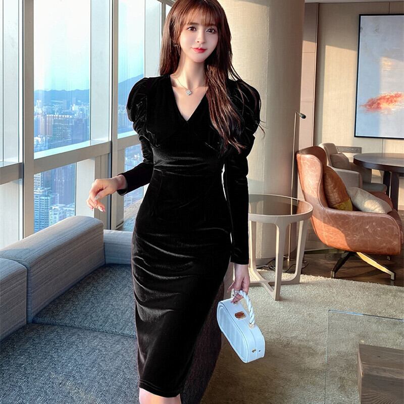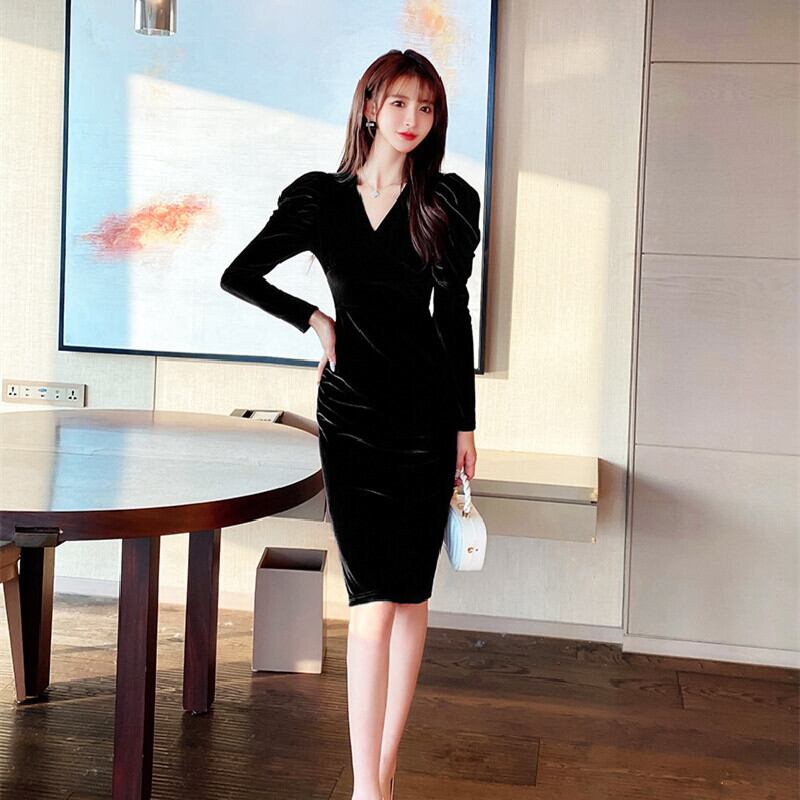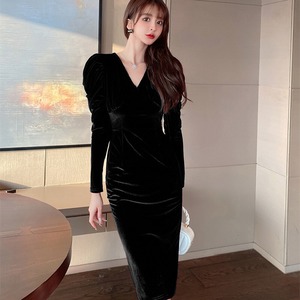 【夕暮薔薇シリーズ】ワンピース 2色展開 ビロード Vネック 肩パフ 長袖 ブラック ワインレッド S M L XL