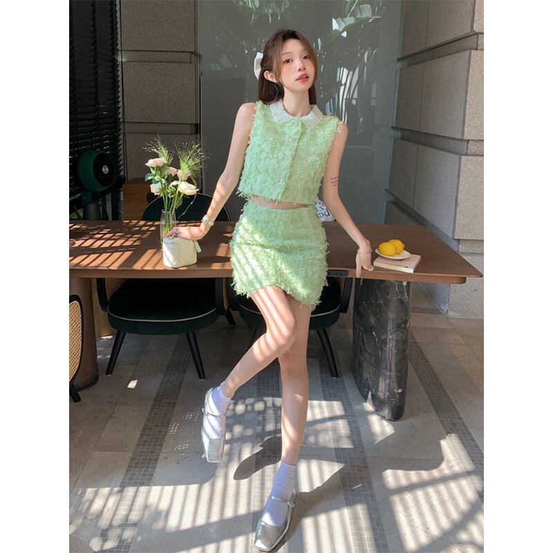 セットアップ OL/通勤 スウィート ガーリー ノースリーブ 文芸風 トップス+スカート グリーン S M