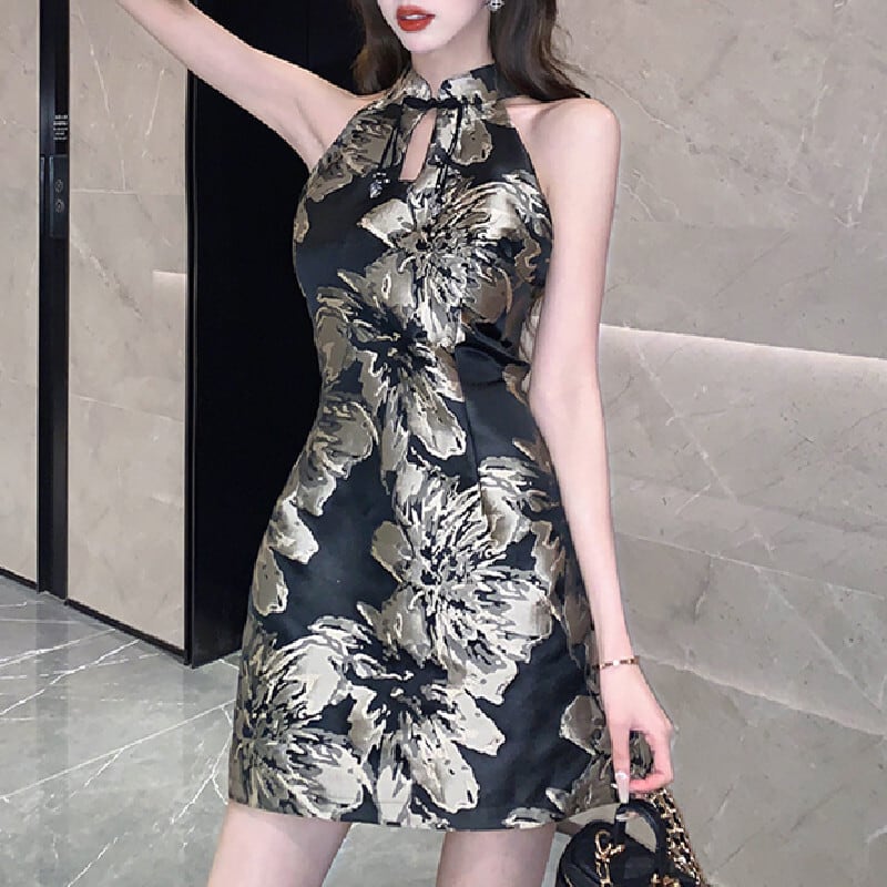 【CHERRYシリーズ】ワンピース ノースリーブ 花模様 膝上 黒 チャイナ風 ブラック S M L XL