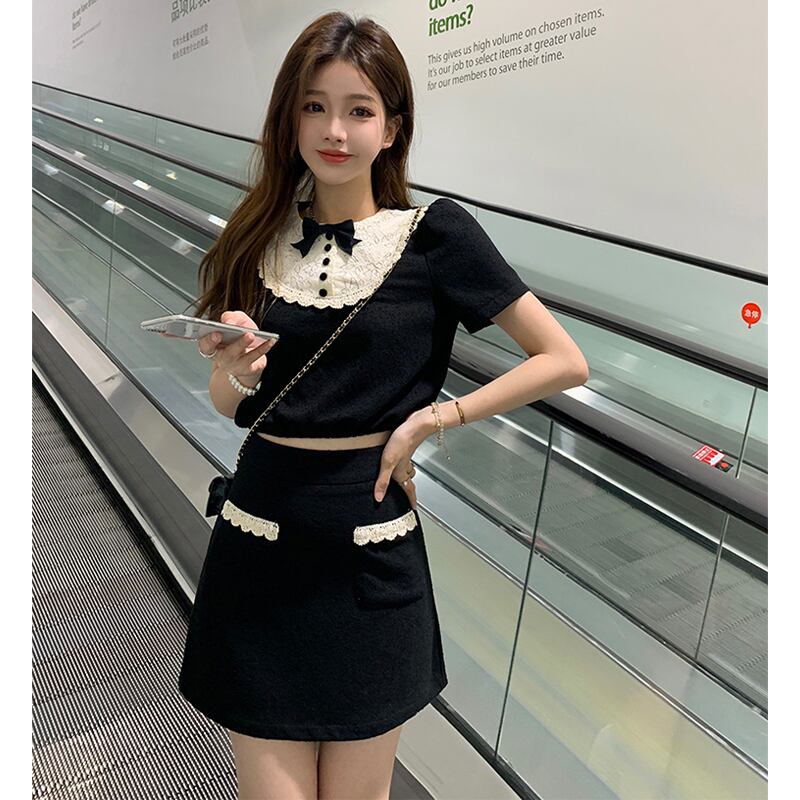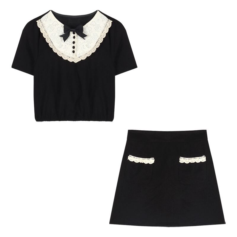 セットアップ 学園風 かわいい レース 蝶結び ボウタイ トップス+スカート ブラック S M L