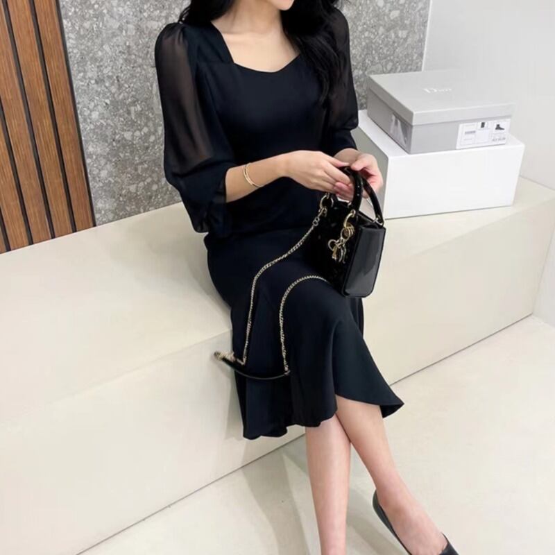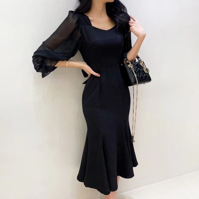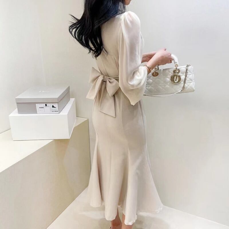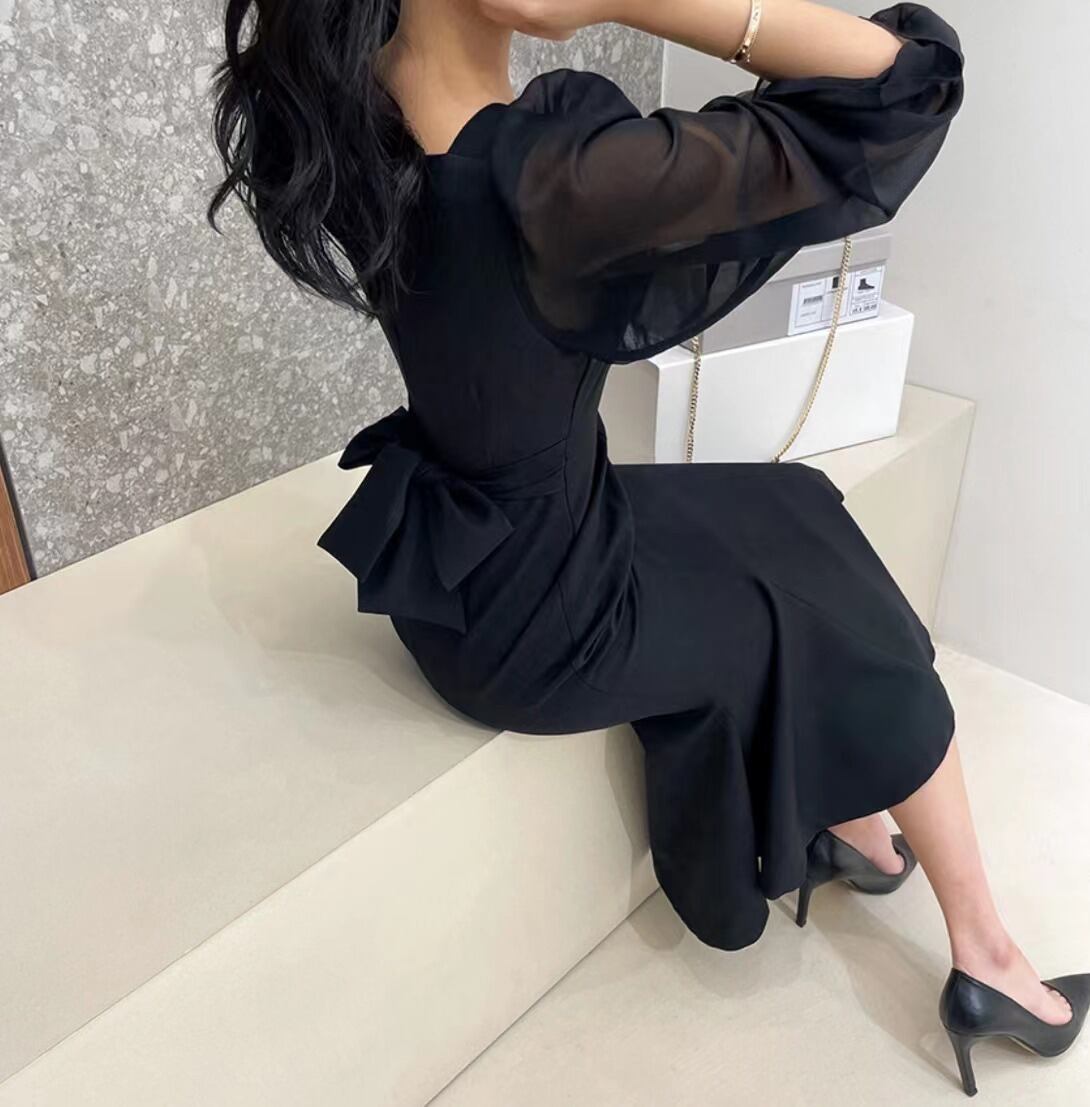 ワンピース 2色展開 スクエアネック バックリボン エレガント フィッシュテール ブラック ベージュ