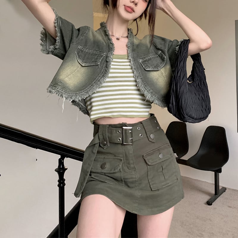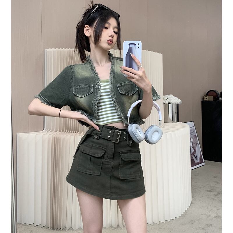 セットアップ セクシー デニム ネオギャル ベルト付き アウター+スカート グリーン S M