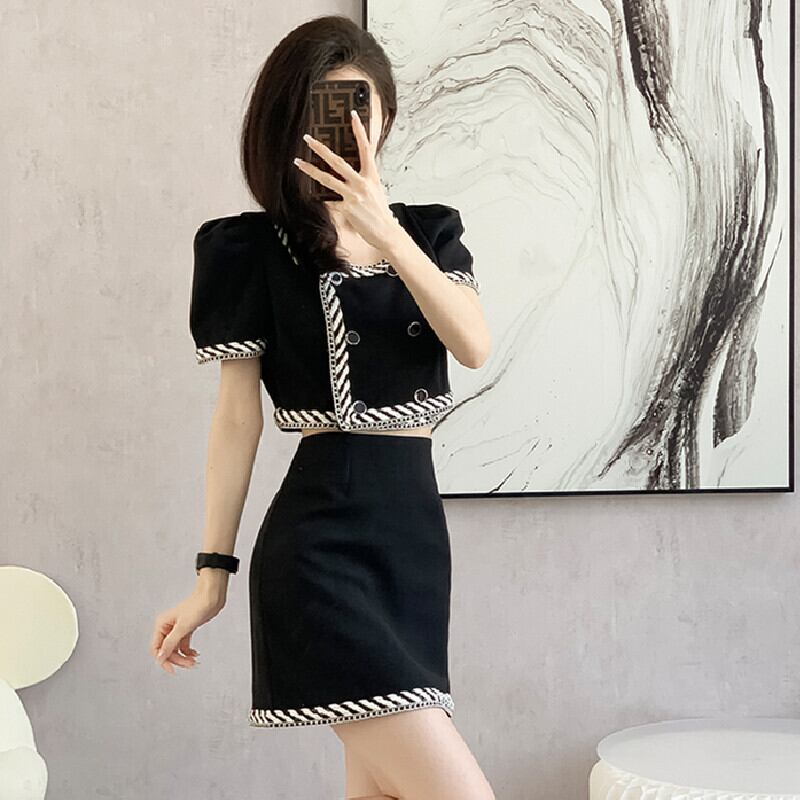 セットアップトップス+スカート 肩パフ 黒 スクエアネック 気質溢れる ブラック S M L XL 2XL