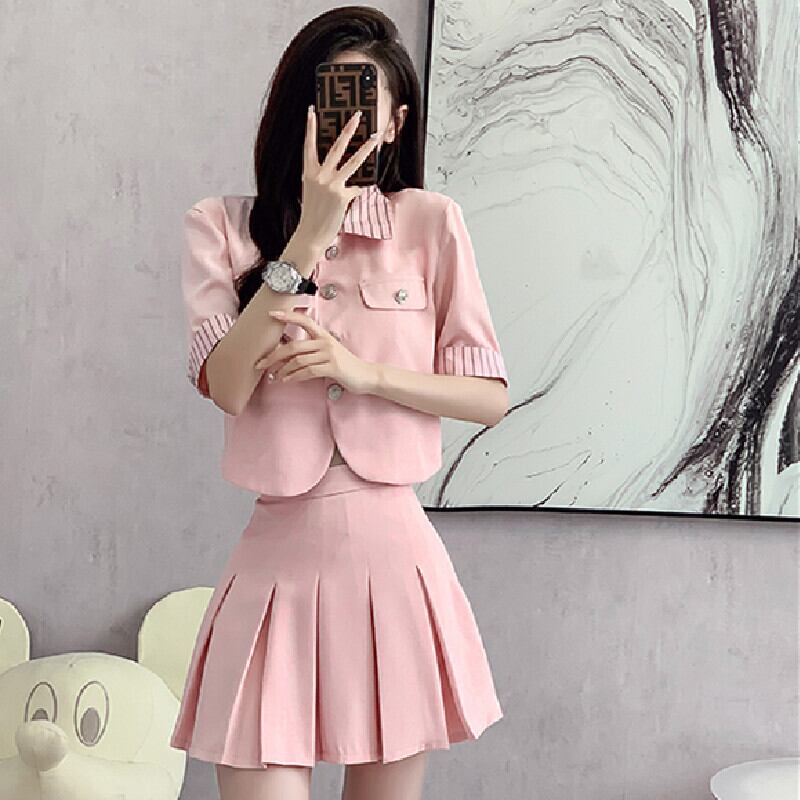 セットアップトップス+スカート 3色展開 ストライプ柄 大きいサイズ ピンク ホワイト ブラック S M L XL 2XL