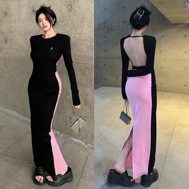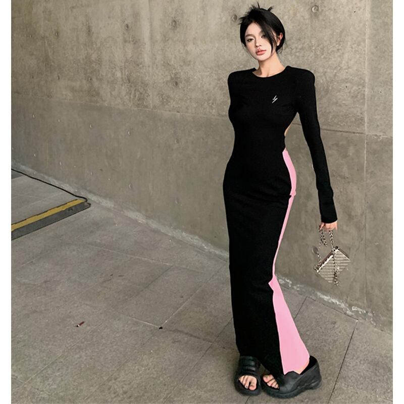 ワンピース セクシー 切り替え 配色 背見せ 長袖 ロング丈 ブラック+ピンク S M L