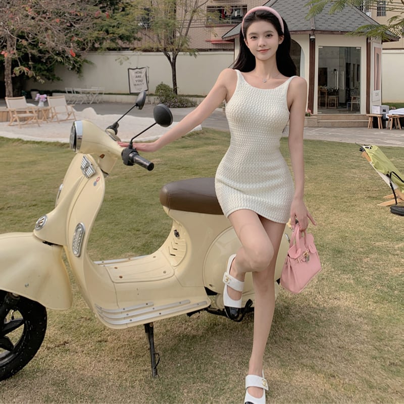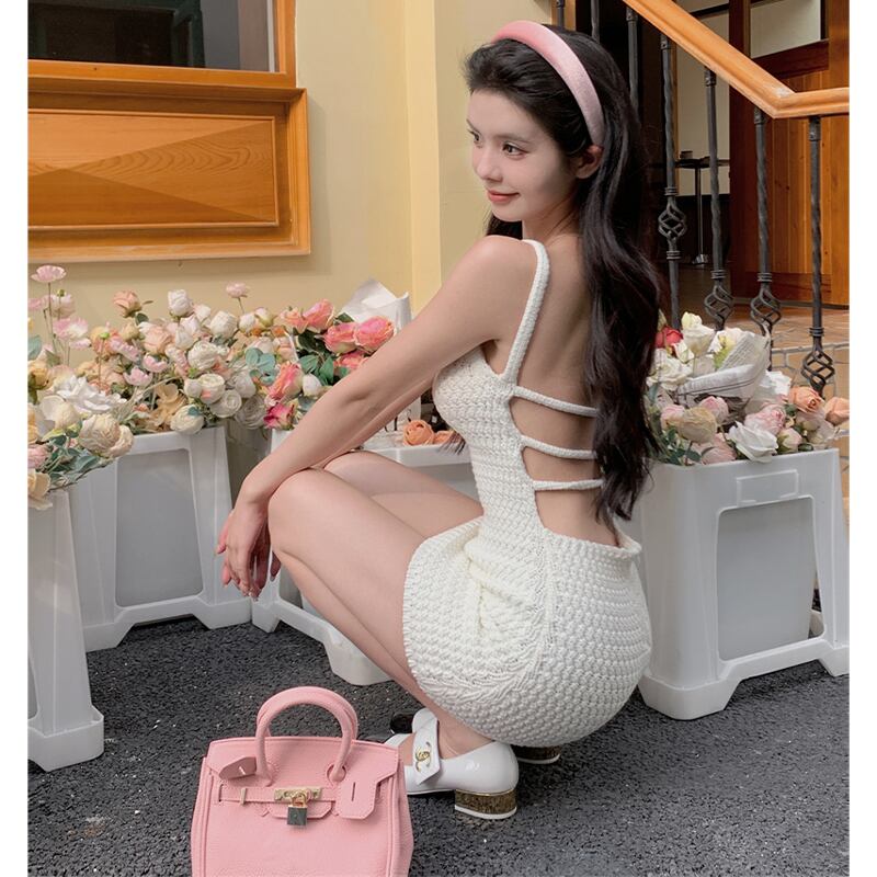 ワンピース ニット セクシー ガーリー ノースリーブ 背見せ 吊りワンピース ホワイト