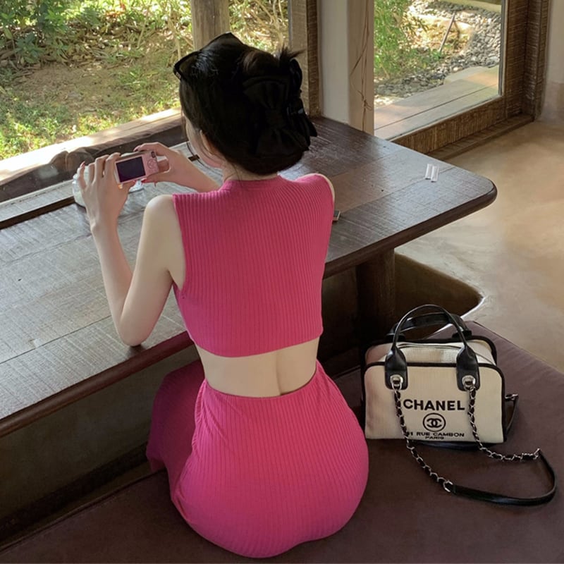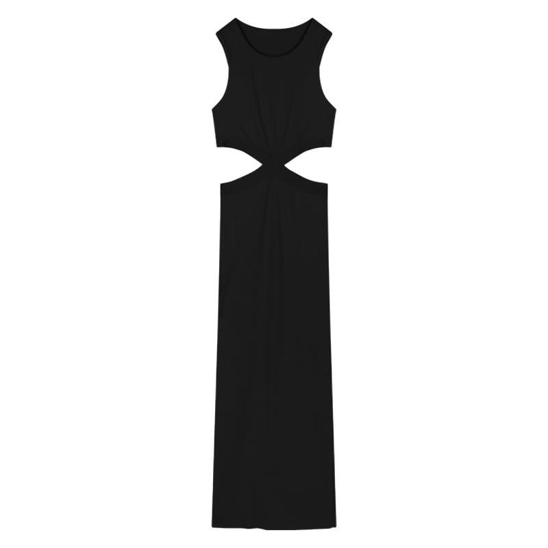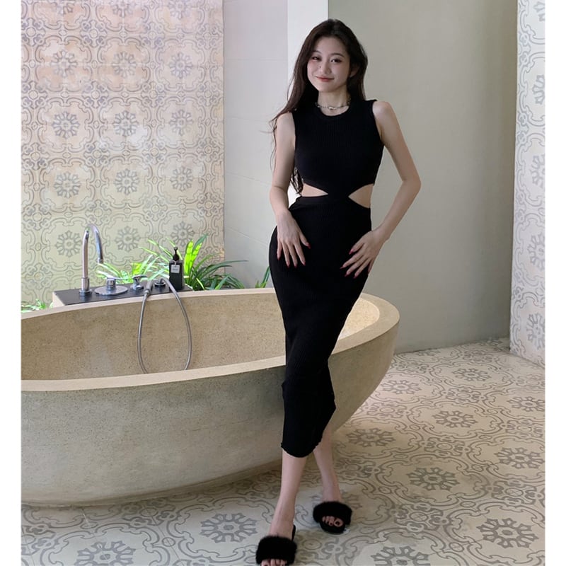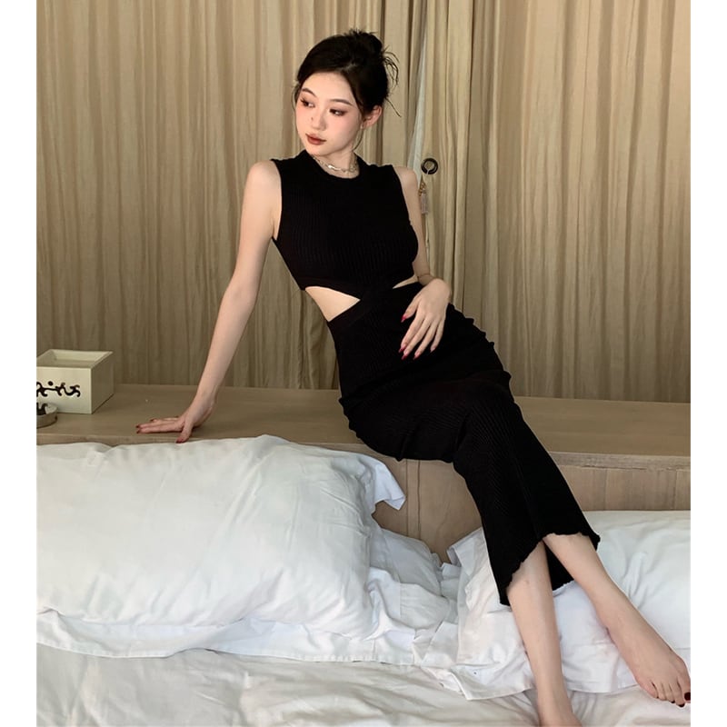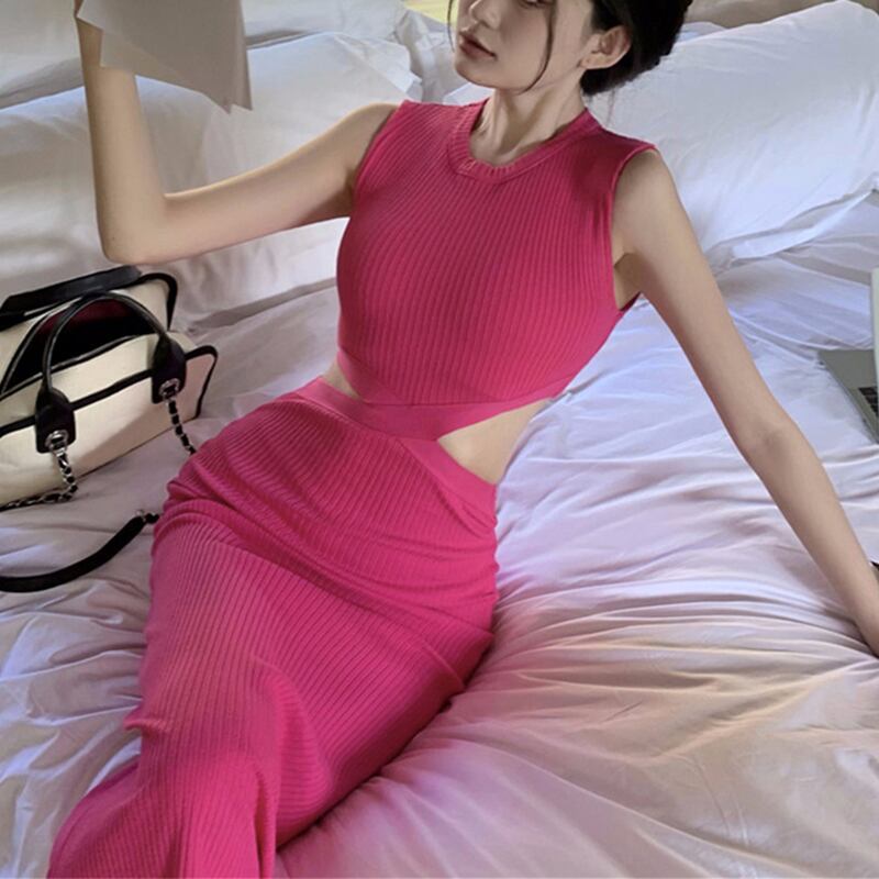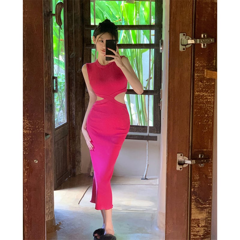 ワンピース セクシー お姉様 デザイン感 ノースリーブ ニット ロング丈 ばら色 ブラック