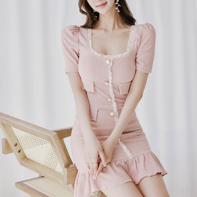 ワンピース スクエアネック 肩パフ レース スウィート ピンク S M L XL