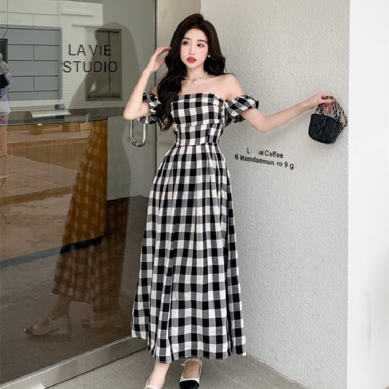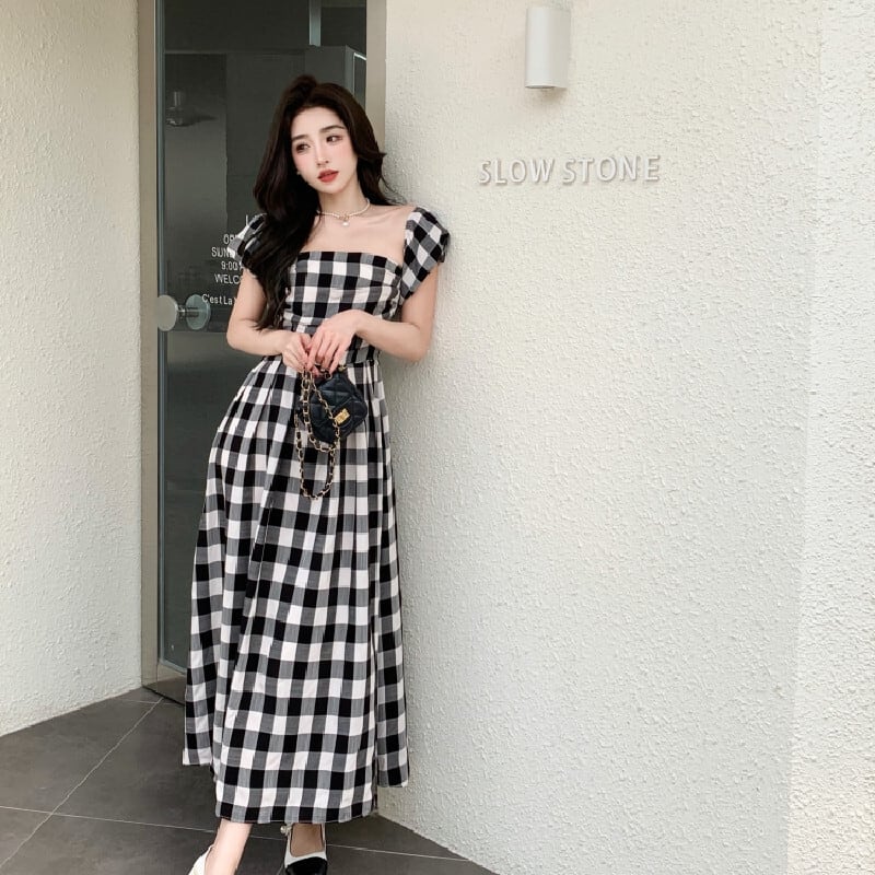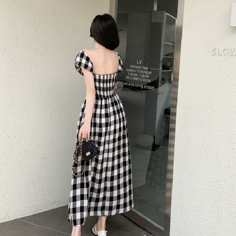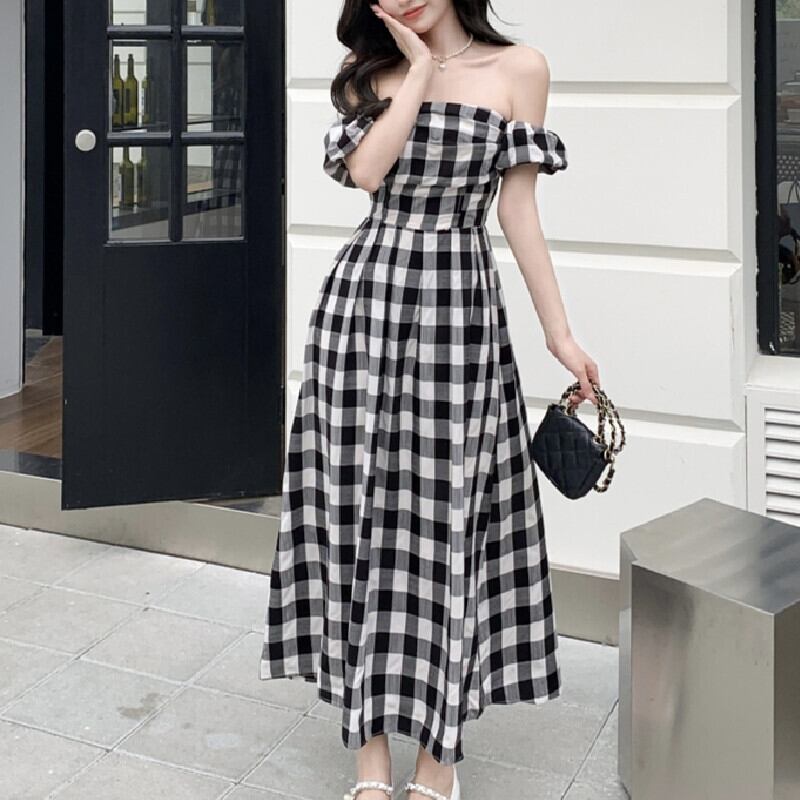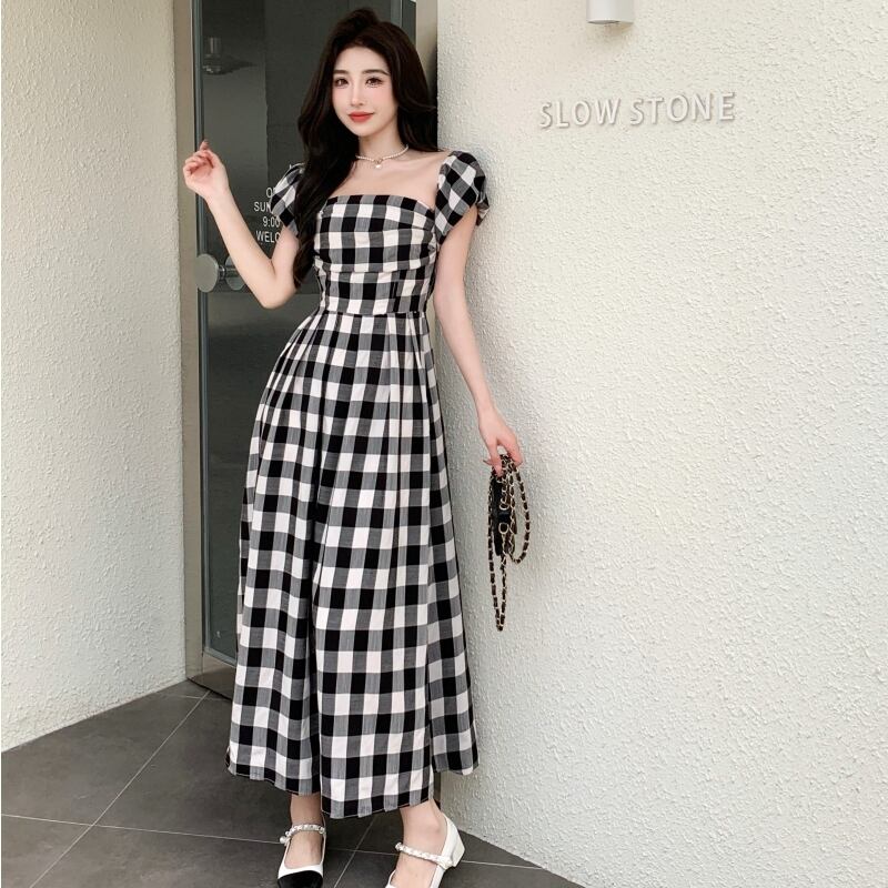 ワンピース パフスリーブ チェック柄 ロングワンピース レトロ カジュアル S M L XL