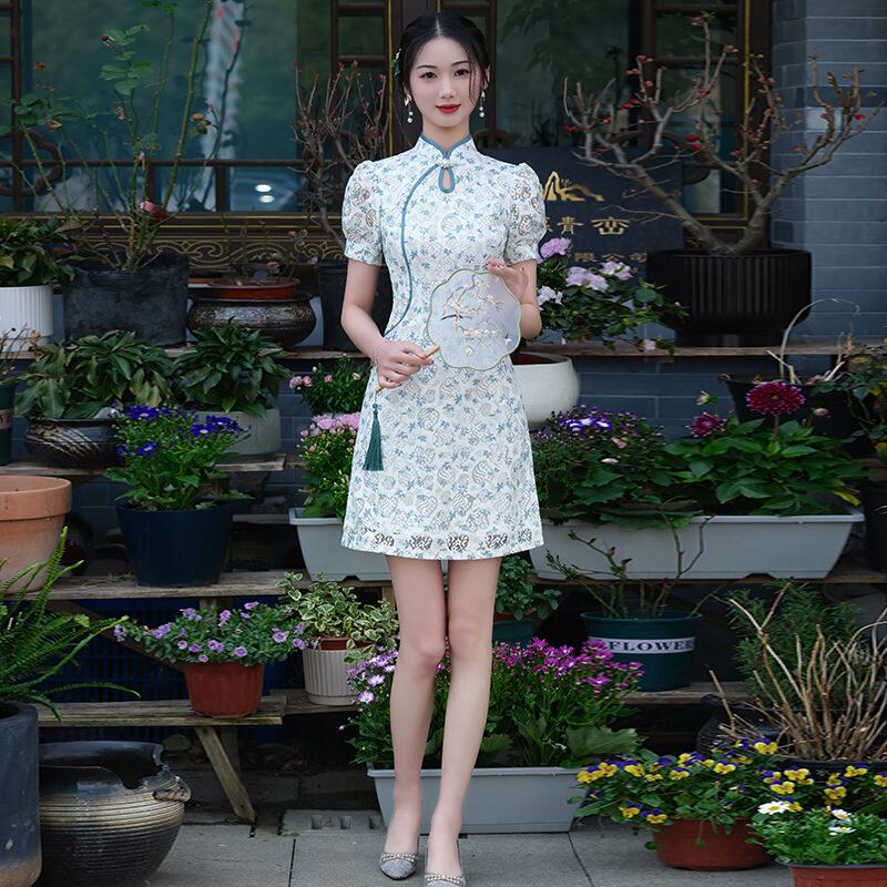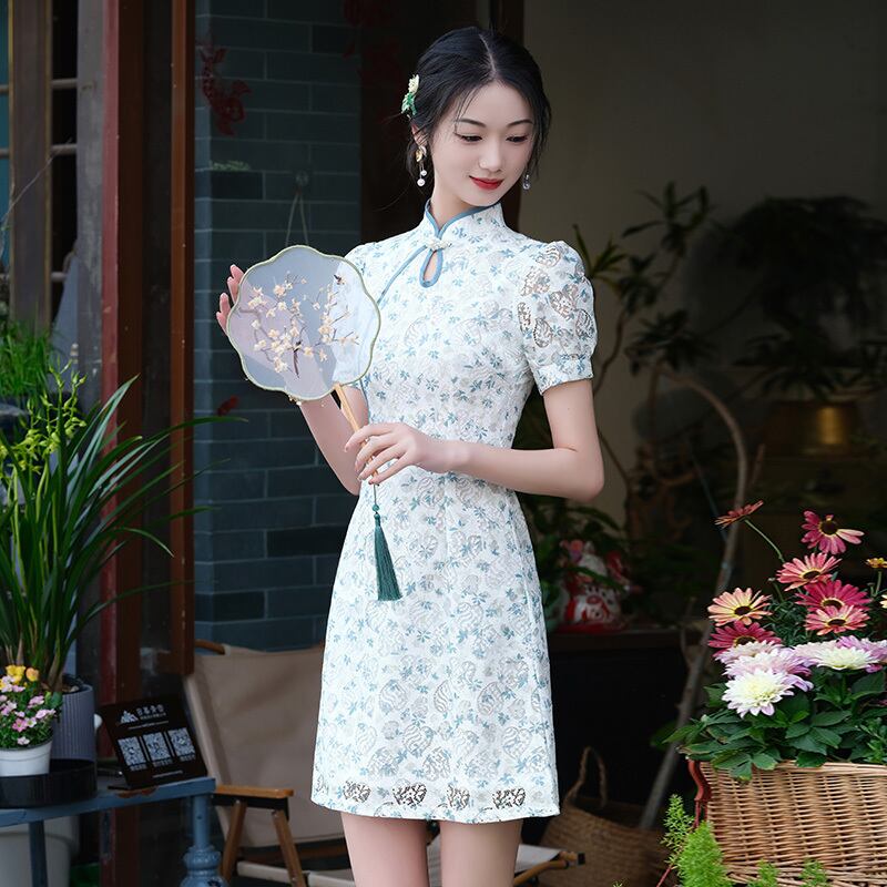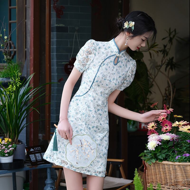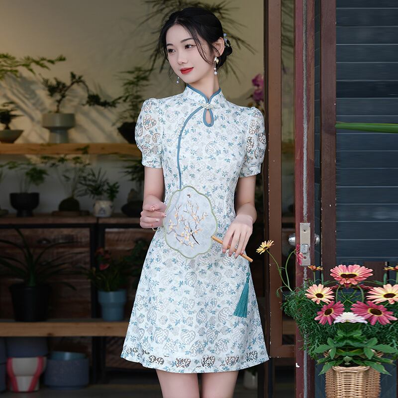 【花田シリーズ】改良型チャイナドレス レース パフスリーブ 花柄 ブルー S M L XL 2XL