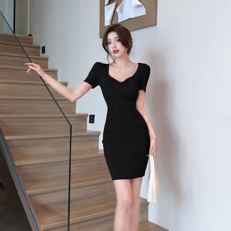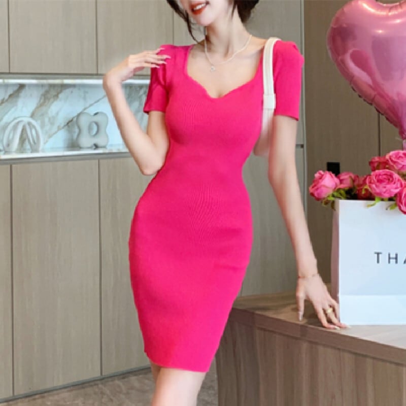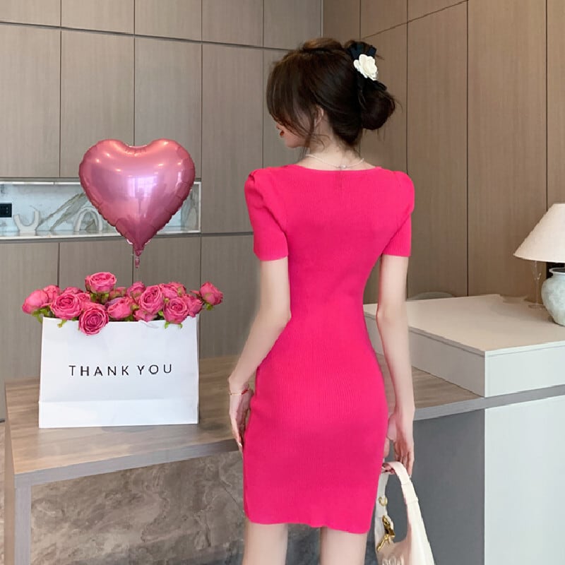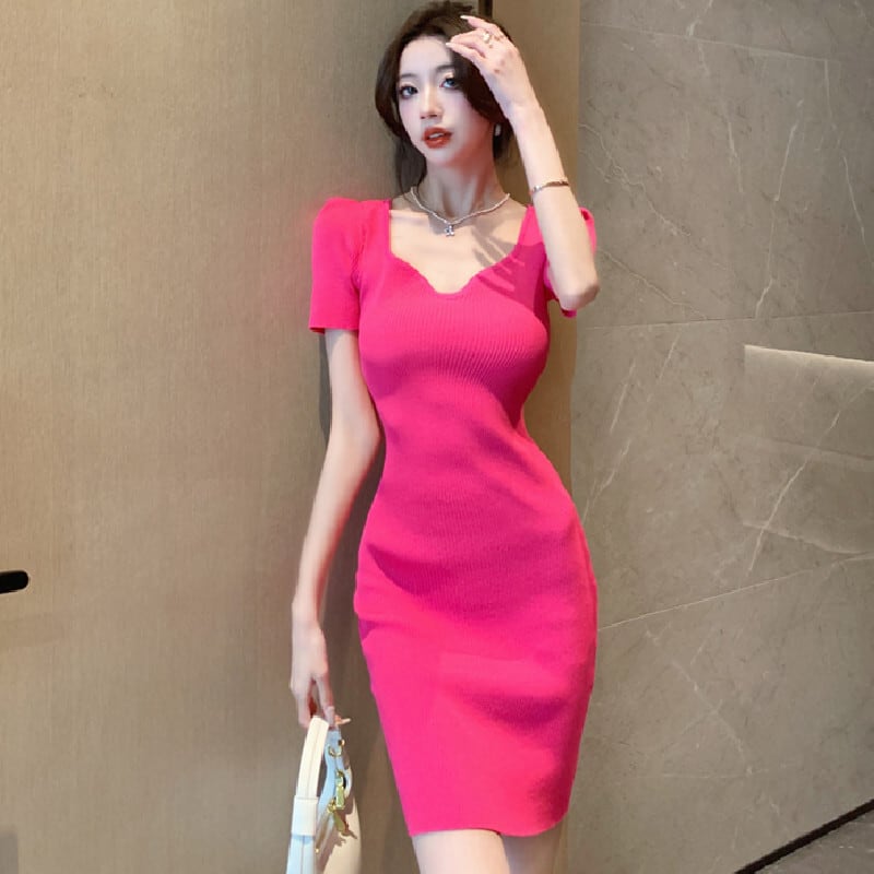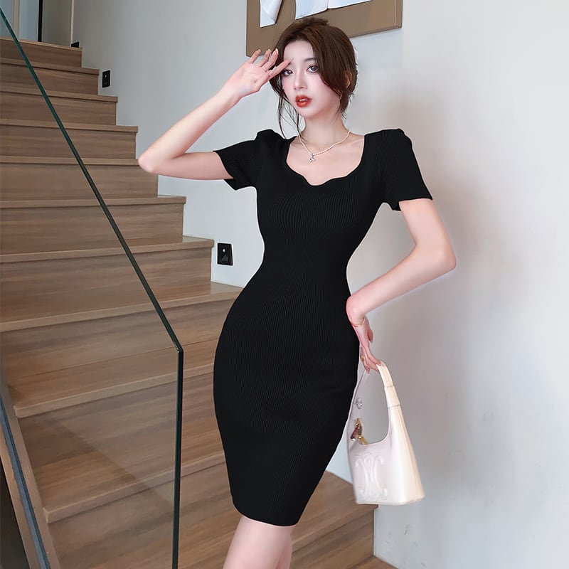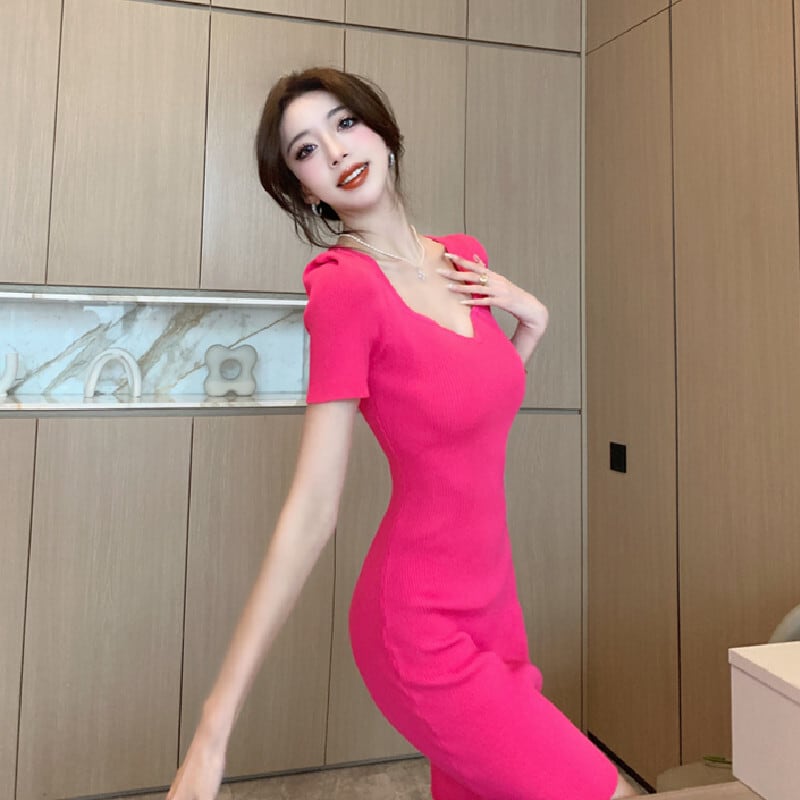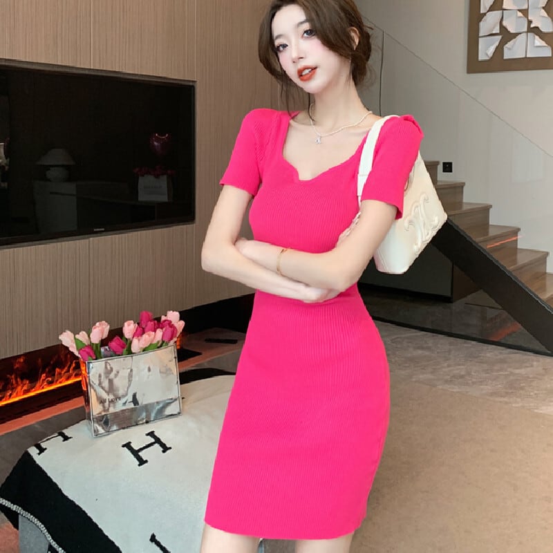 【CHERRYシリーズ】ワンピース 2色展開 スクエアネック ニット シンプル ローズ色 ブラック S M L