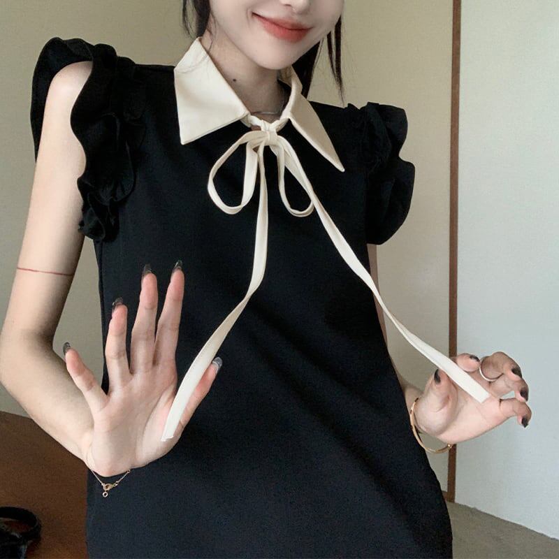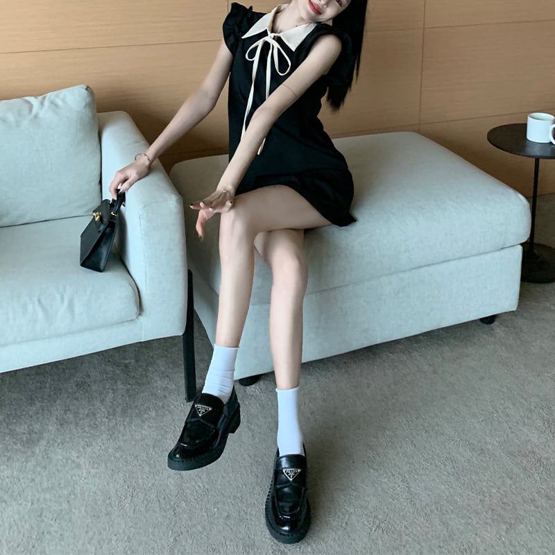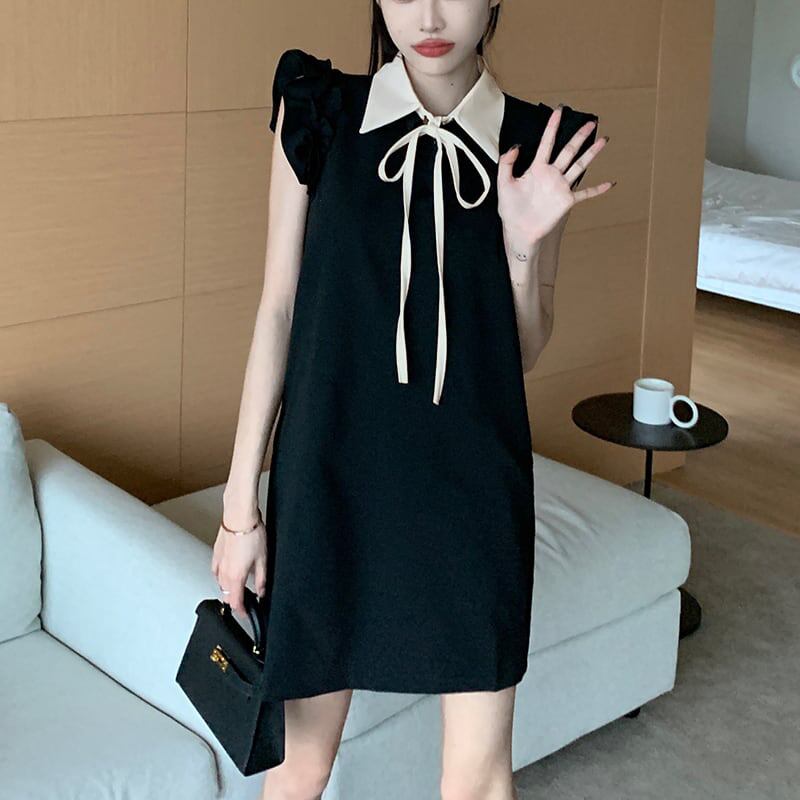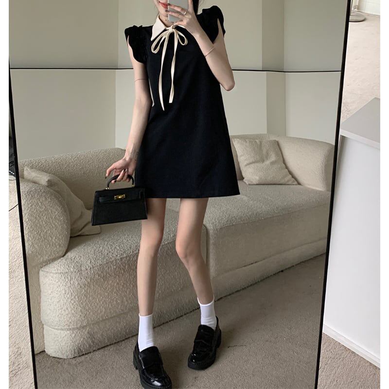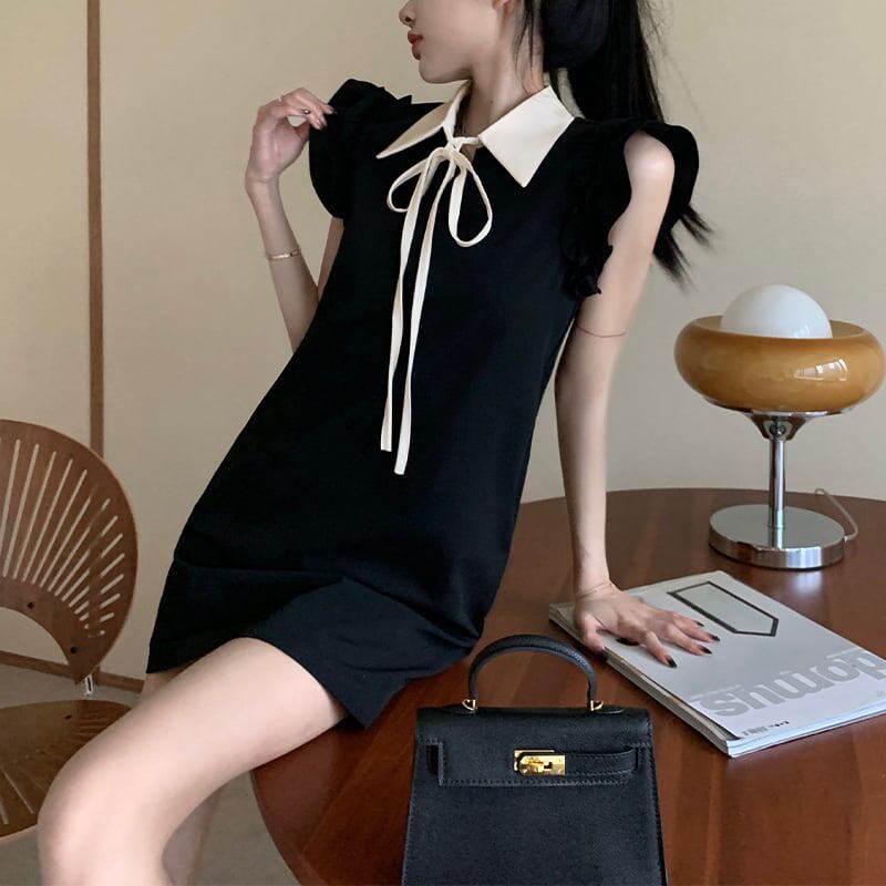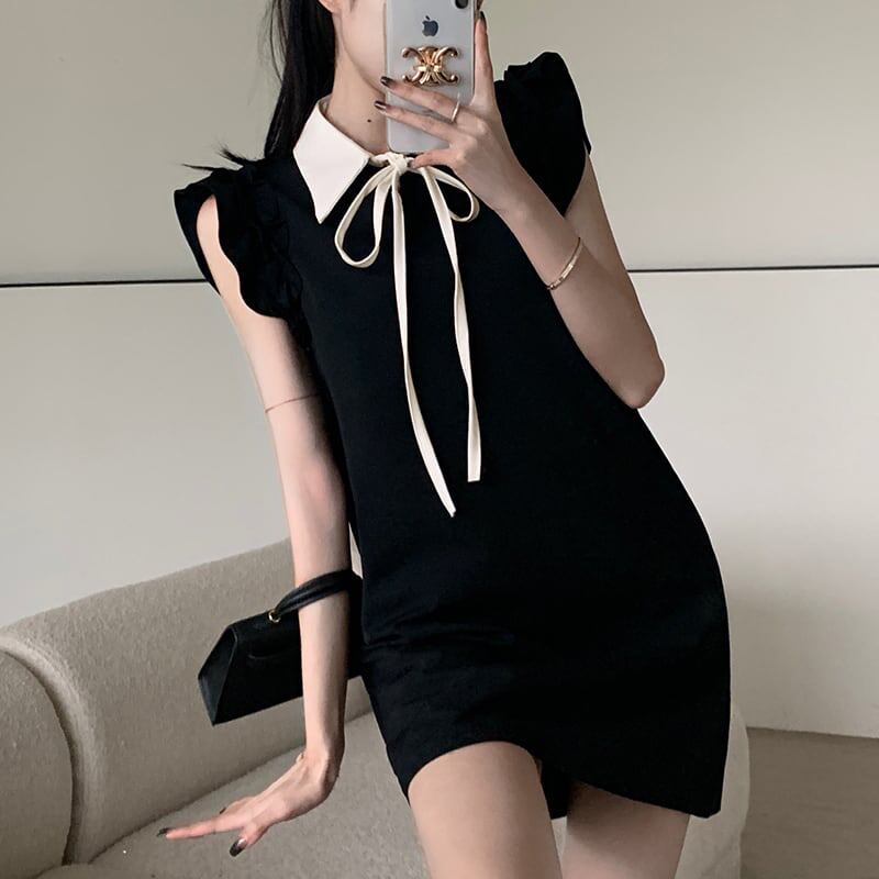 ワンピース OL/通勤 Aライン フラッター・スリーブ ボウタイ ブラック S M