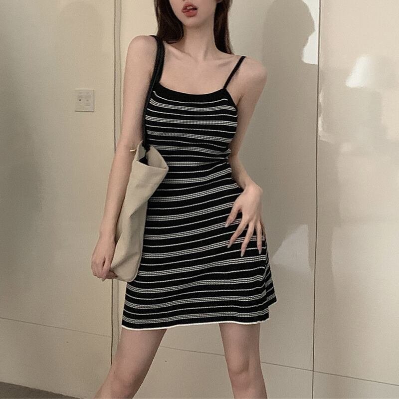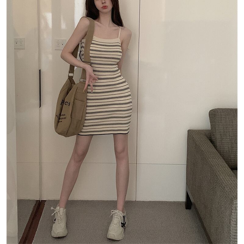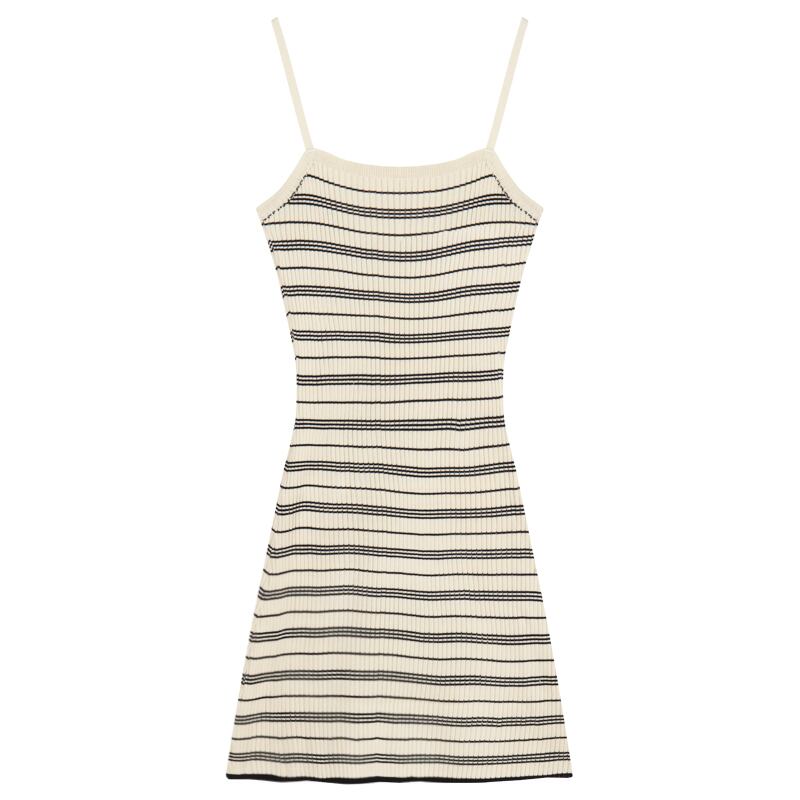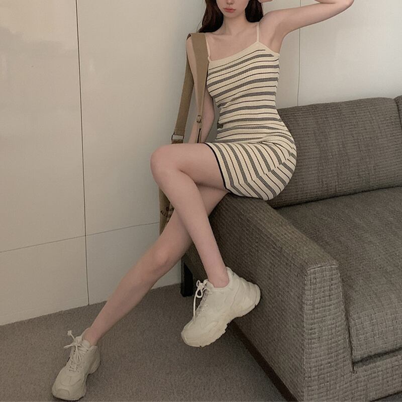 ワンピース セクシー 優しい ボーダー ニット 吊りワンピース ベージュ ブラック S M L