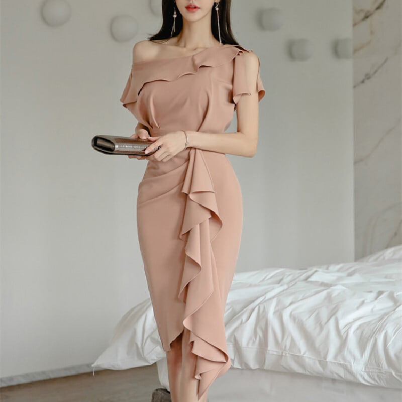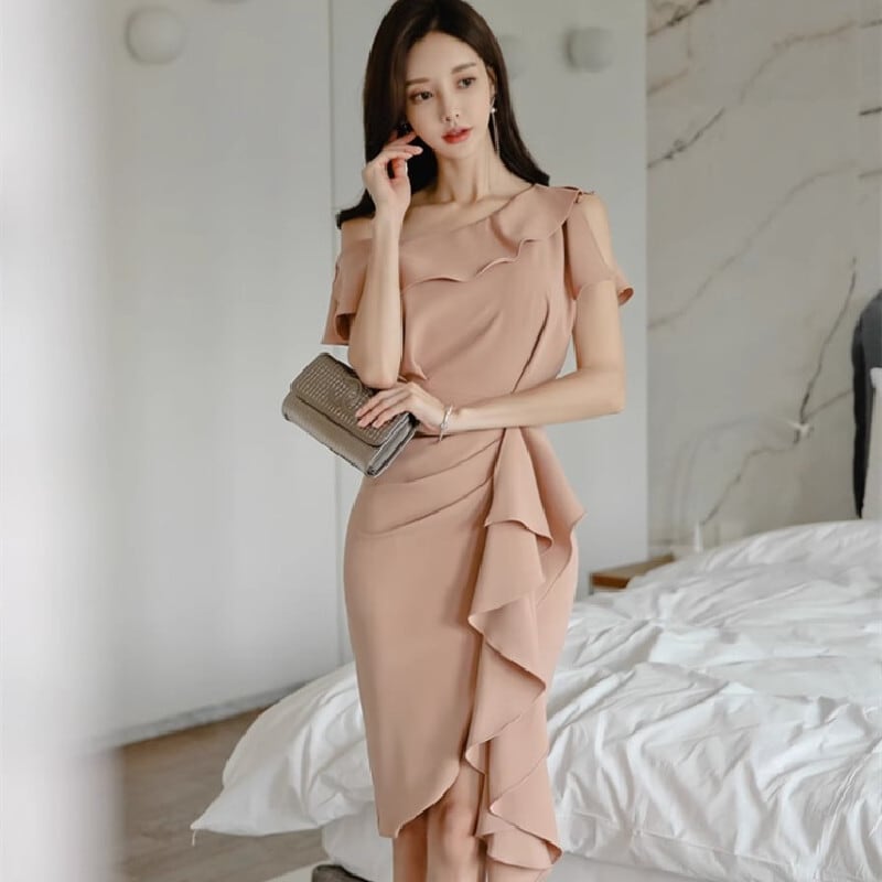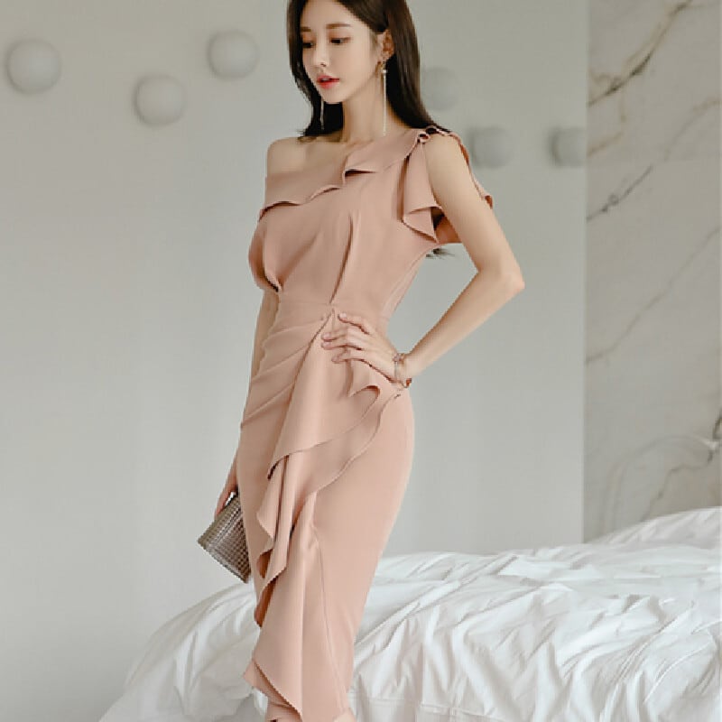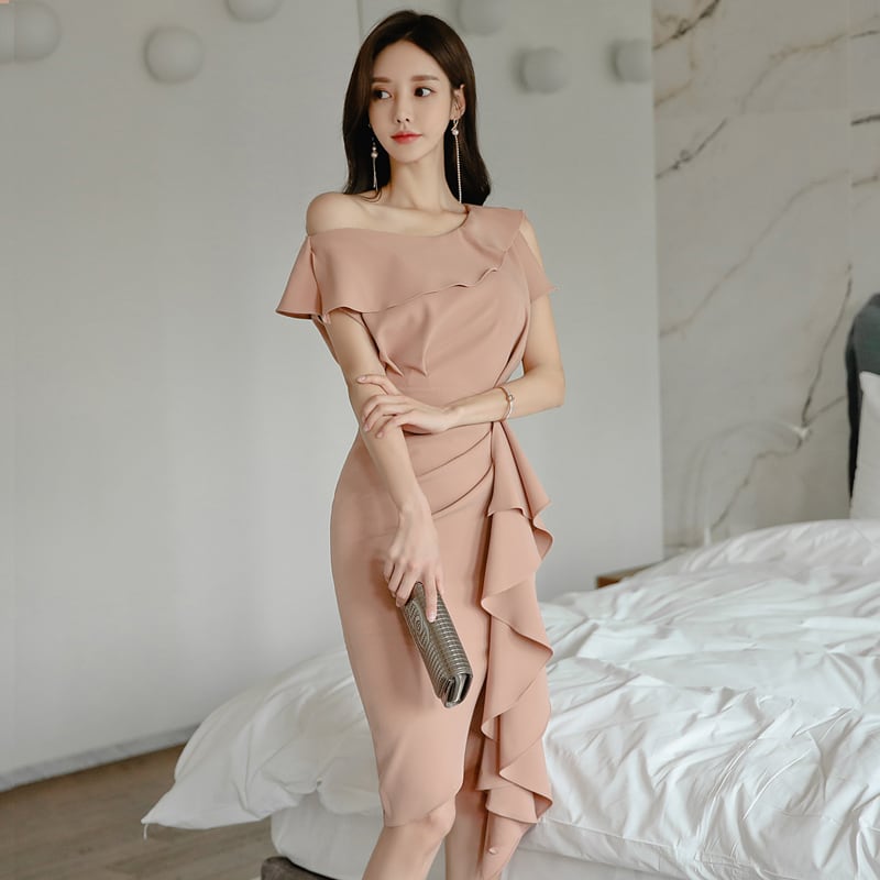 ワンピース オフショルダー 無地 ワンショルダー ペプラム ダークアプリコット S M L XL