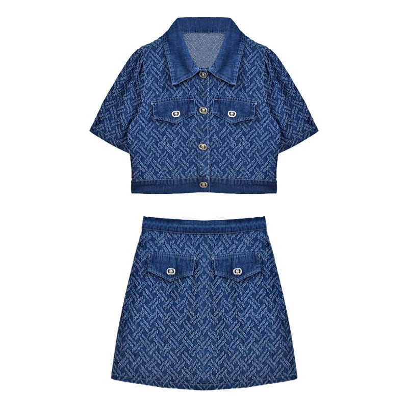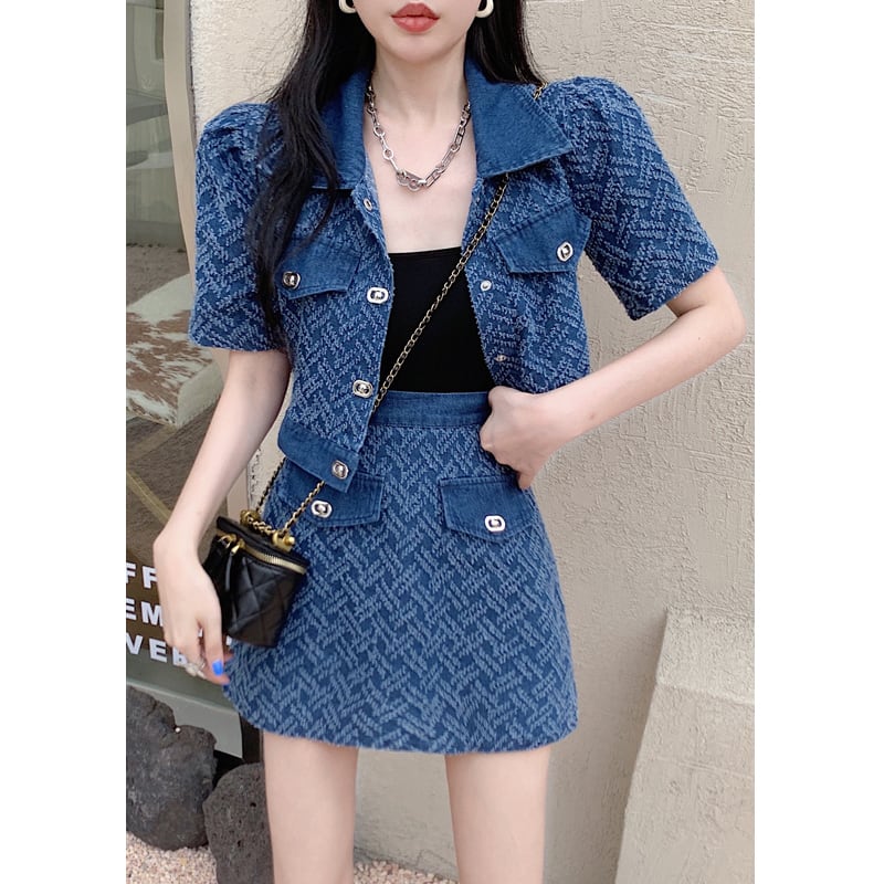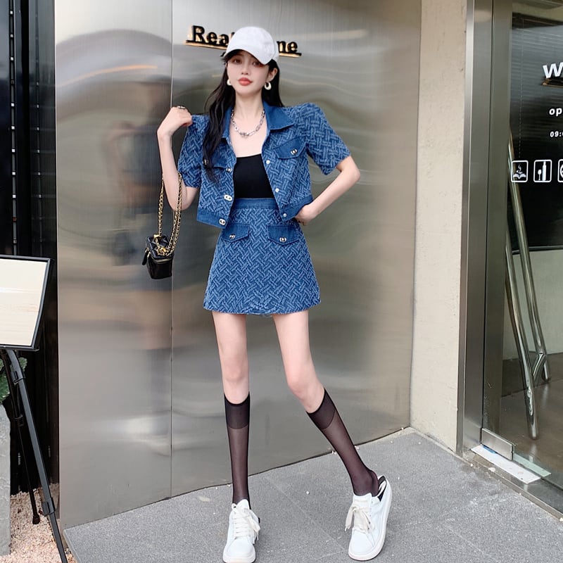 セットアップ 韓国系 個性 OL/通勤 カジュアル デニム アウター+スカート ブルー S M