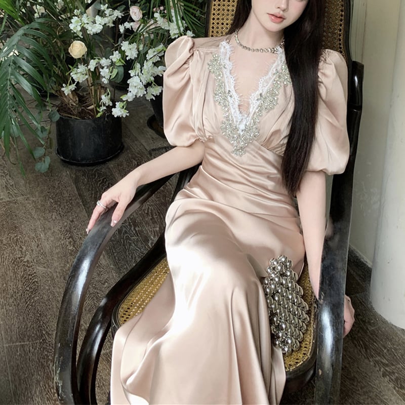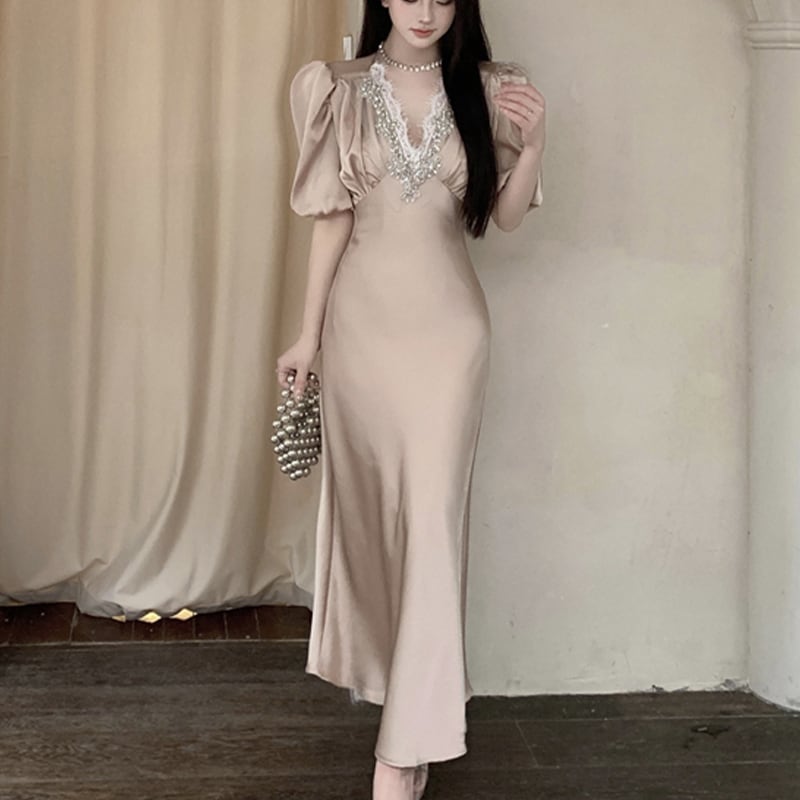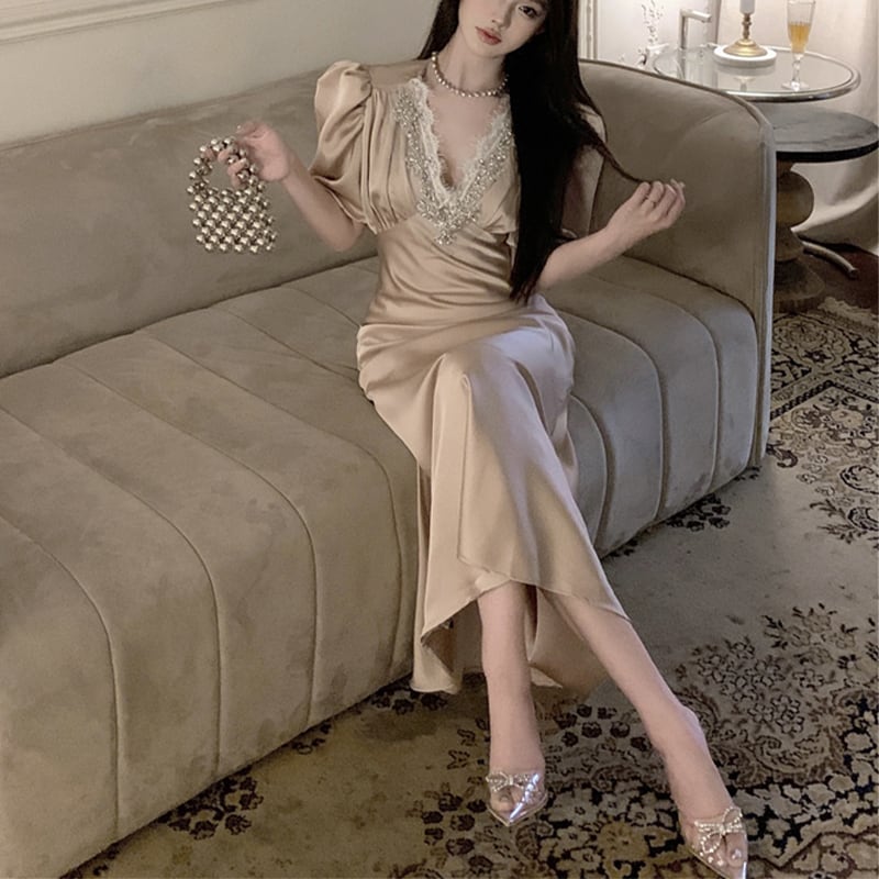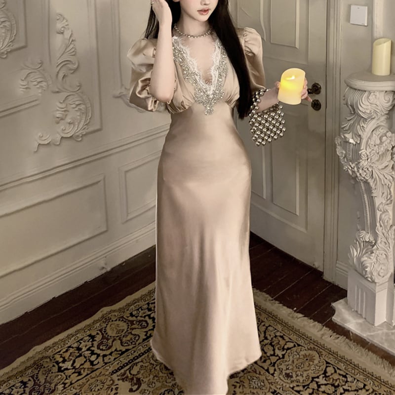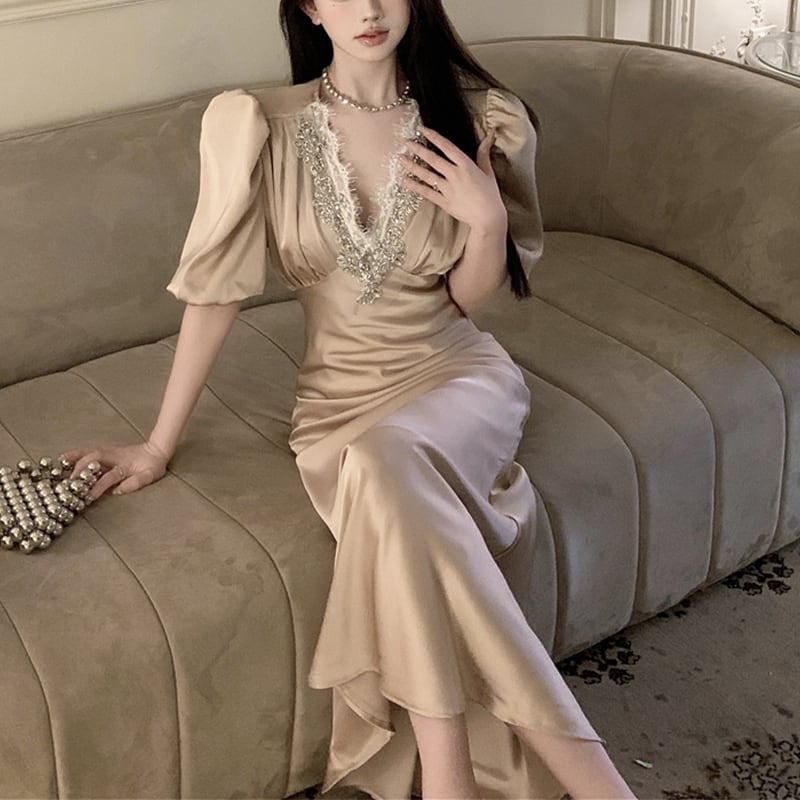 ワンピース セクシー レース Vネック シルク ランタンスリーブ フィッシュテール シャンパン S M L