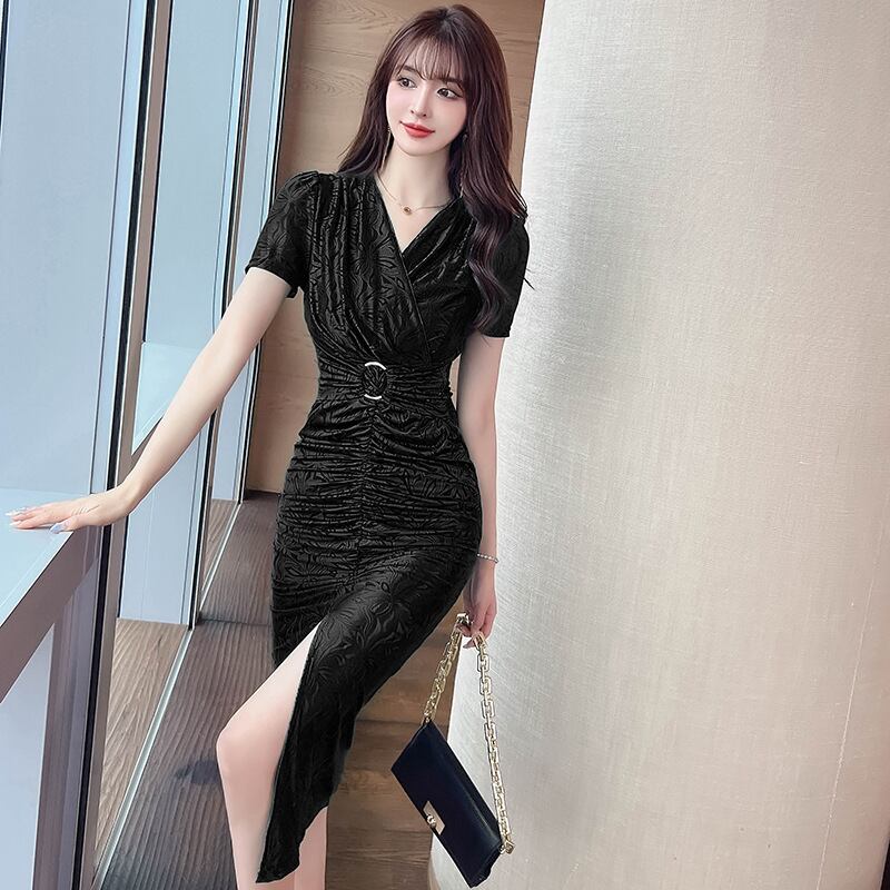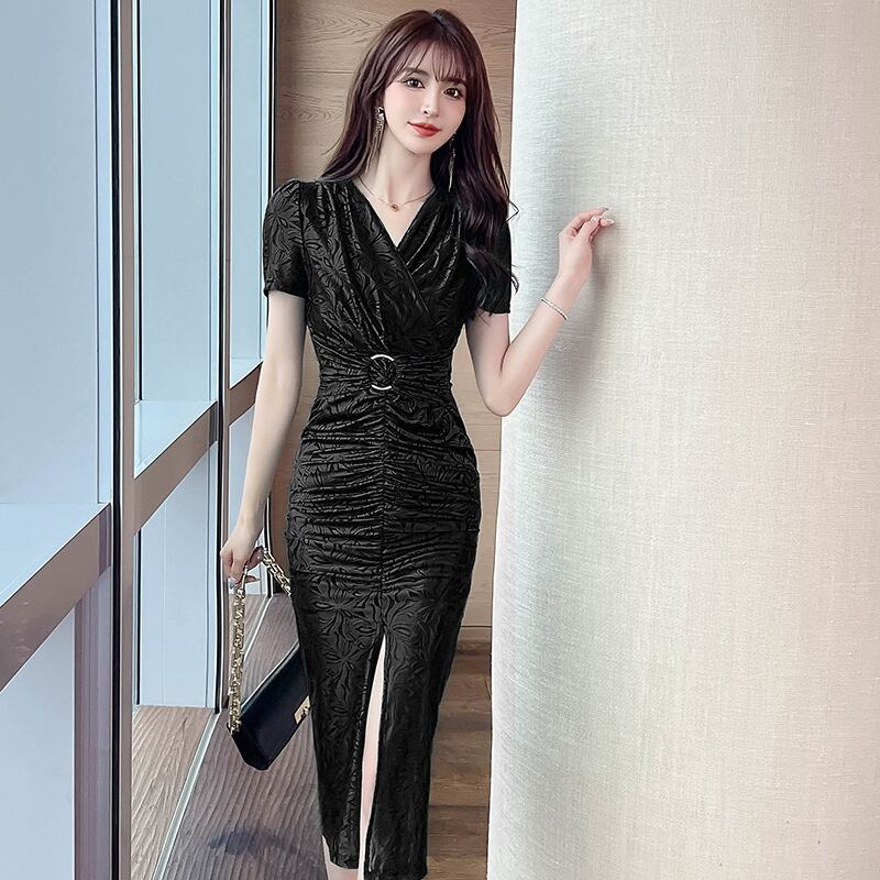 【夕暮薔薇シリーズ】ワンピース 2色展開 Vネック 前スリット 着痩せ グリーン ブラック S M L XL