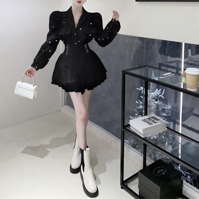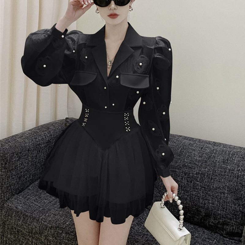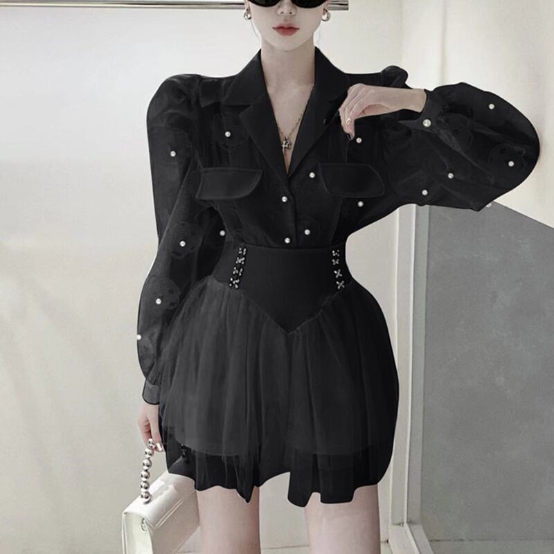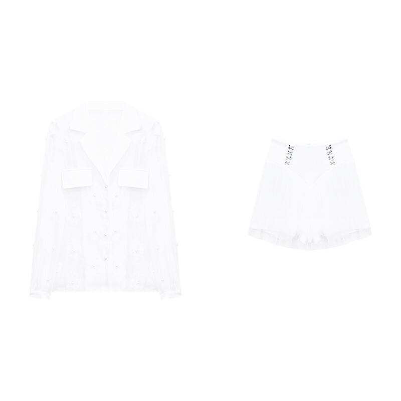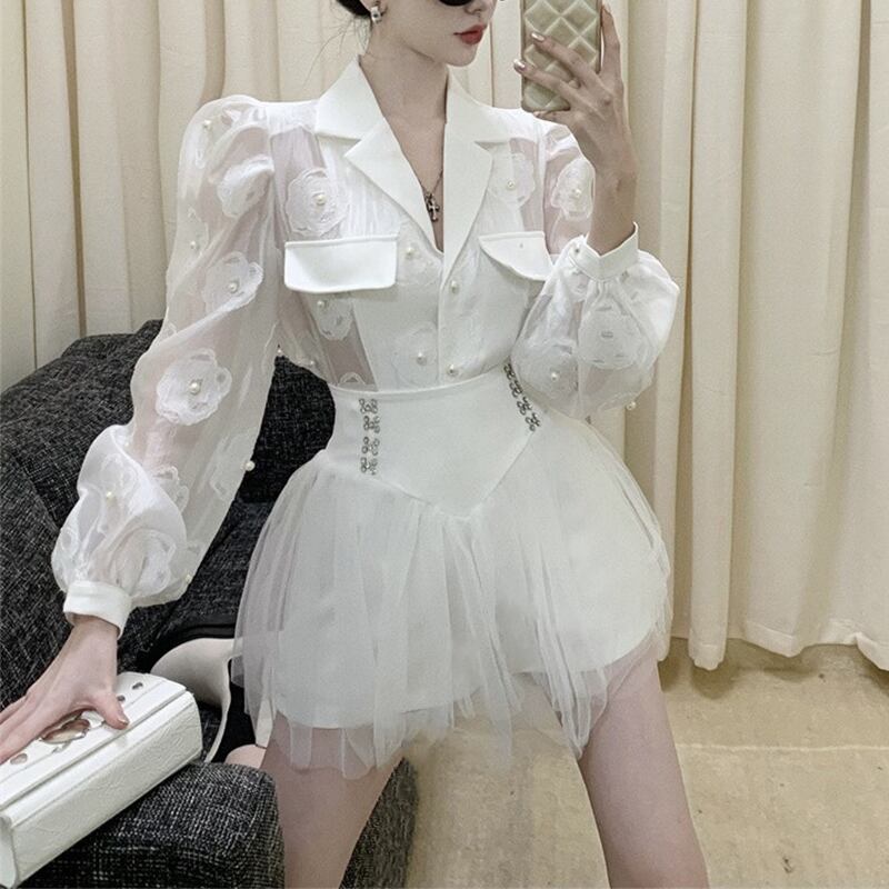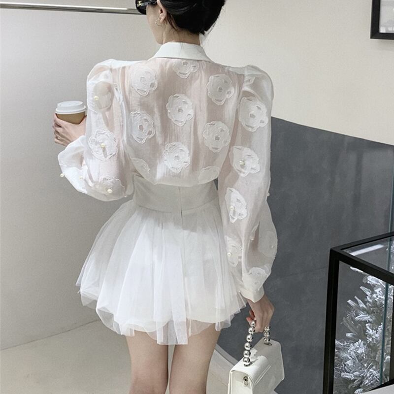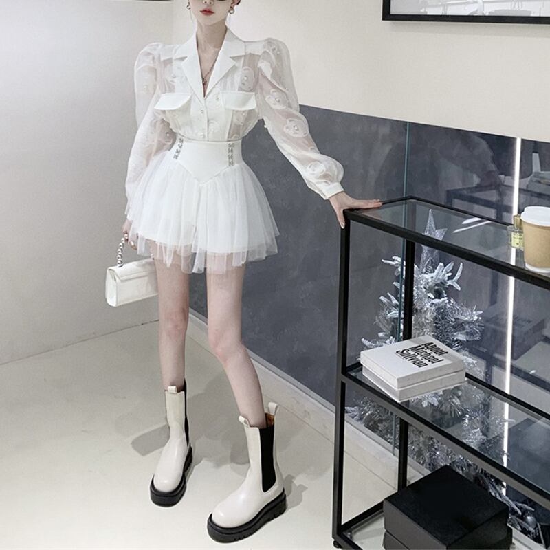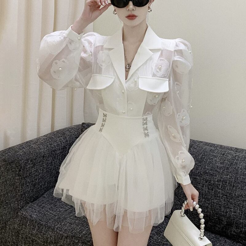 セットアップ OL/通勤 Vネック チュール素材 トップス+スカート ホワイト ブラック S M L