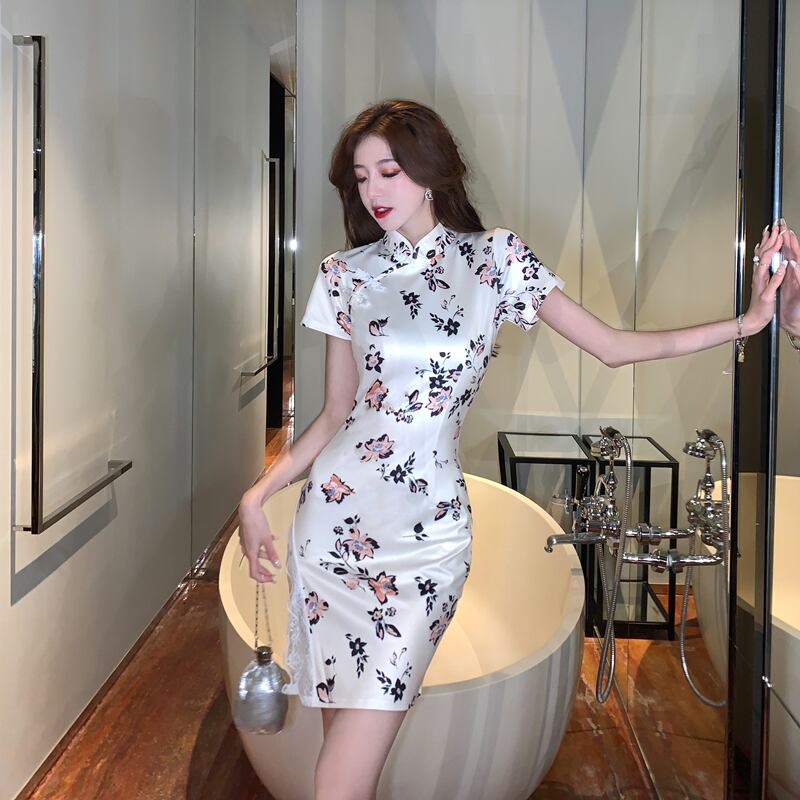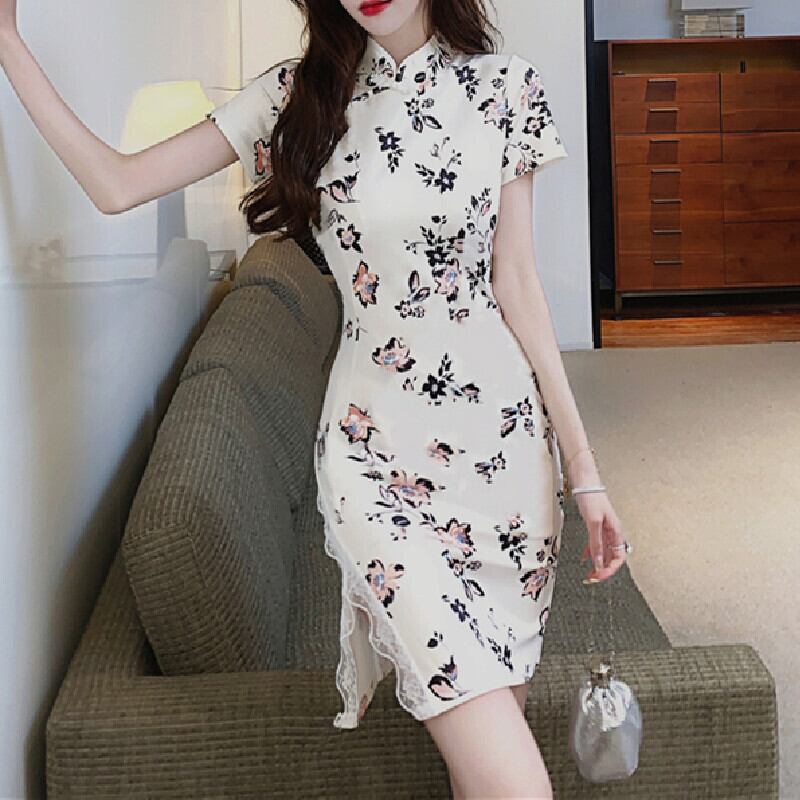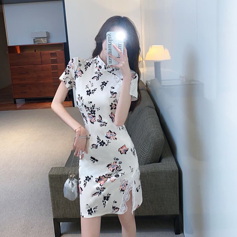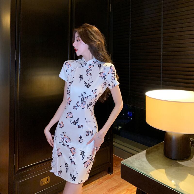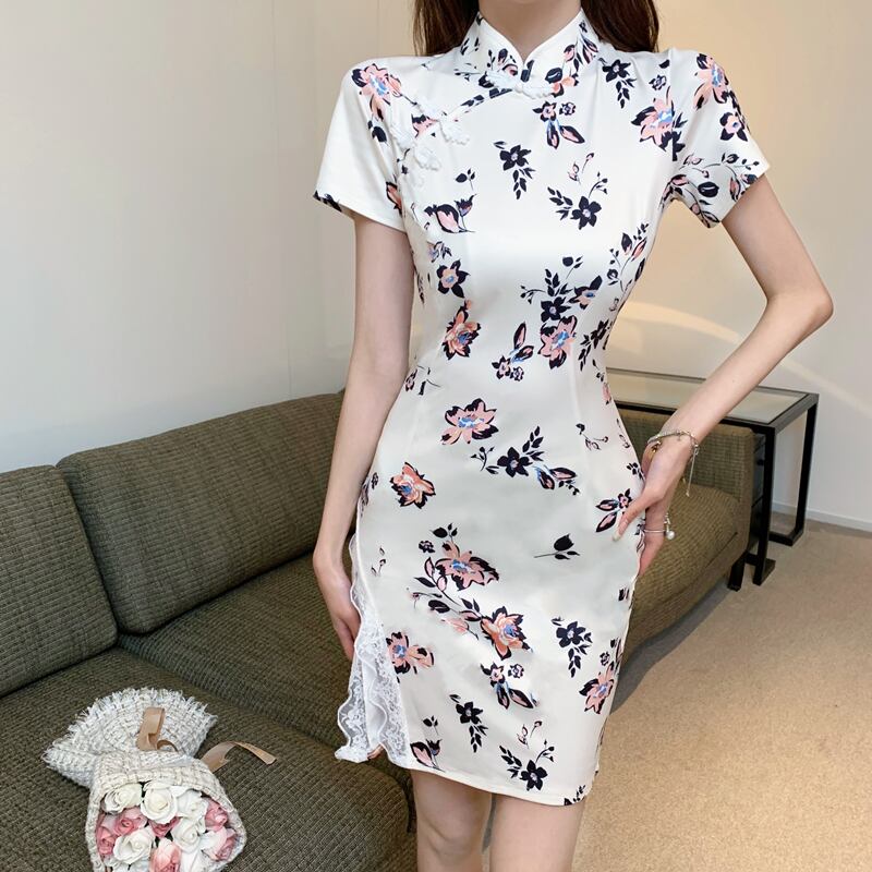 【CHERRYシリーズ】チャイナ風ワンピース セクシー レース 花柄 プリント S M L XL