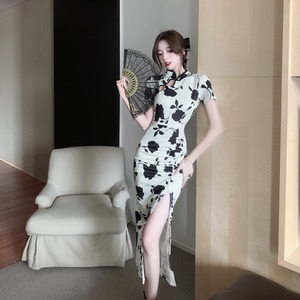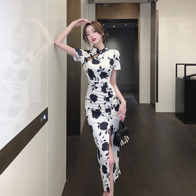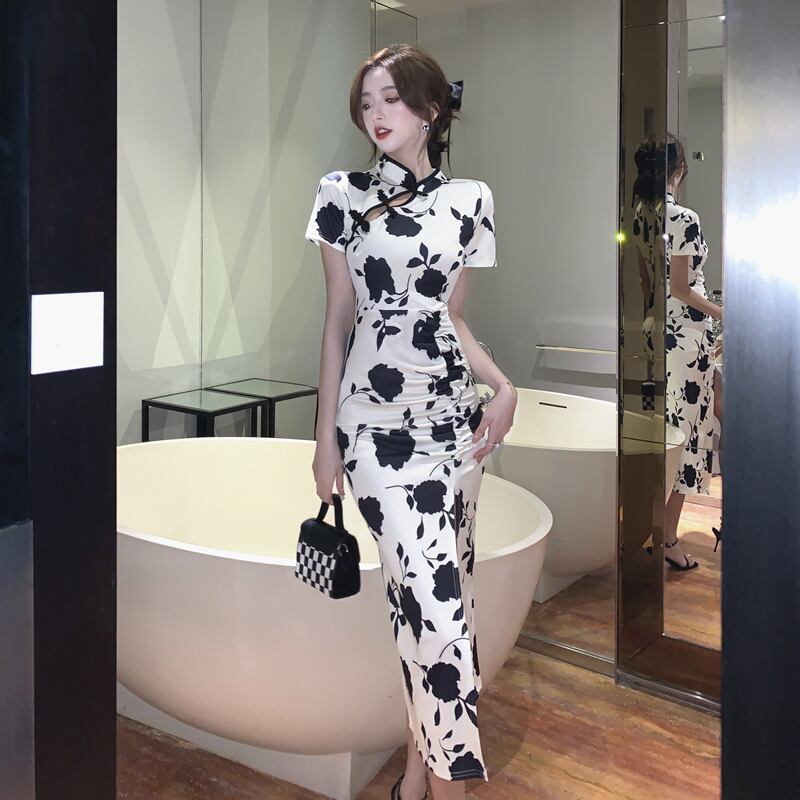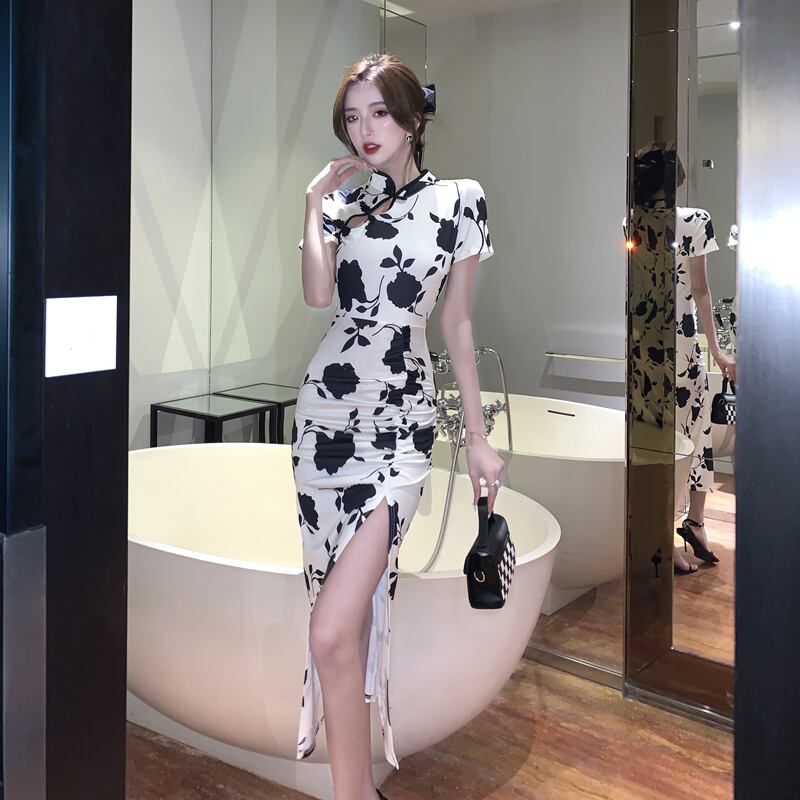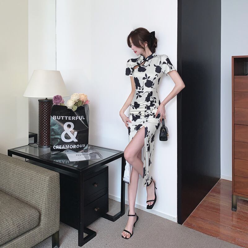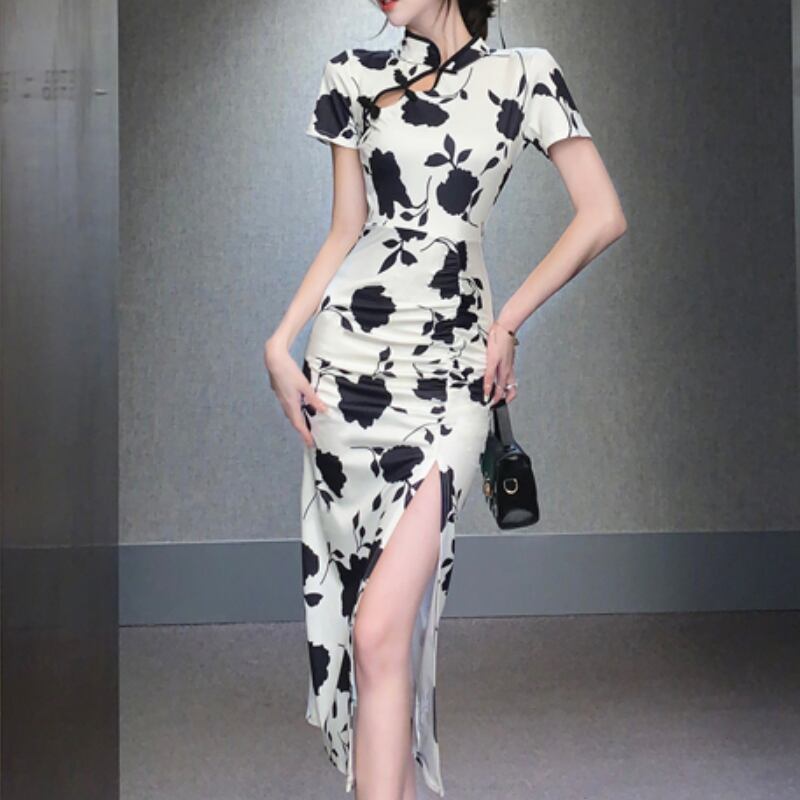 【CHERRYシリーズ】ワンピース 黒白配色 チャイナ風 花模様 S M L XL