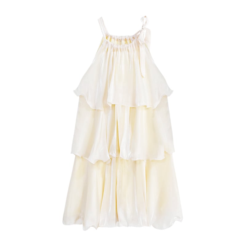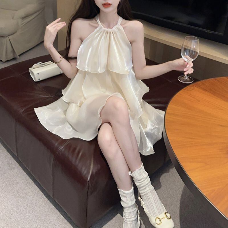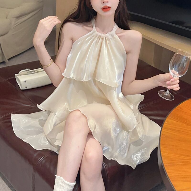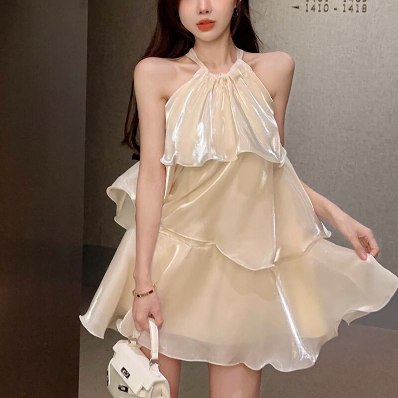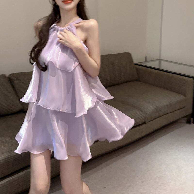 ワンピース 優しい デザイン感 かわいい ティアード ホルターネック ベージュ パープル
