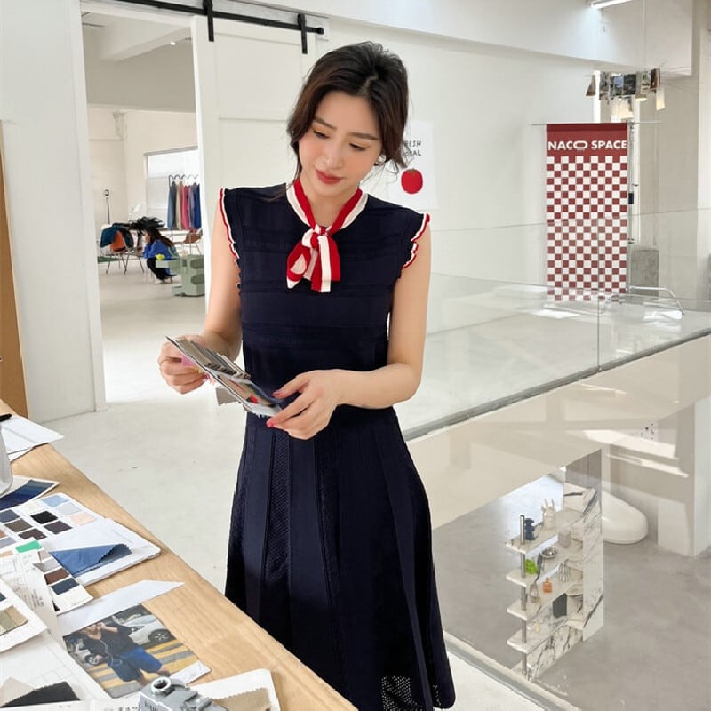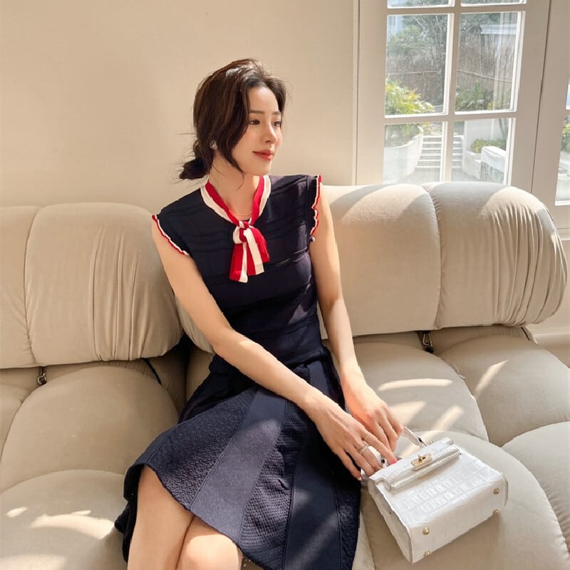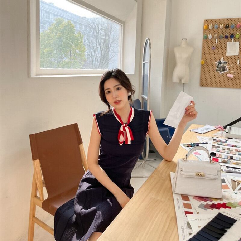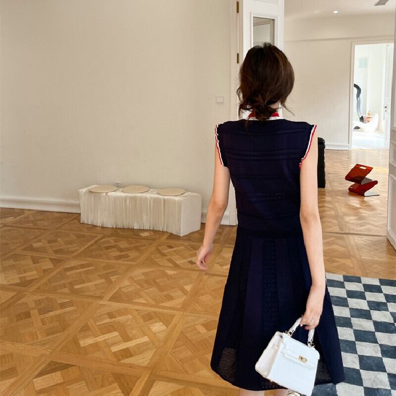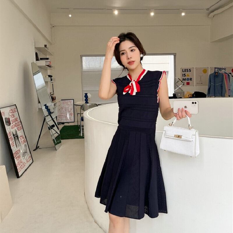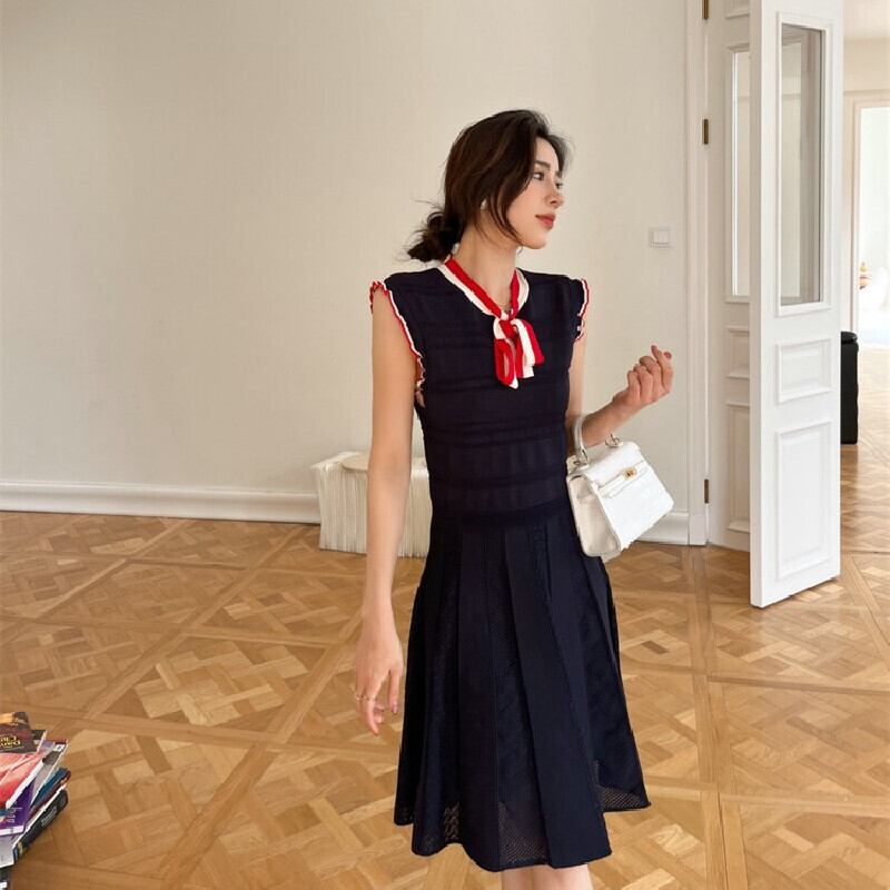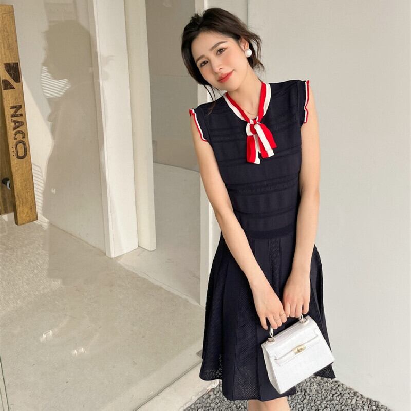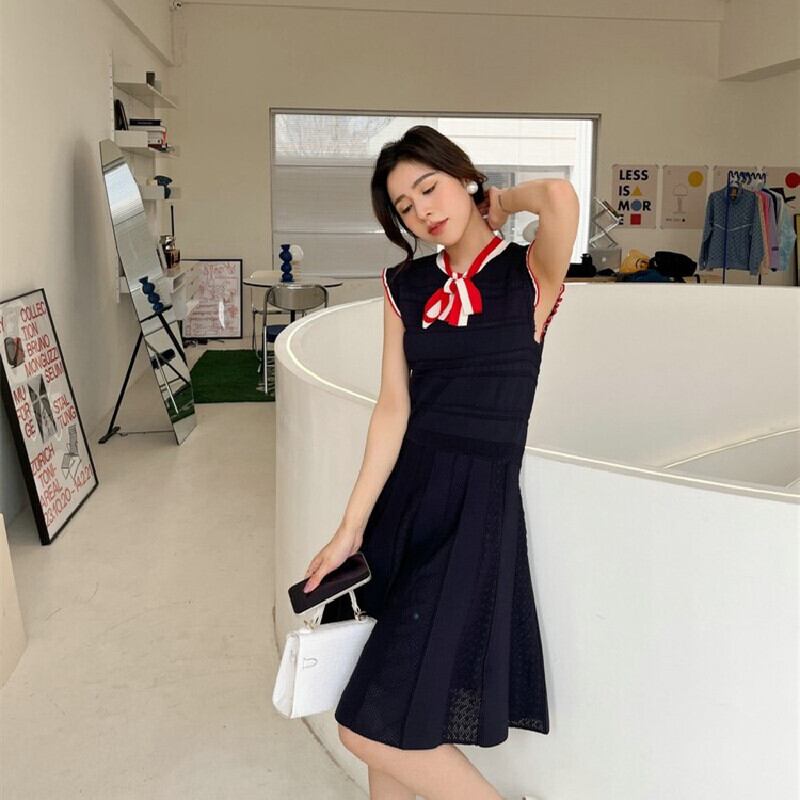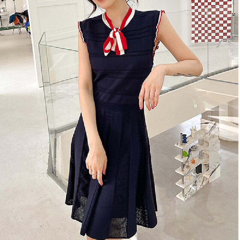 ワンピース OL/フォーマル ノースリーブ フェミニン ニット ストライプ柄 ダークブルー S M L