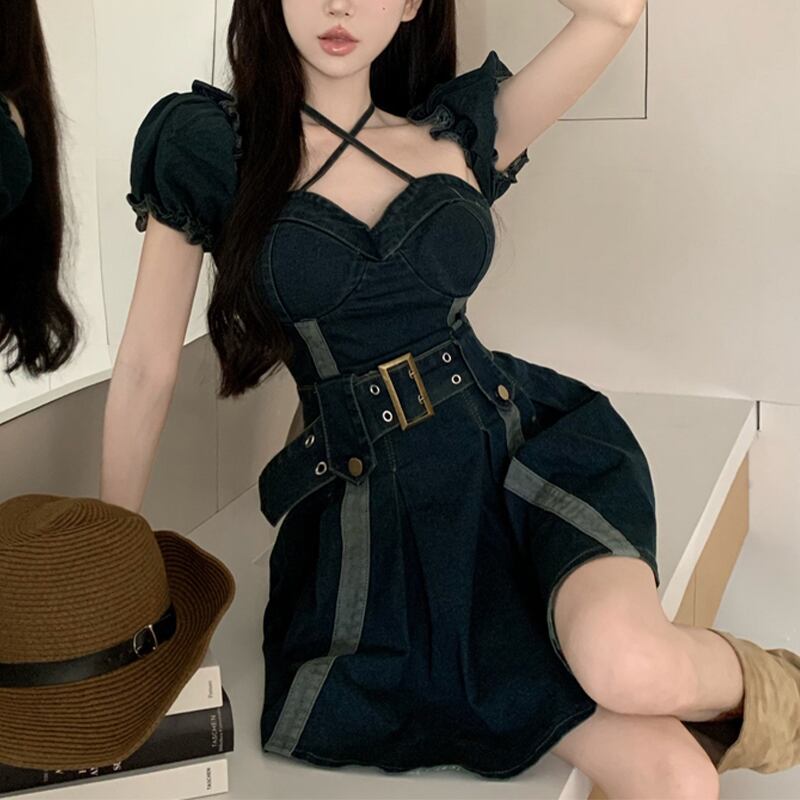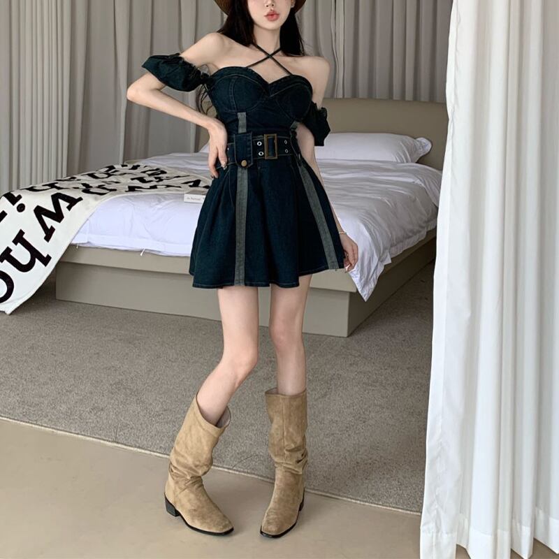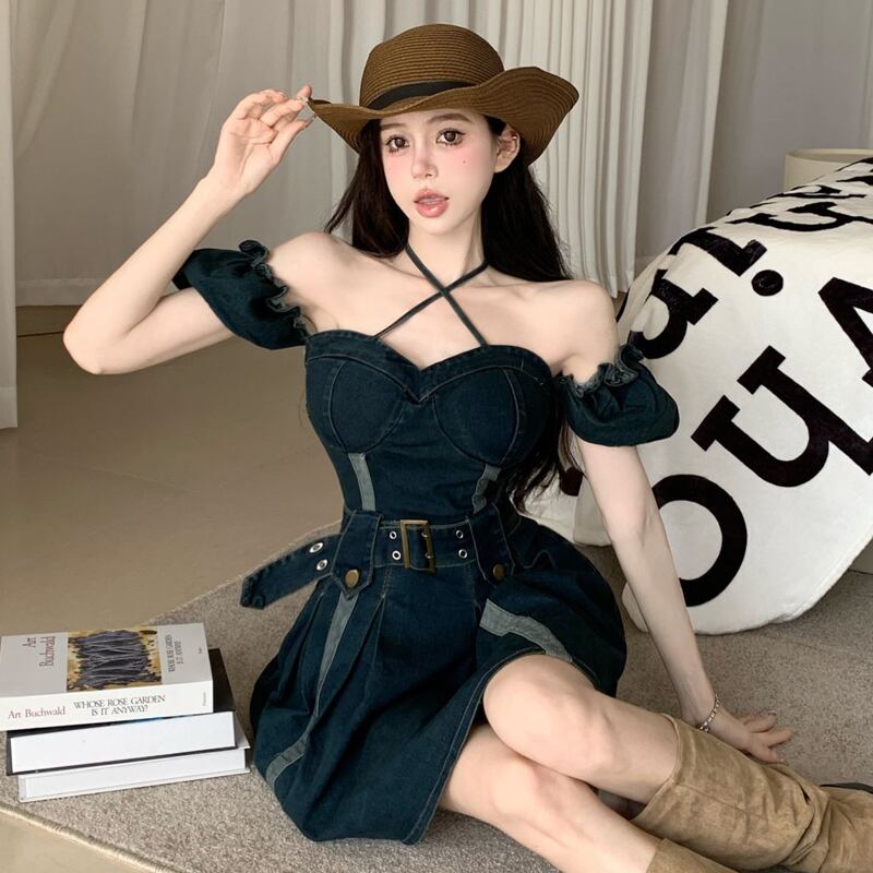 ワンピース ベルト付き 韓国系 個性 セクシー OL/通勤 デニム Aライン S M L