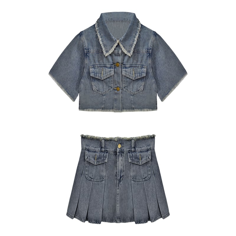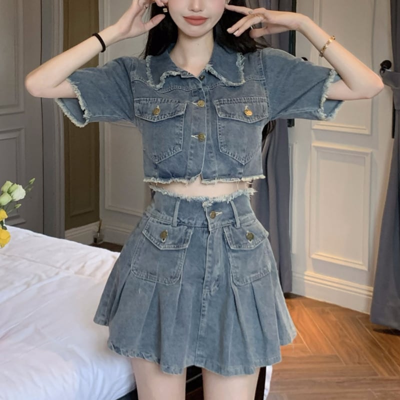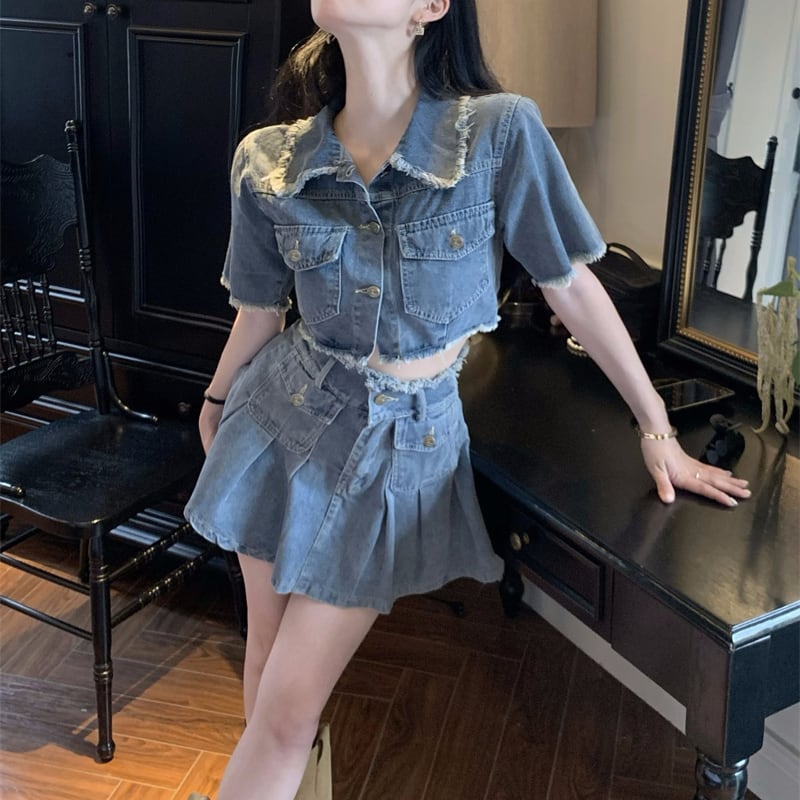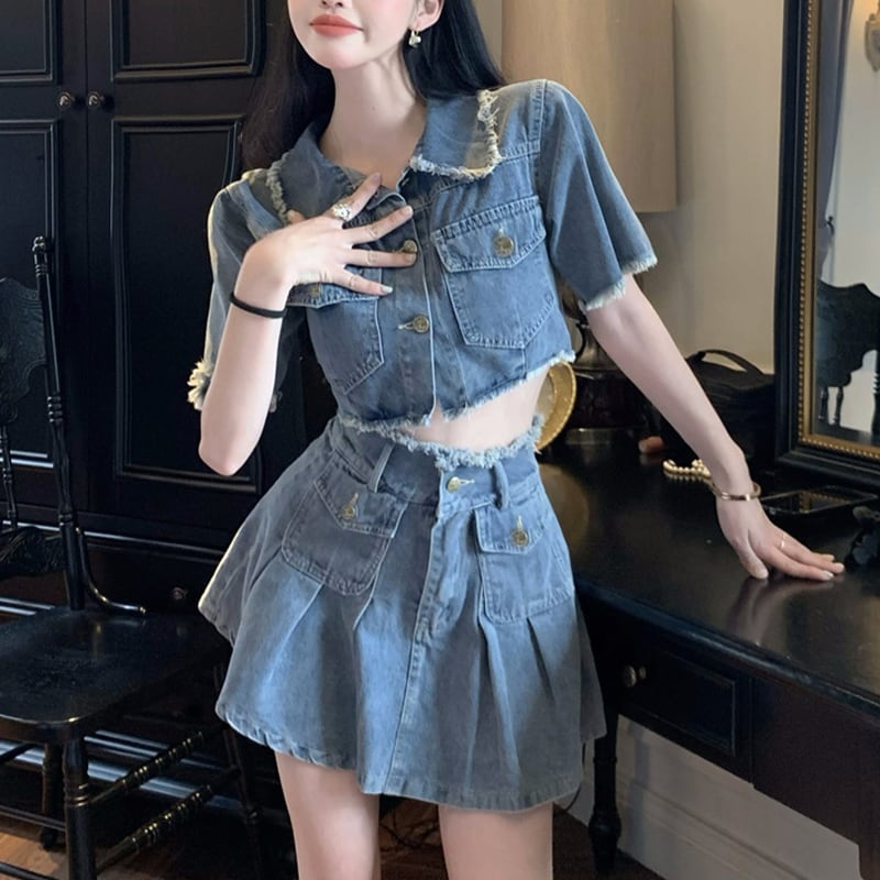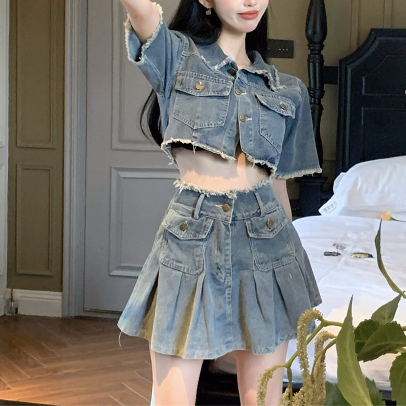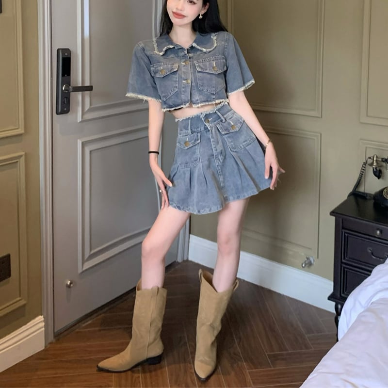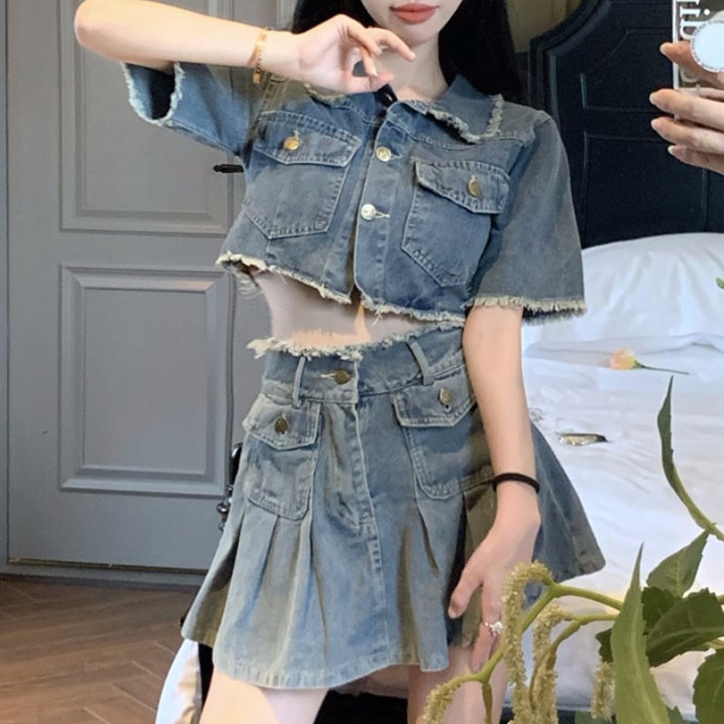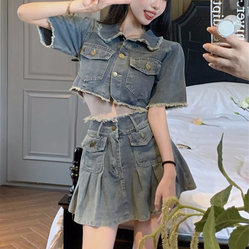 セットアップ 韓国系 個性 OL/通勤 デニム Aライン トップス+スカート S M