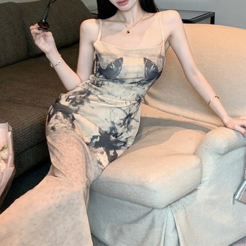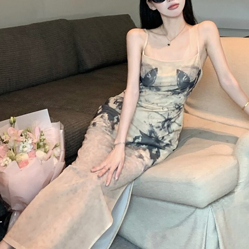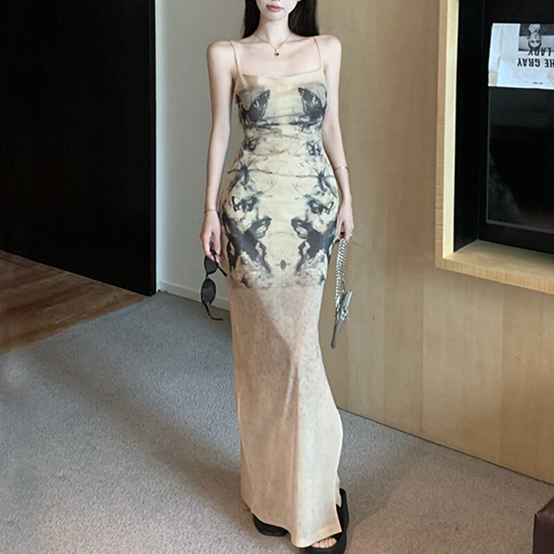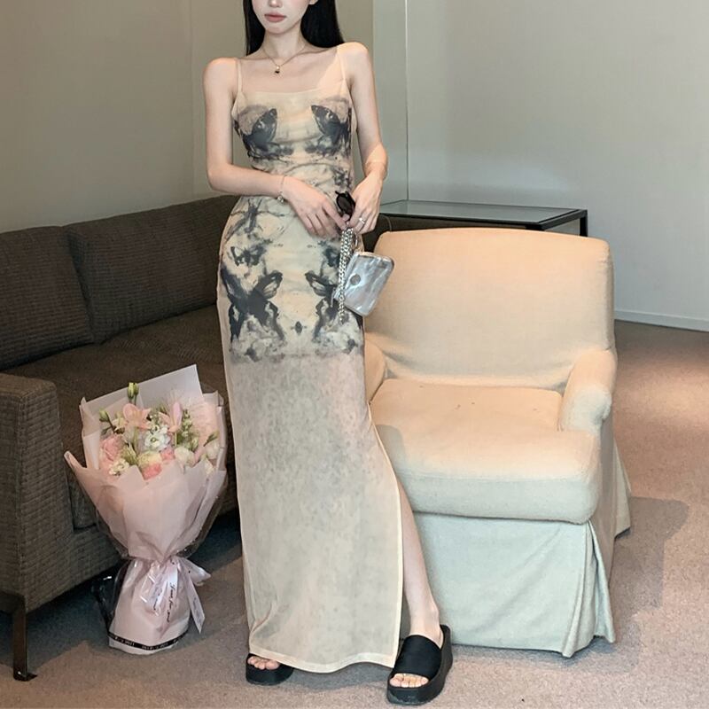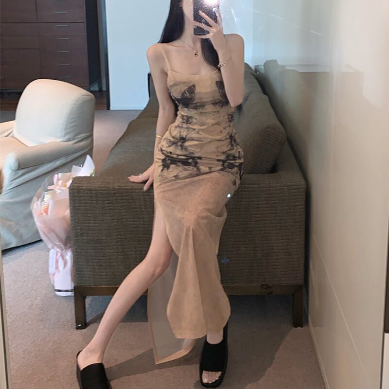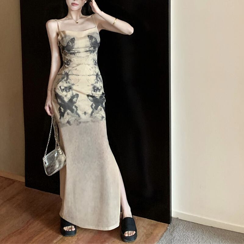 ワンピース セクシー サイドスリット バタフライ 吊りワンピース ライトブラウン S M L