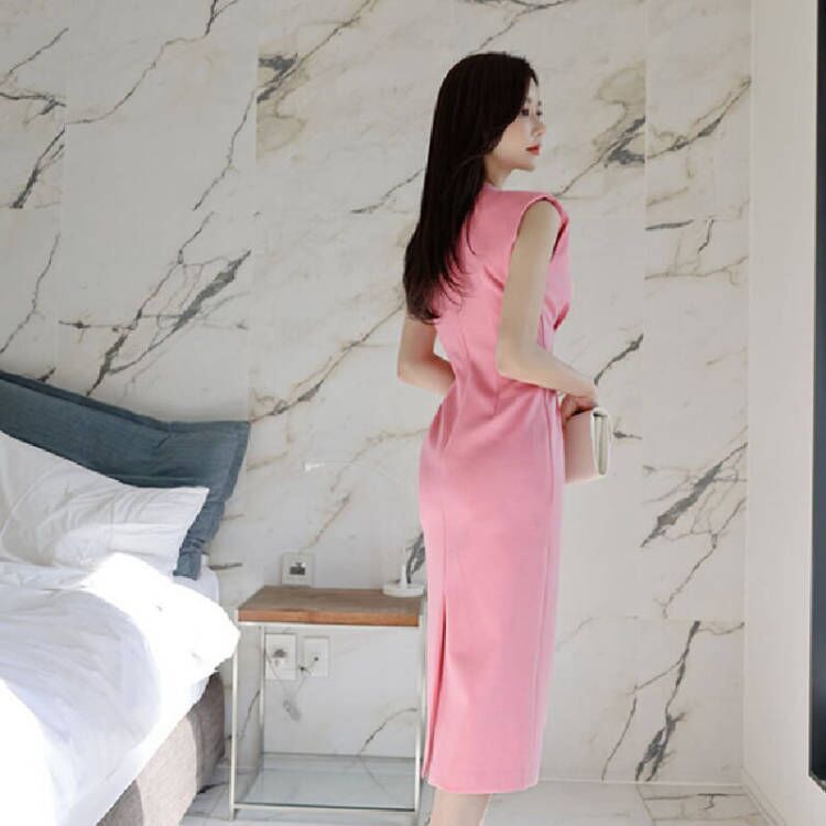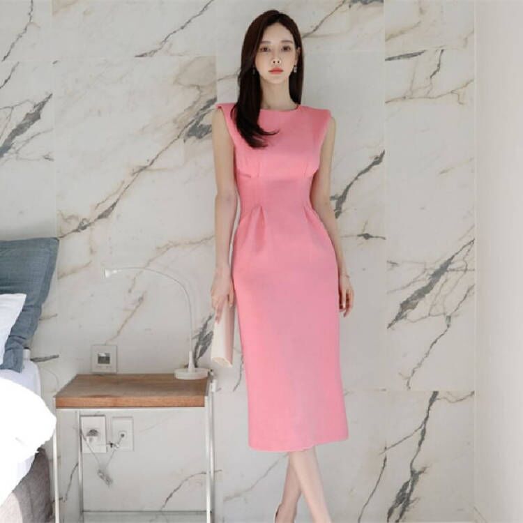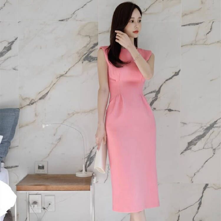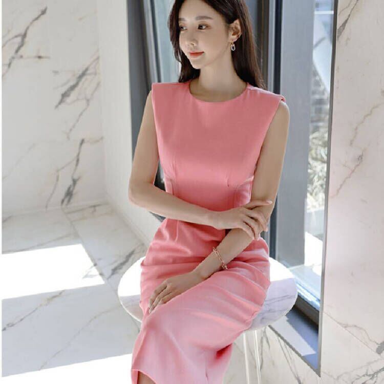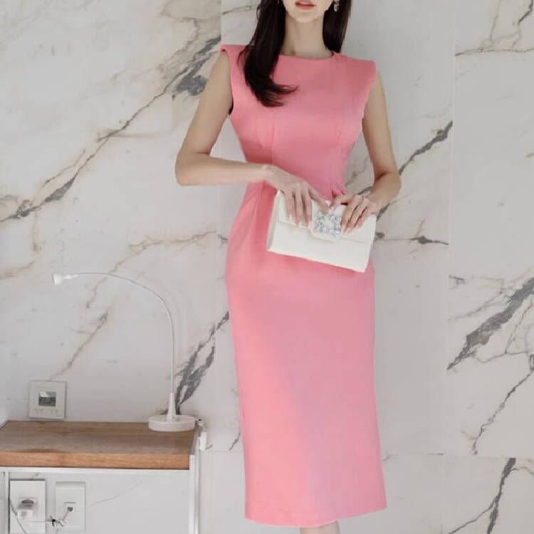 ワンピース ラウンドネック ノースリーブ OL/フォーマル 無地 ピンク S M L XL