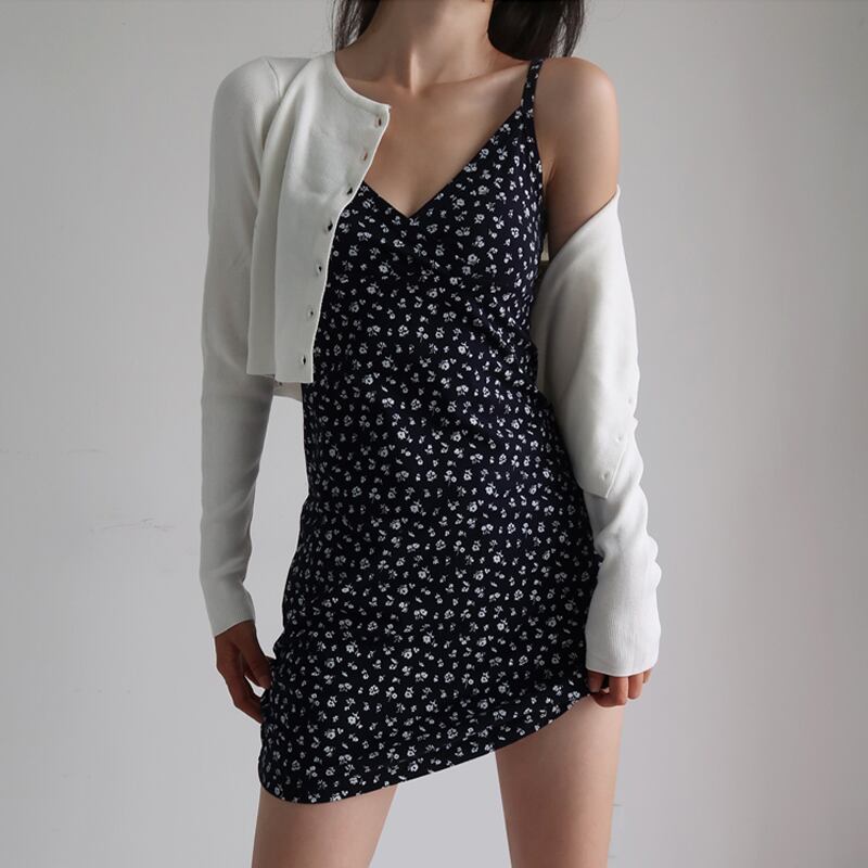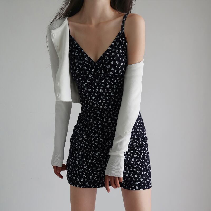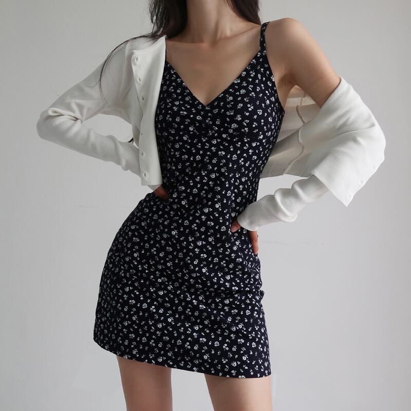 【French Romanceシリーズ】ワンピース セクシー フランス風 花柄 吊りワンピース ネイビー S M L