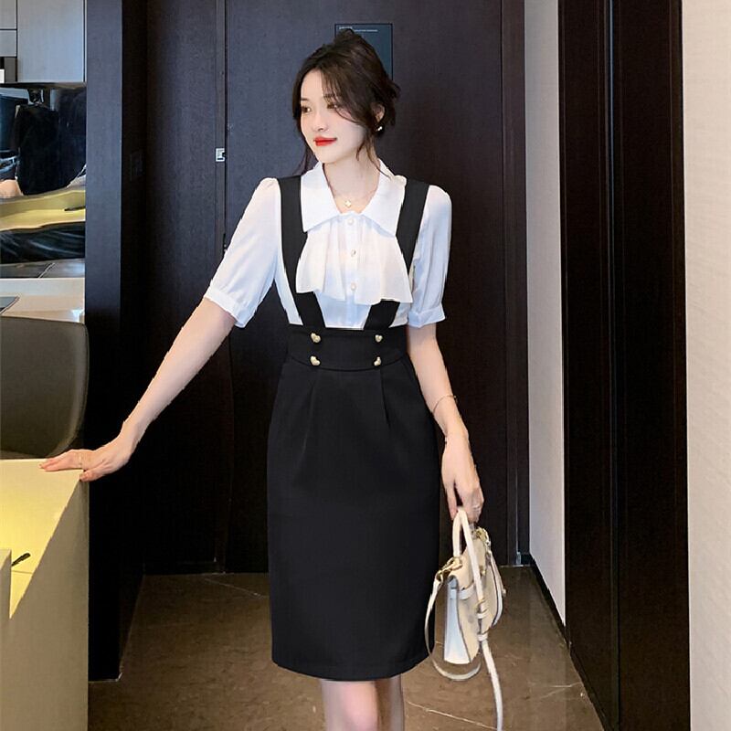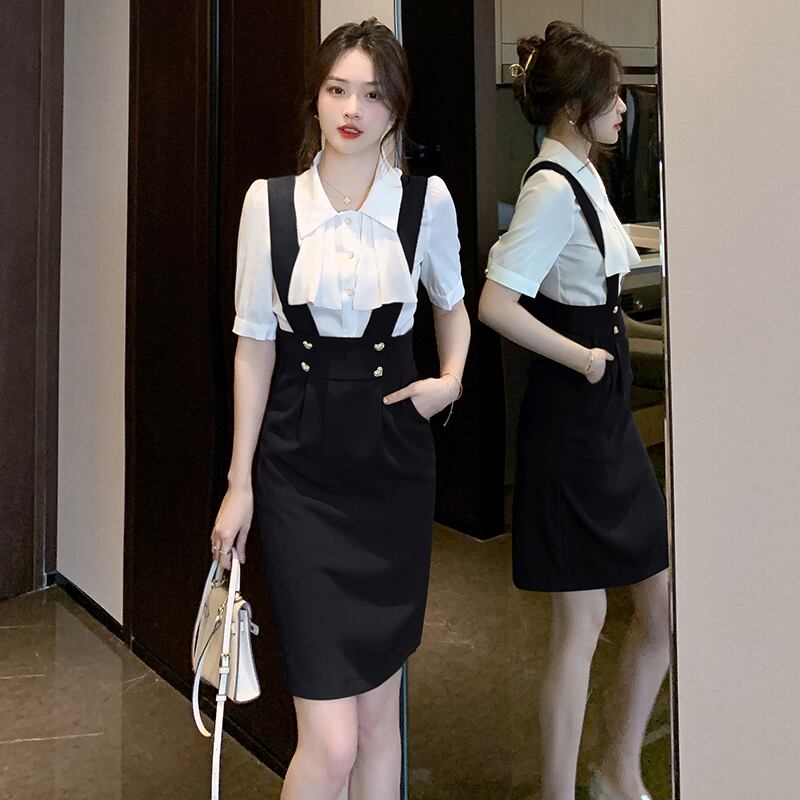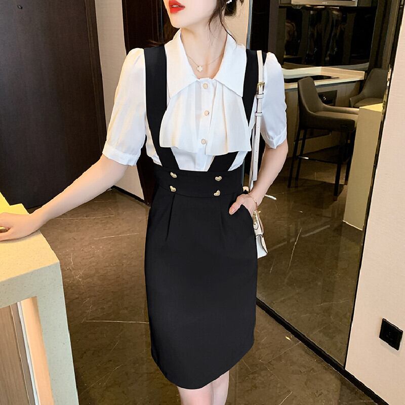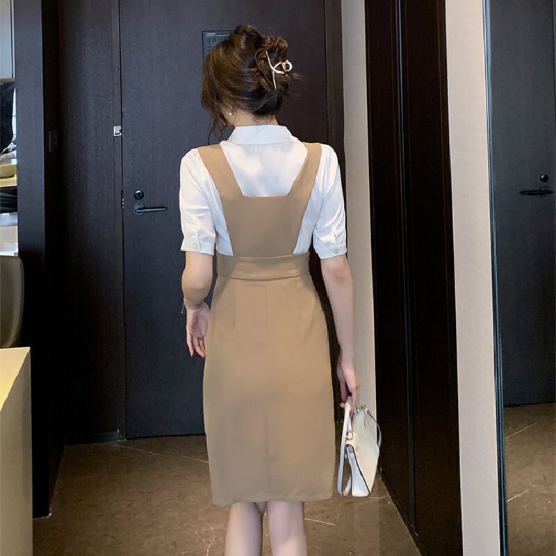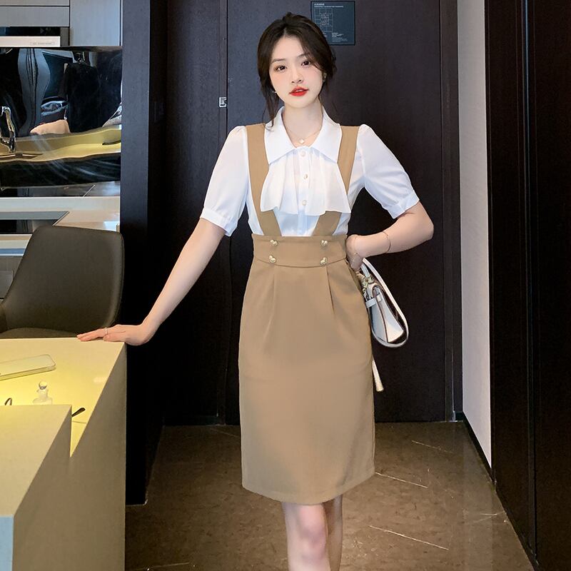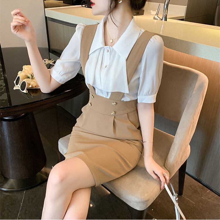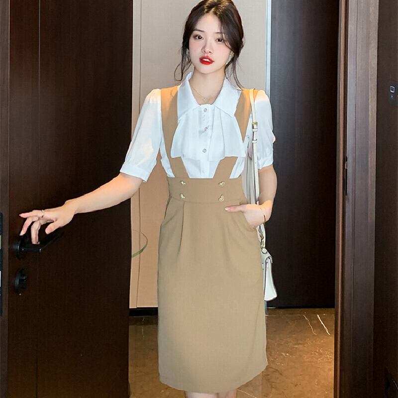 セットアップ 2色展開トップス+ストラップドレス 大きいサイズ 通勤 ブラウン ブラック S M L XL 2XL