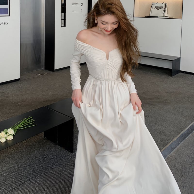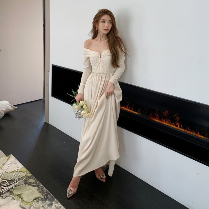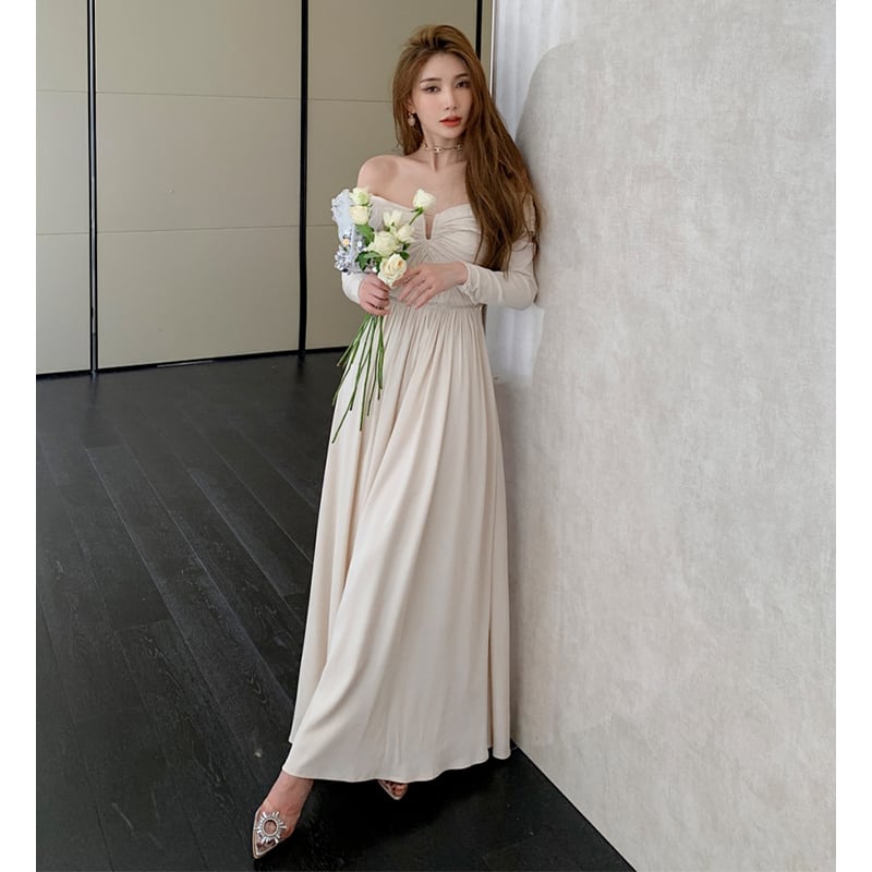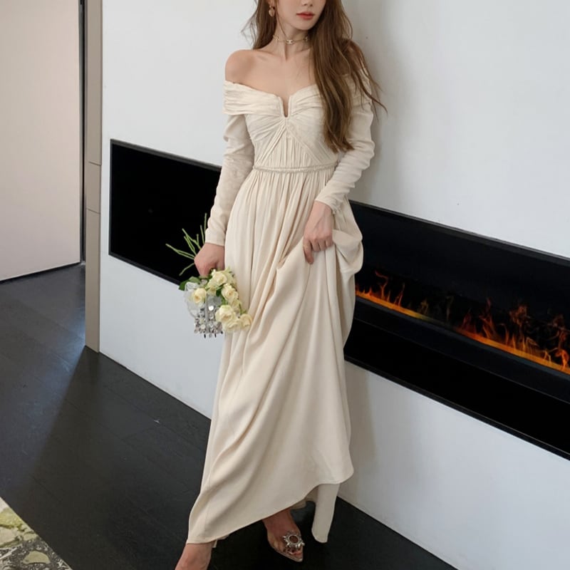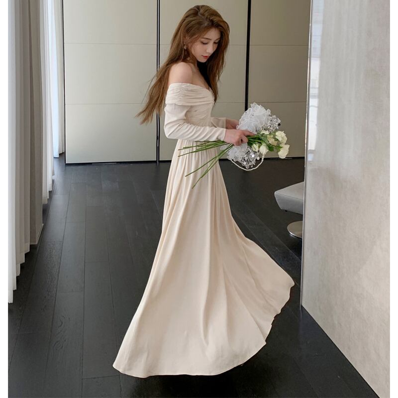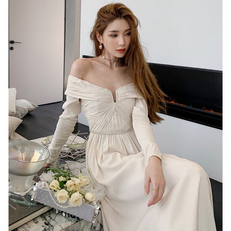 【Airi Styleシリーズ】ワンピース セクシー パーティー ボートネック ロング丈 ベージュ S M L XL