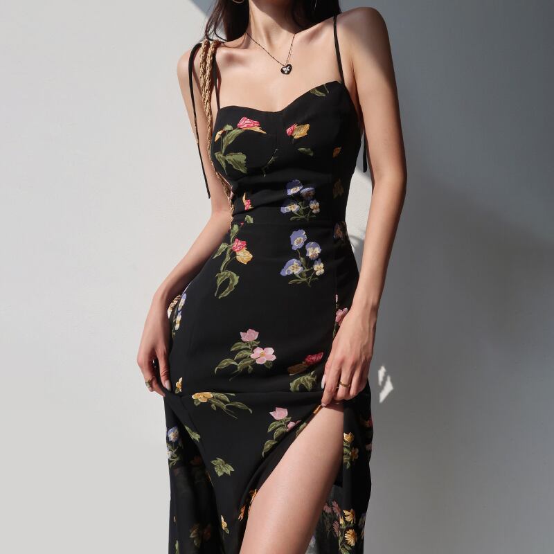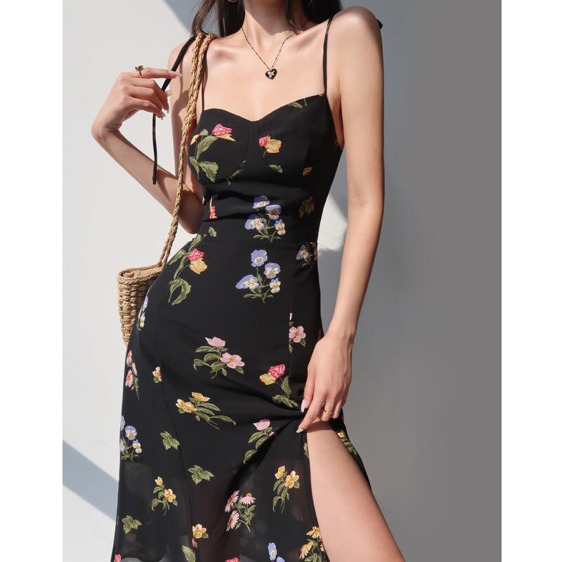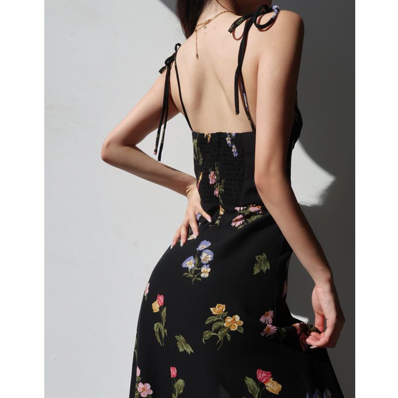 【French Romanceシリーズ】ワンピース セクシー フランス風 花柄 シフォン ロング丈 吊りワンピース ブラック S M L