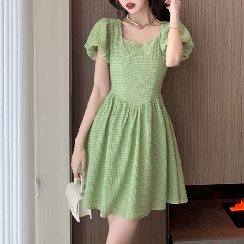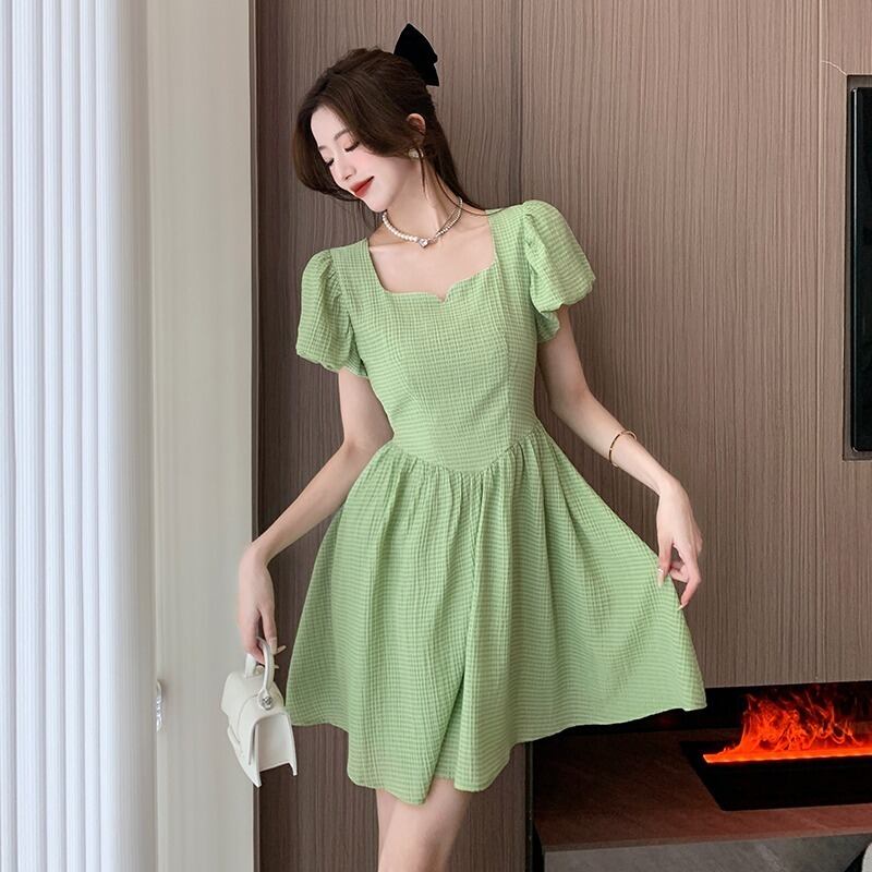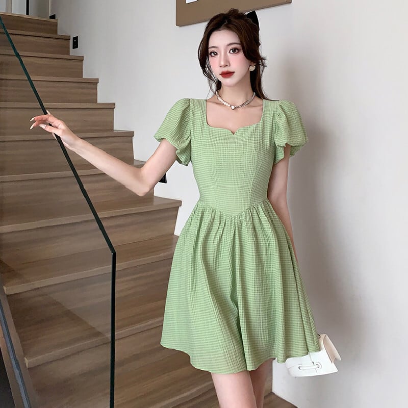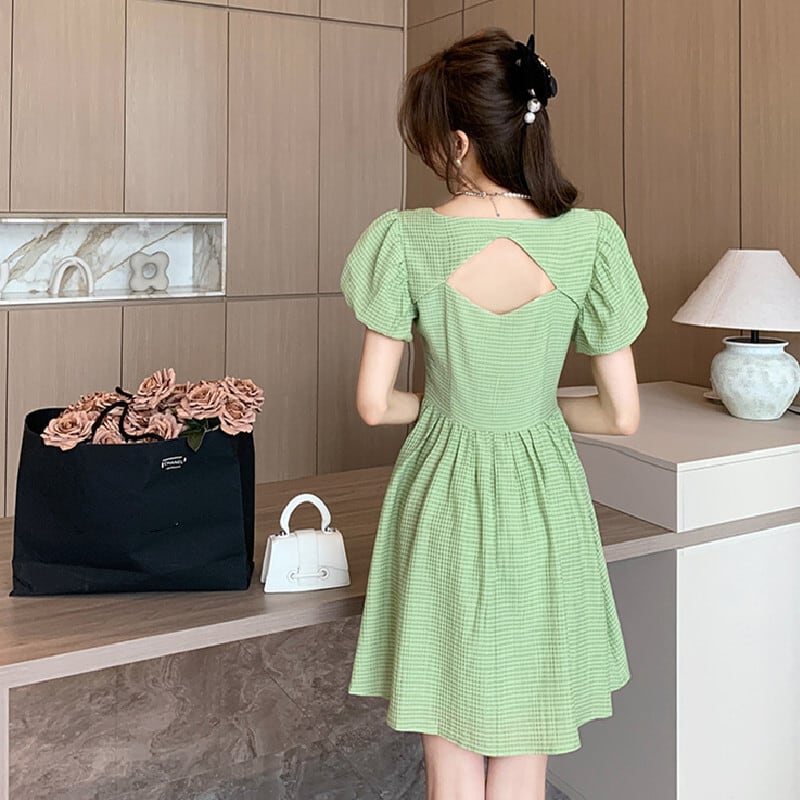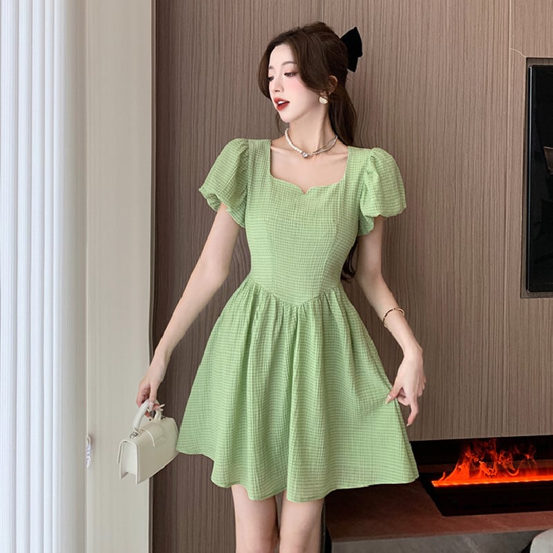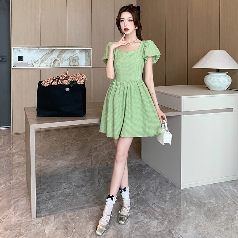 【CHERRYシリーズ】ワンピース パフスリーブ 緑 Aライン 無地 グリーン S M L XL