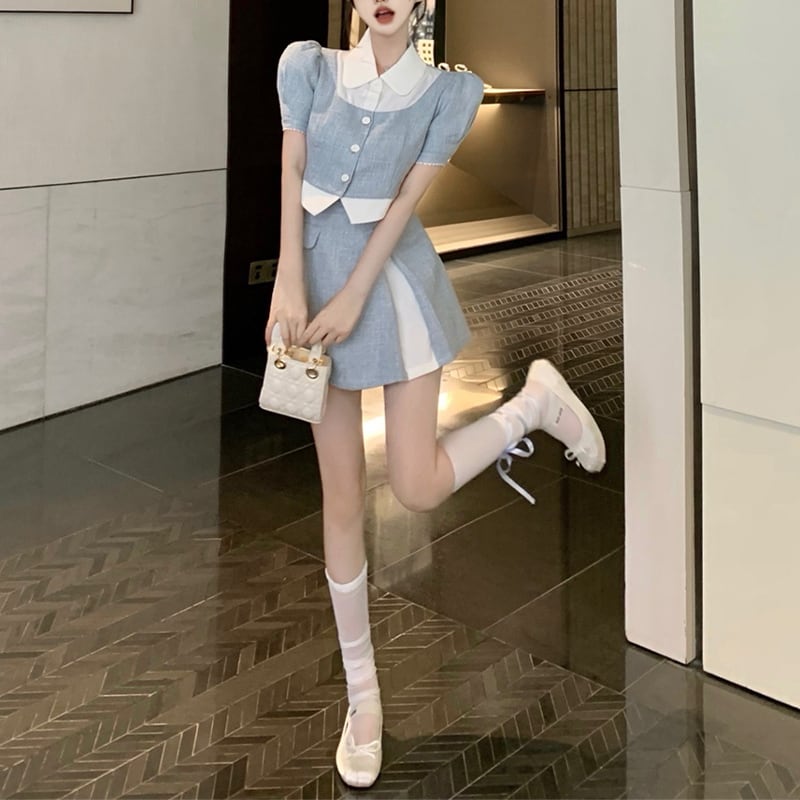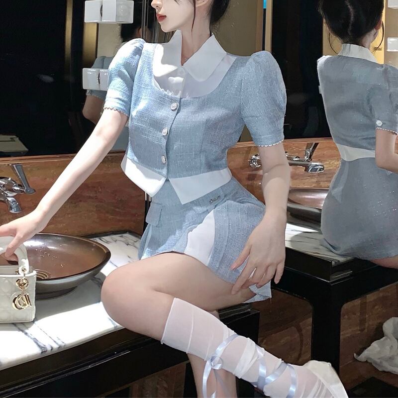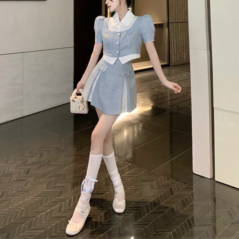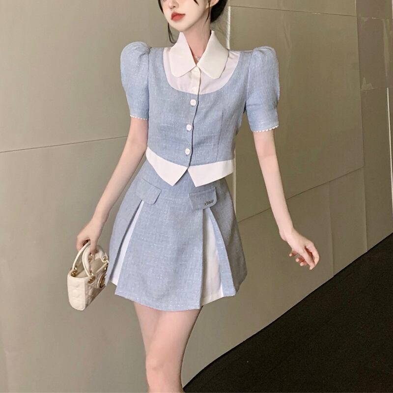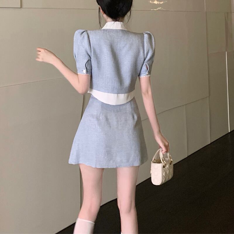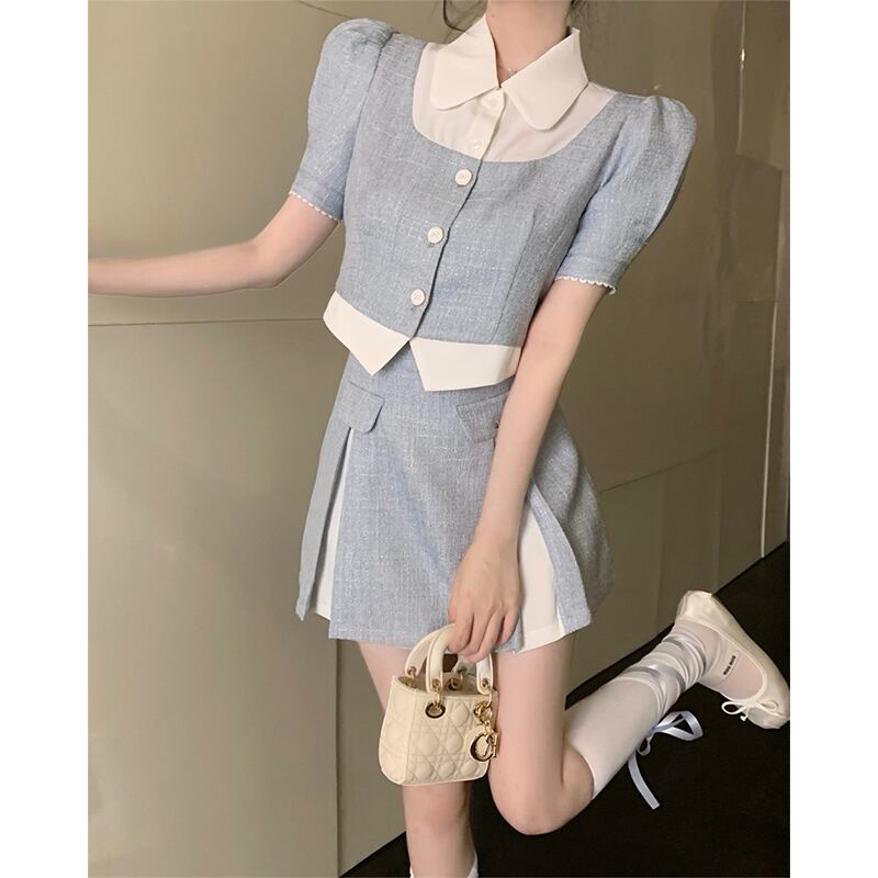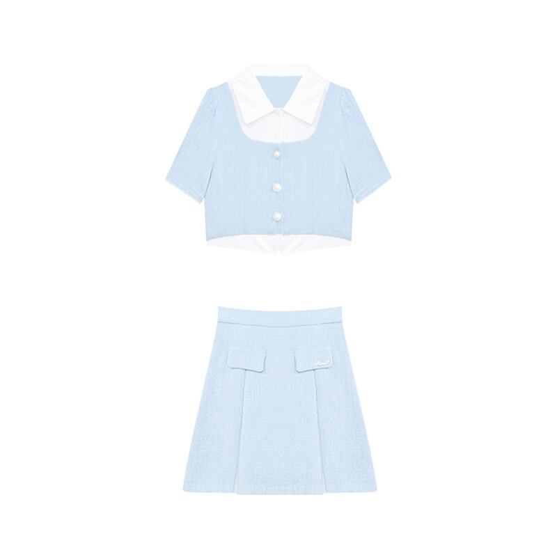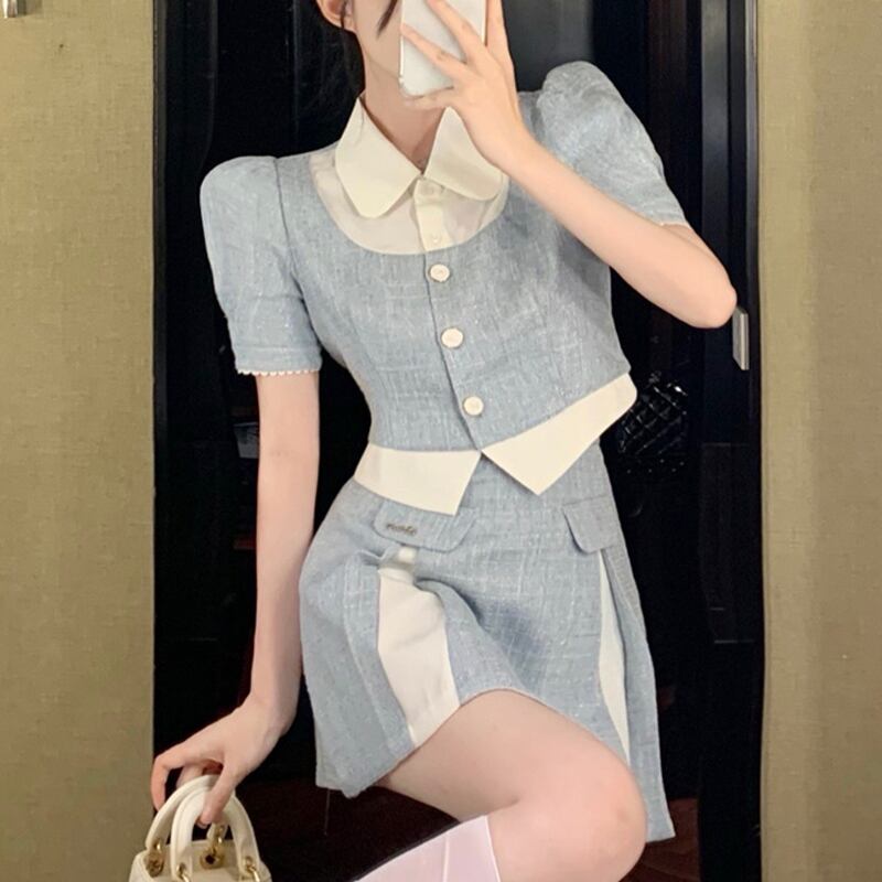 セットアップ OL/通勤 デザイン感 かわいい 切り替え トップス+スカート ブルー S M L