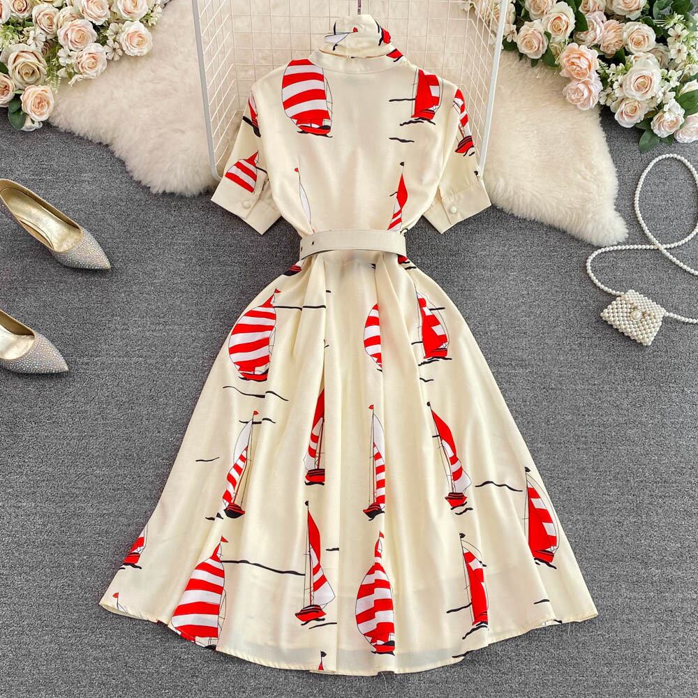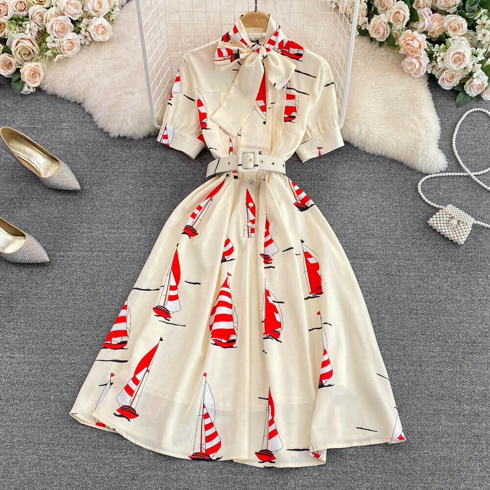 ワンピース プリント Aライン 大きいサイズ 気質満点 レトロ ベージュ S M L XL 2XL
