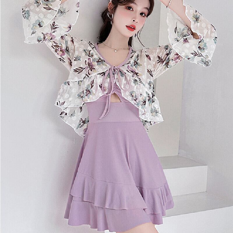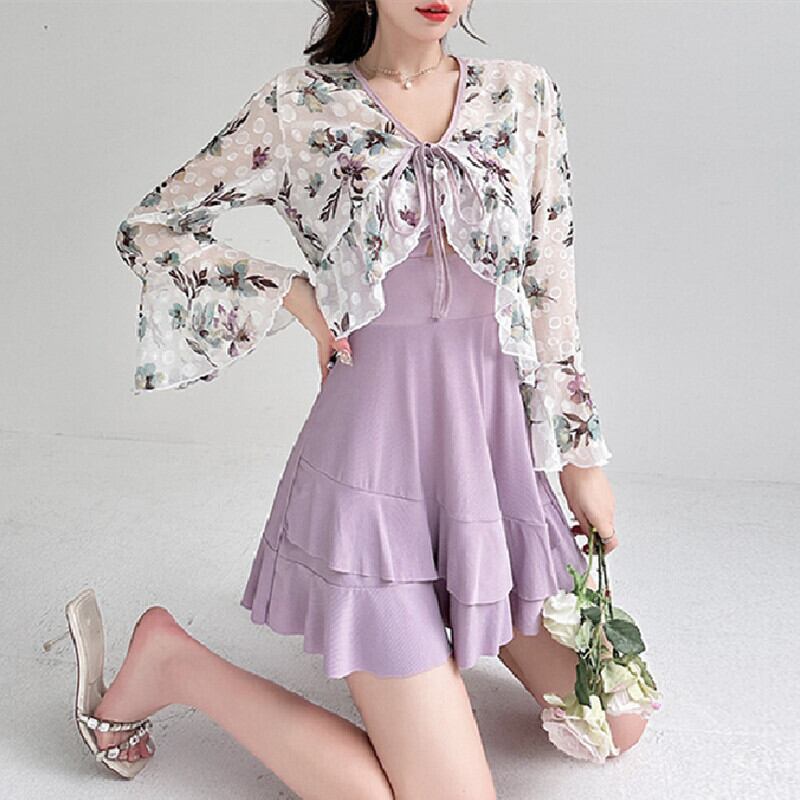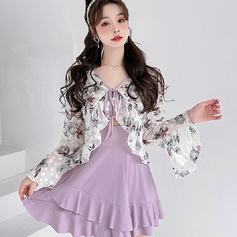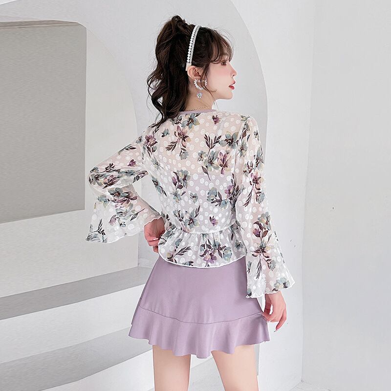 水着 2点セット オーバーウエア付き ペプラム 花柄 パープル M L XL