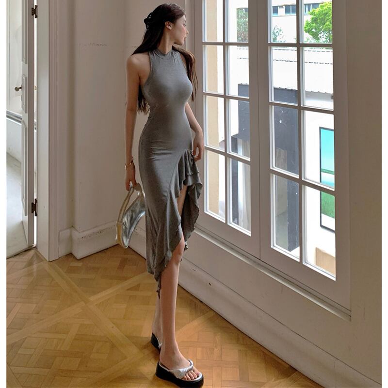 ワンピース セクシー 韓国系 ノースリーブ パプラム ロング丈 ブラック グレー