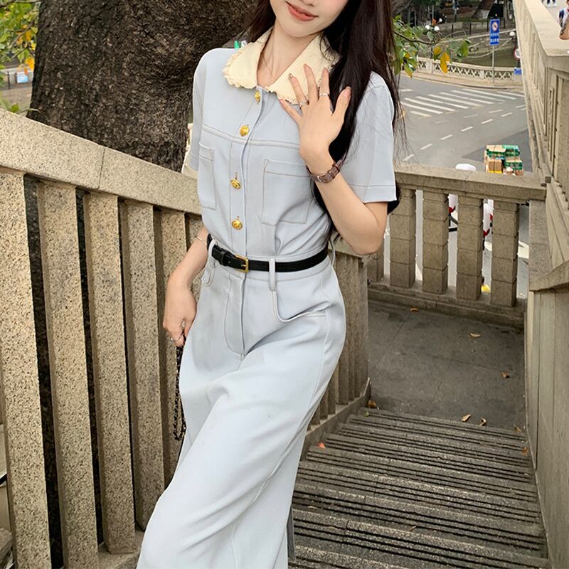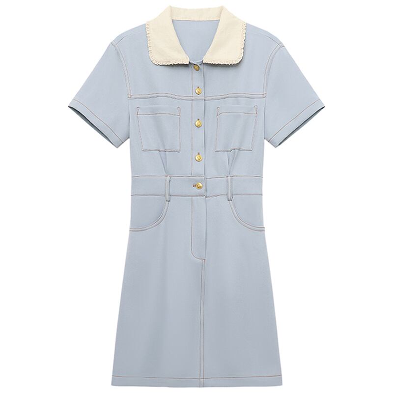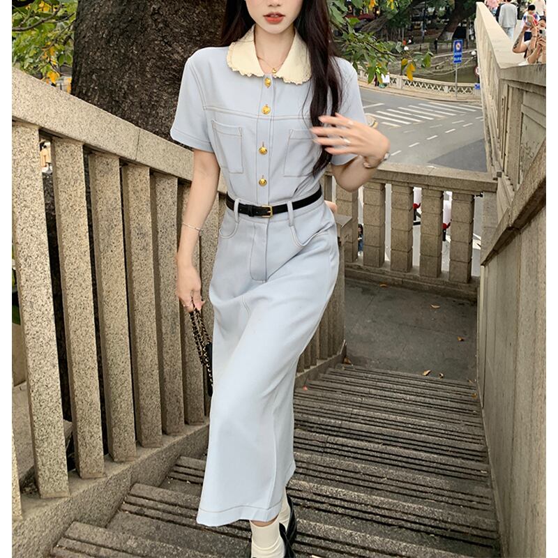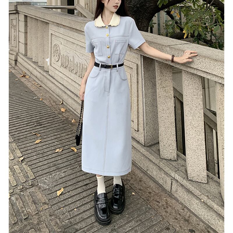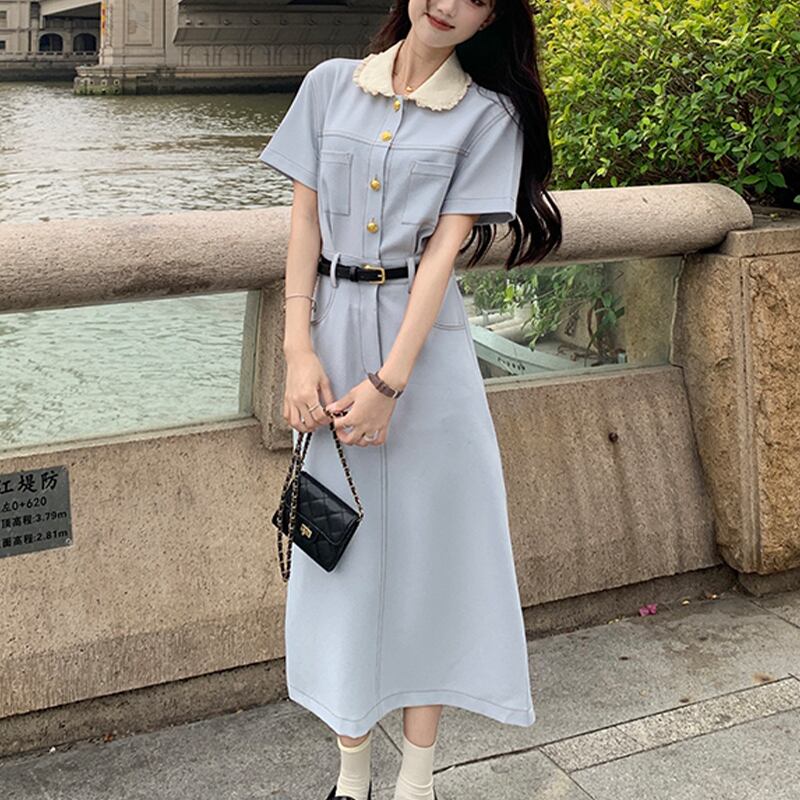 ワンピース OL/通勤 ベルト付き Aライン 清新 学園風 ロング丈 シュート丈 ライトブルー S M L