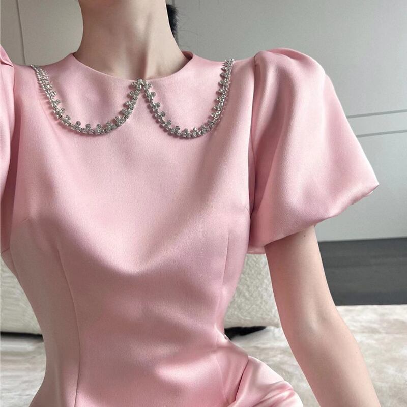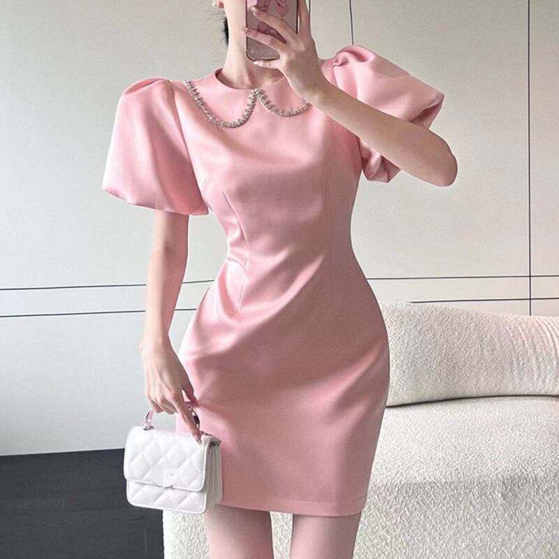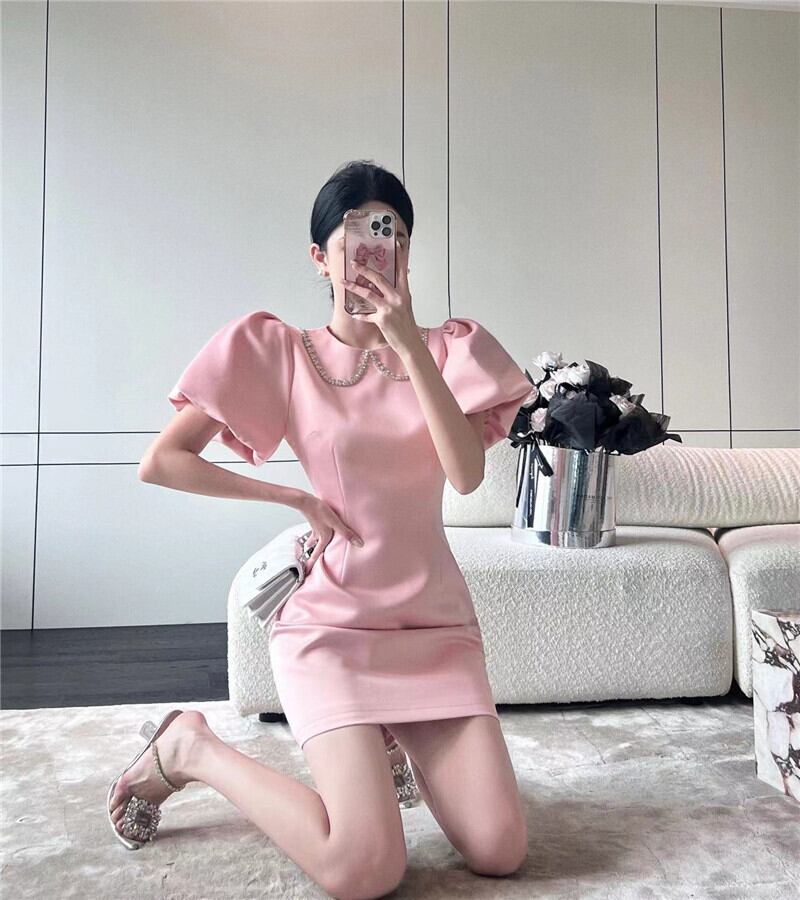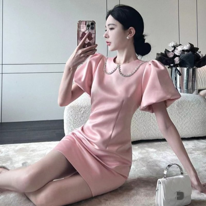 ワンピース セクシー かわいい ラインストーン ランタンスリーブ ピンク S M L