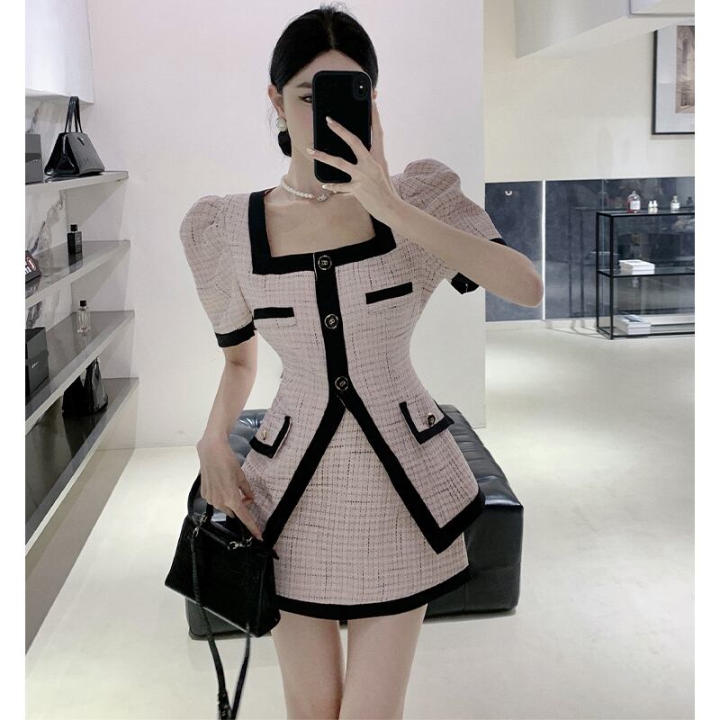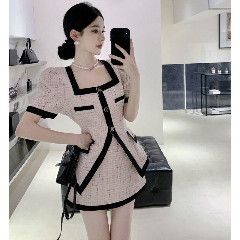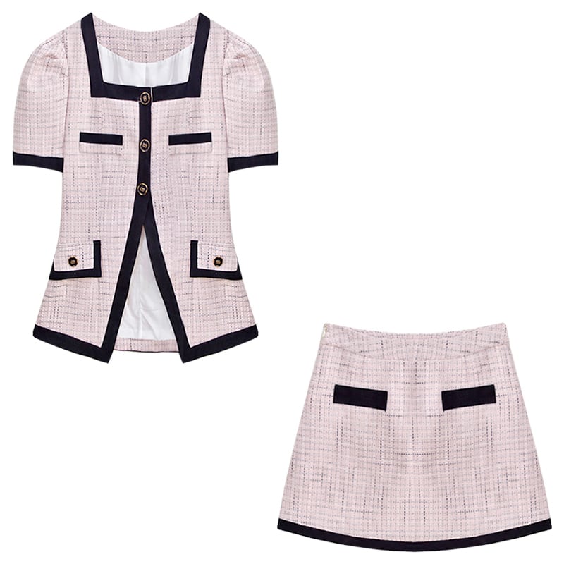 セットアップ 人気爆発中 OL/通勤 スクエアネック トップス+スカート ピンク グリーン S M L