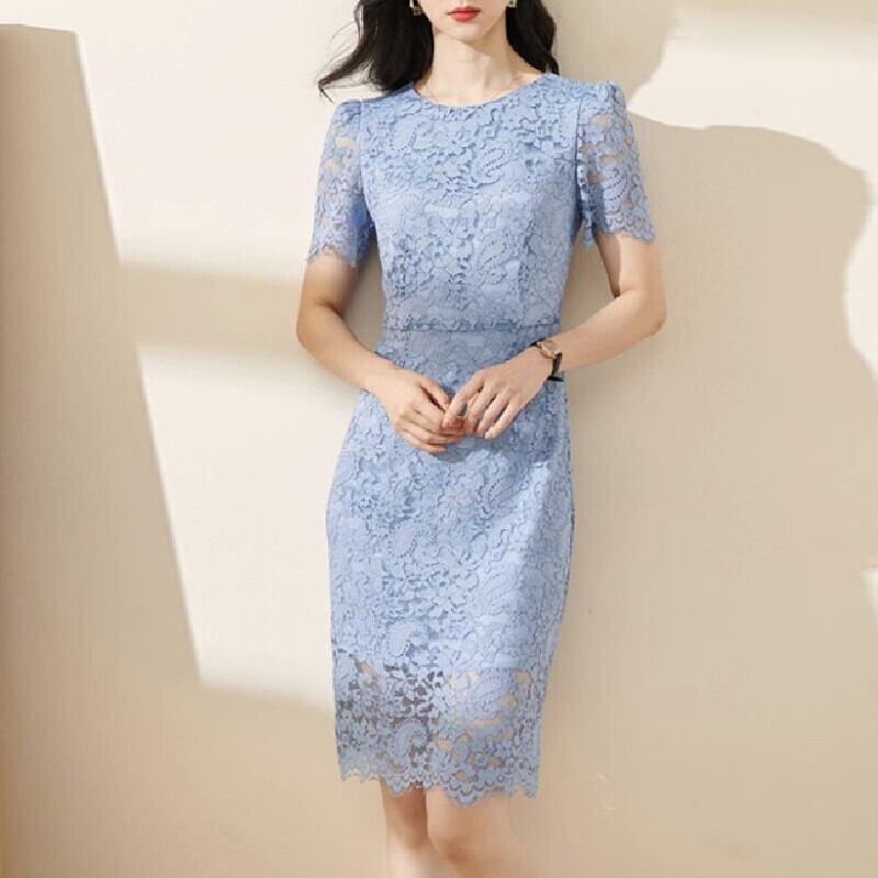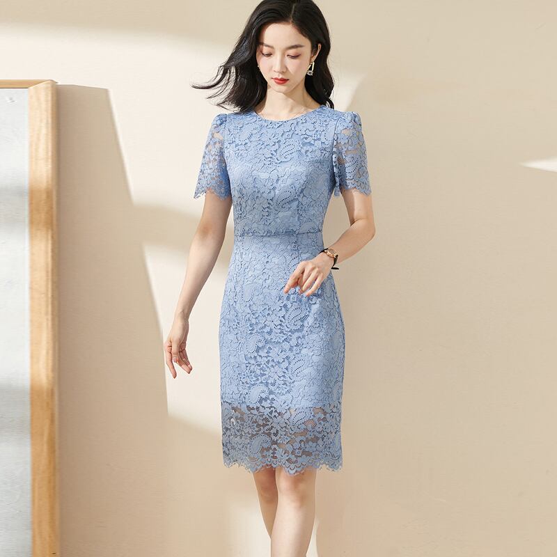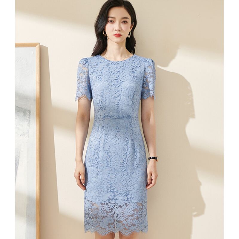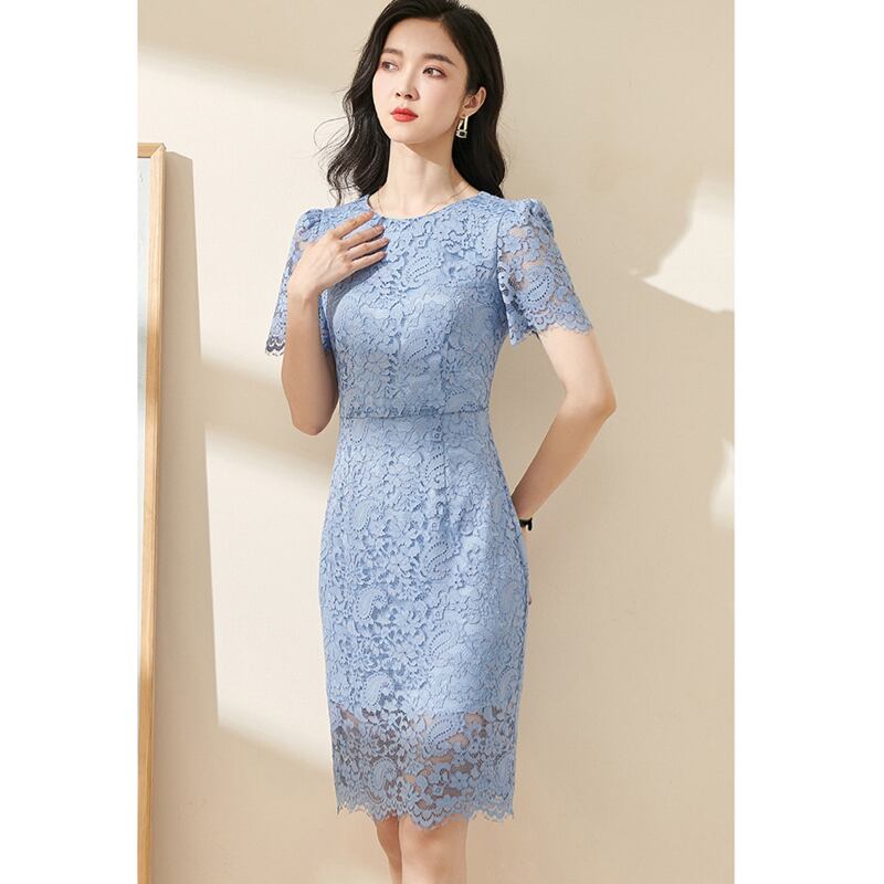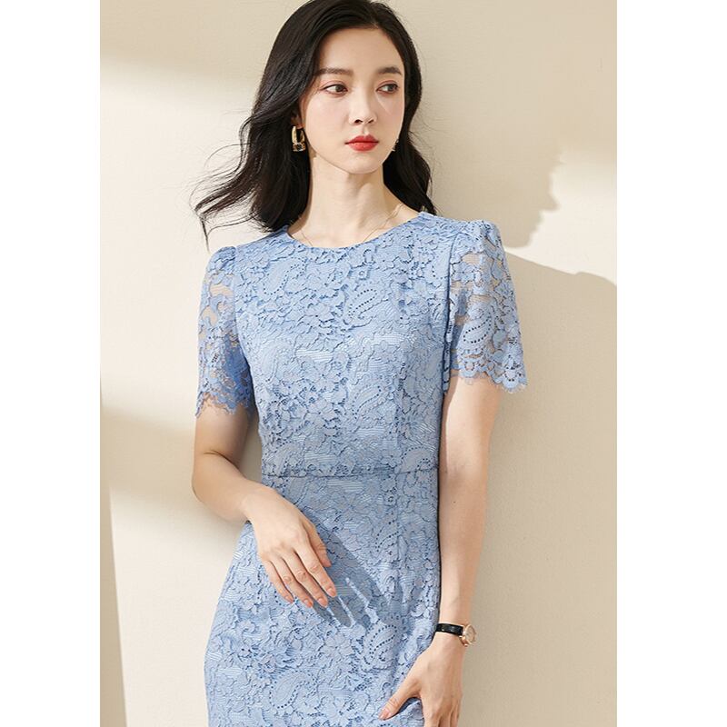 【香特儿シリーズ】ワンピース ラウンドネック 水色 レース フェミニン ブルー S M L XL 2XL