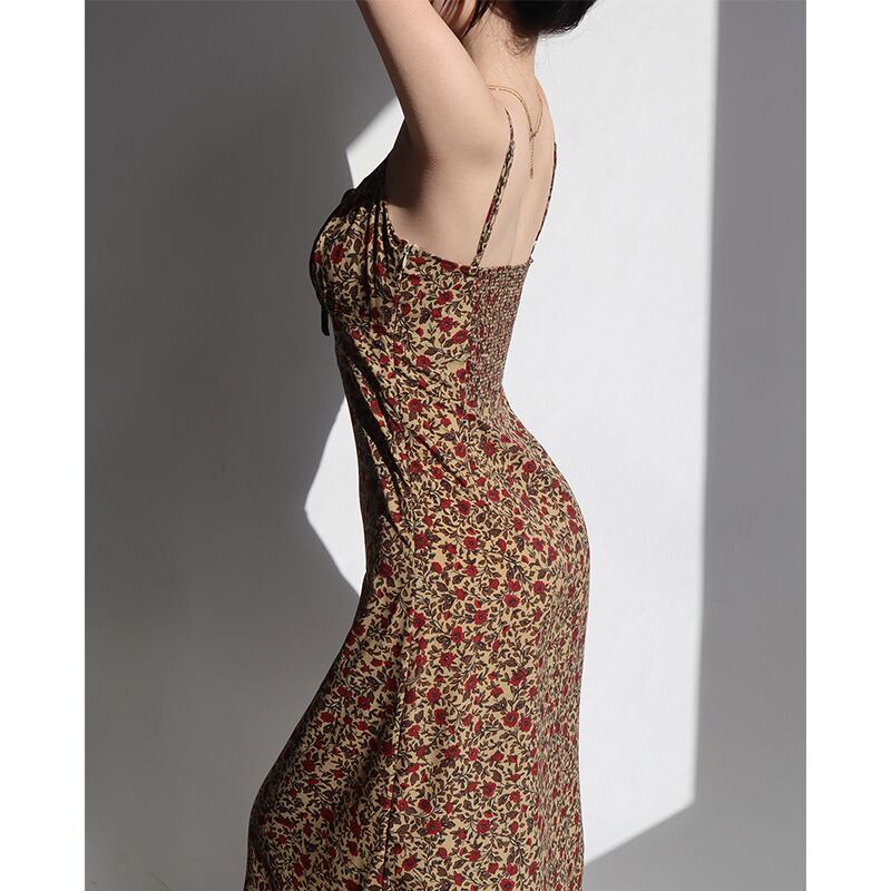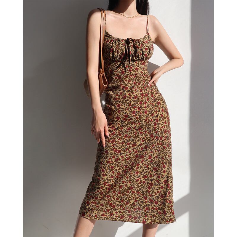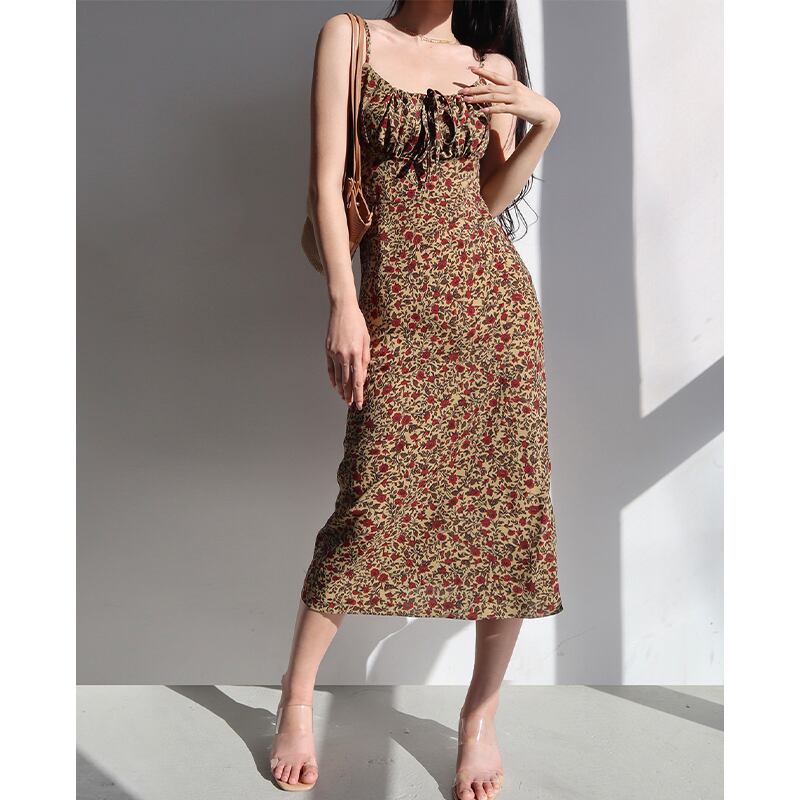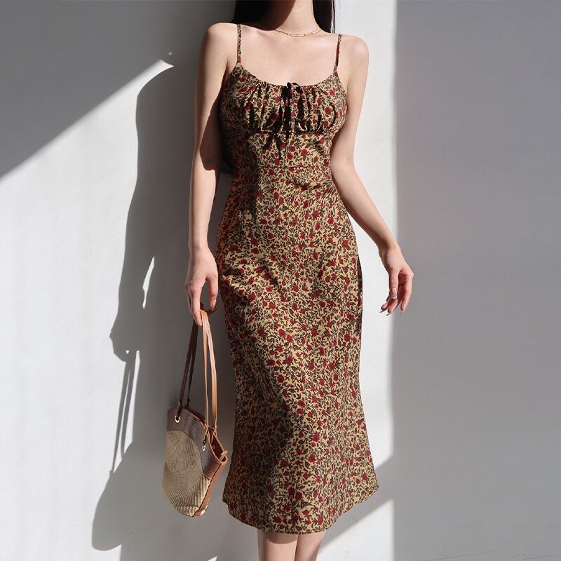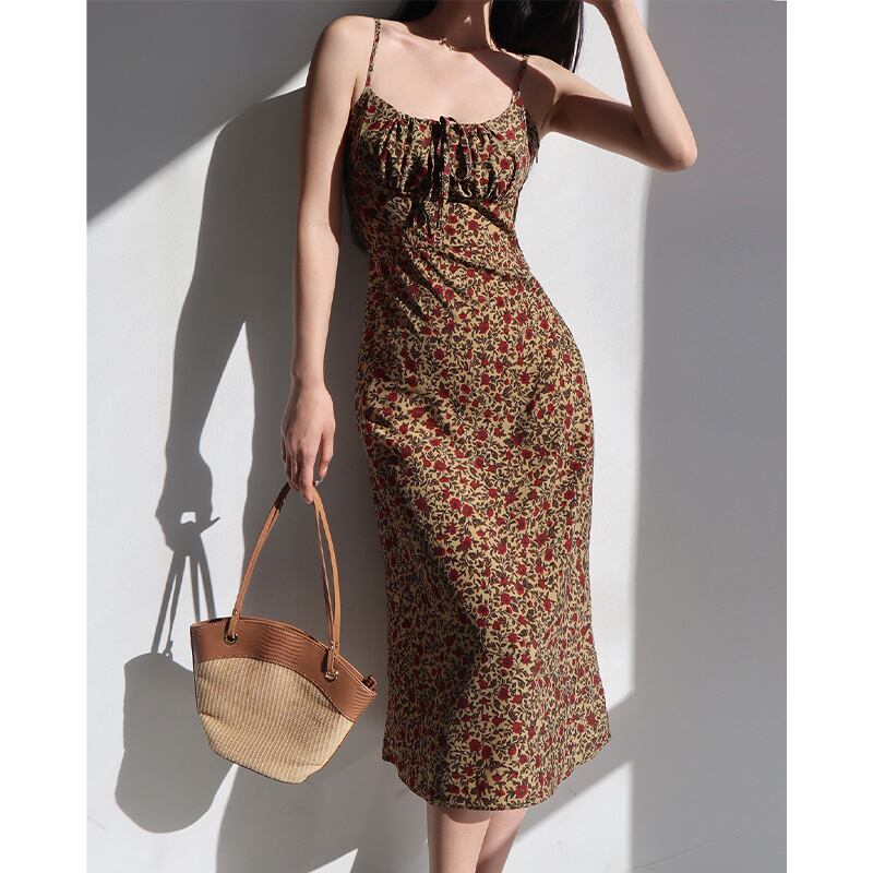 【French Romanceシリーズ】ワンピース セクシー フランス風 花柄 吊りワンピース イエロー+レッド S M L