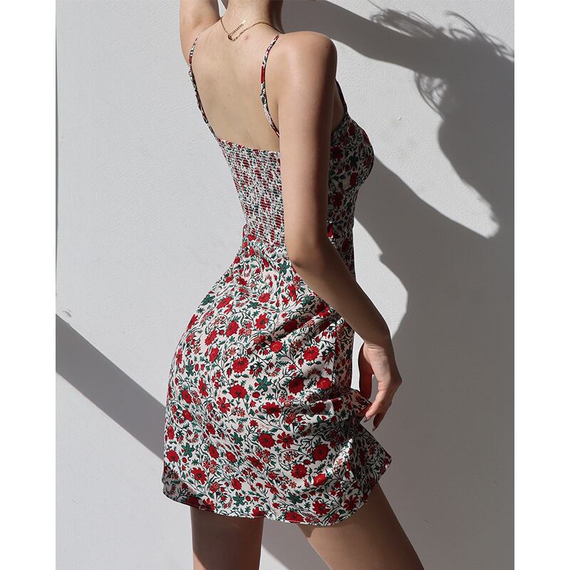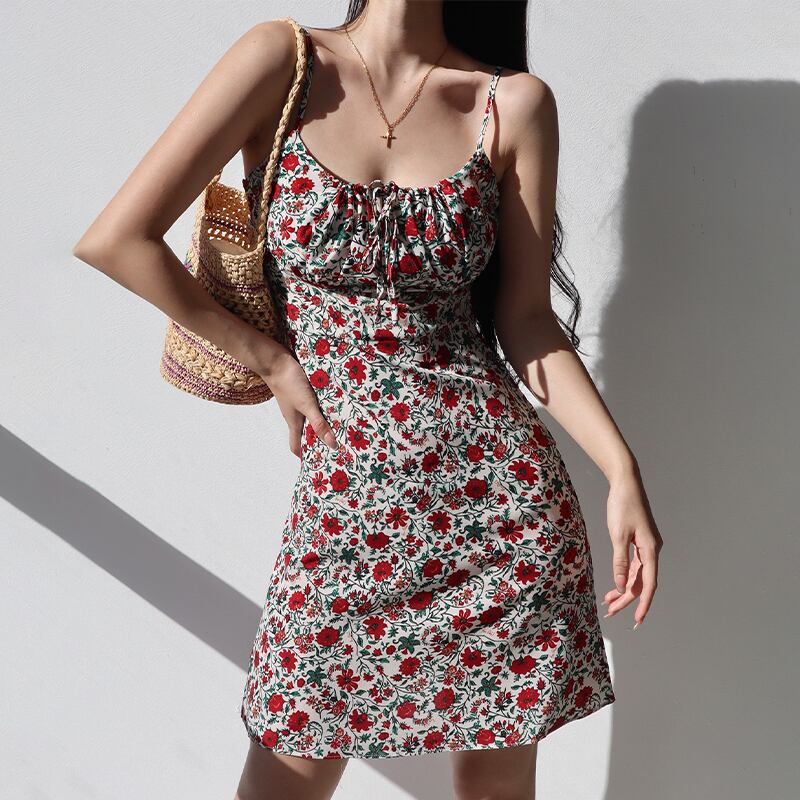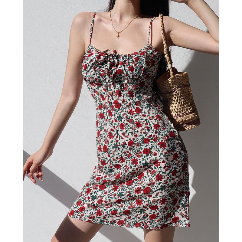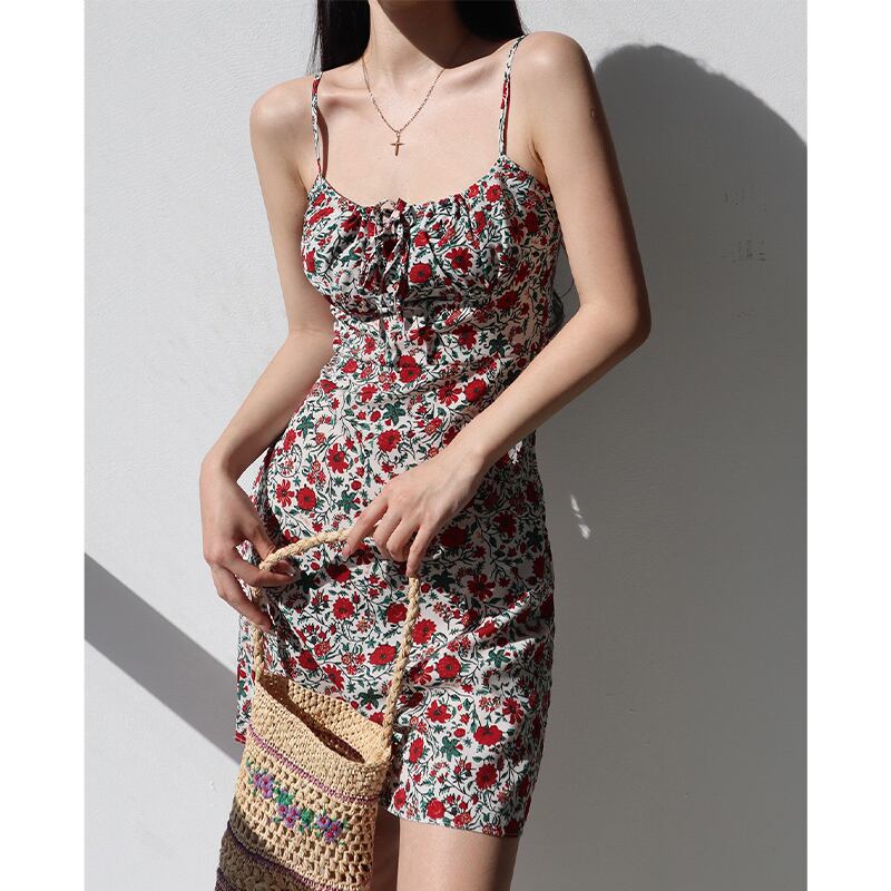 【French Romanceシリーズ】ワンピース 魅力的 セクシー フランス風 花柄 吊りワンピース ホワイト+レッド S M L