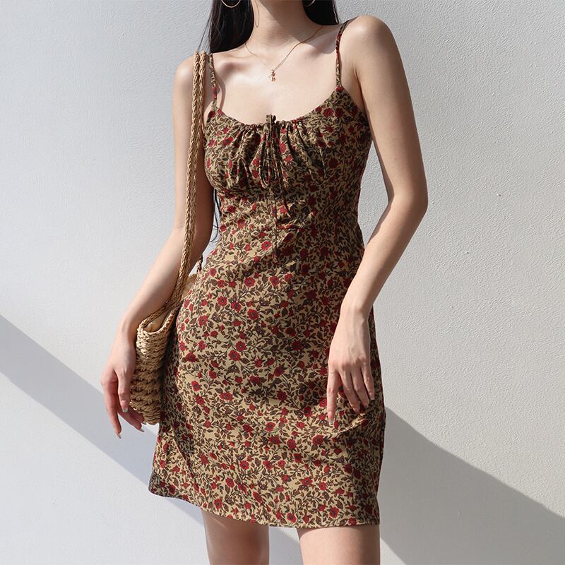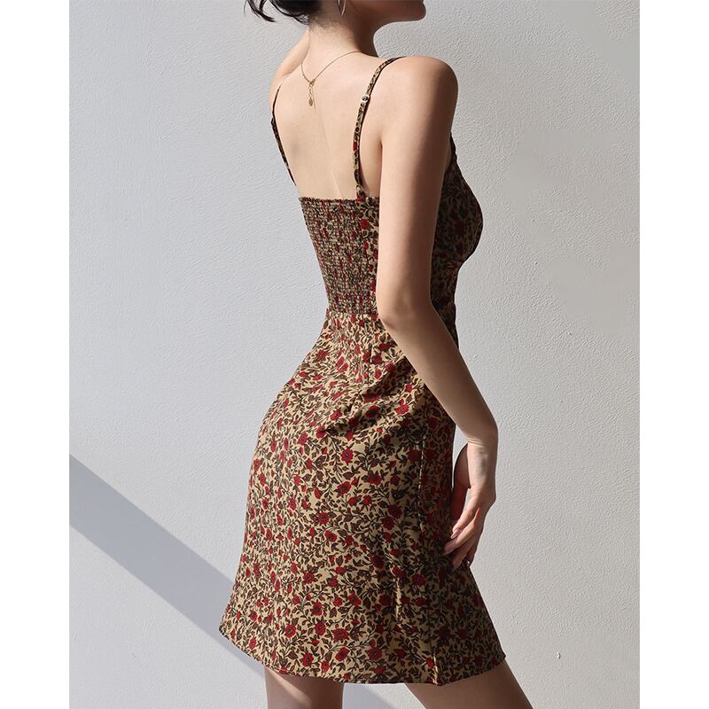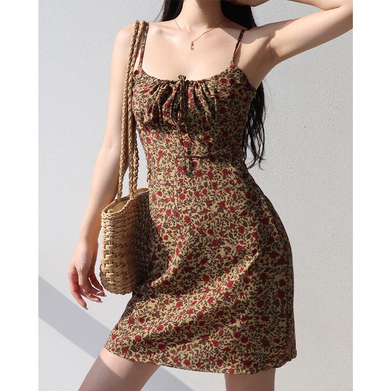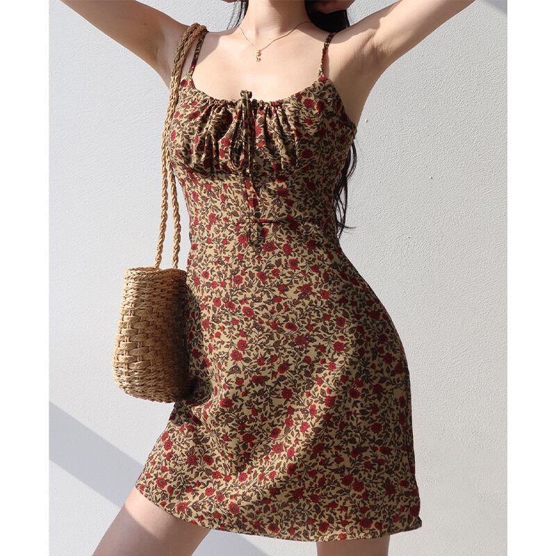 【French Romanceシリーズ】ワンピース 魅力的 セクシー フランス風 花柄 吊りワンピース イエロー+レッド S M L
